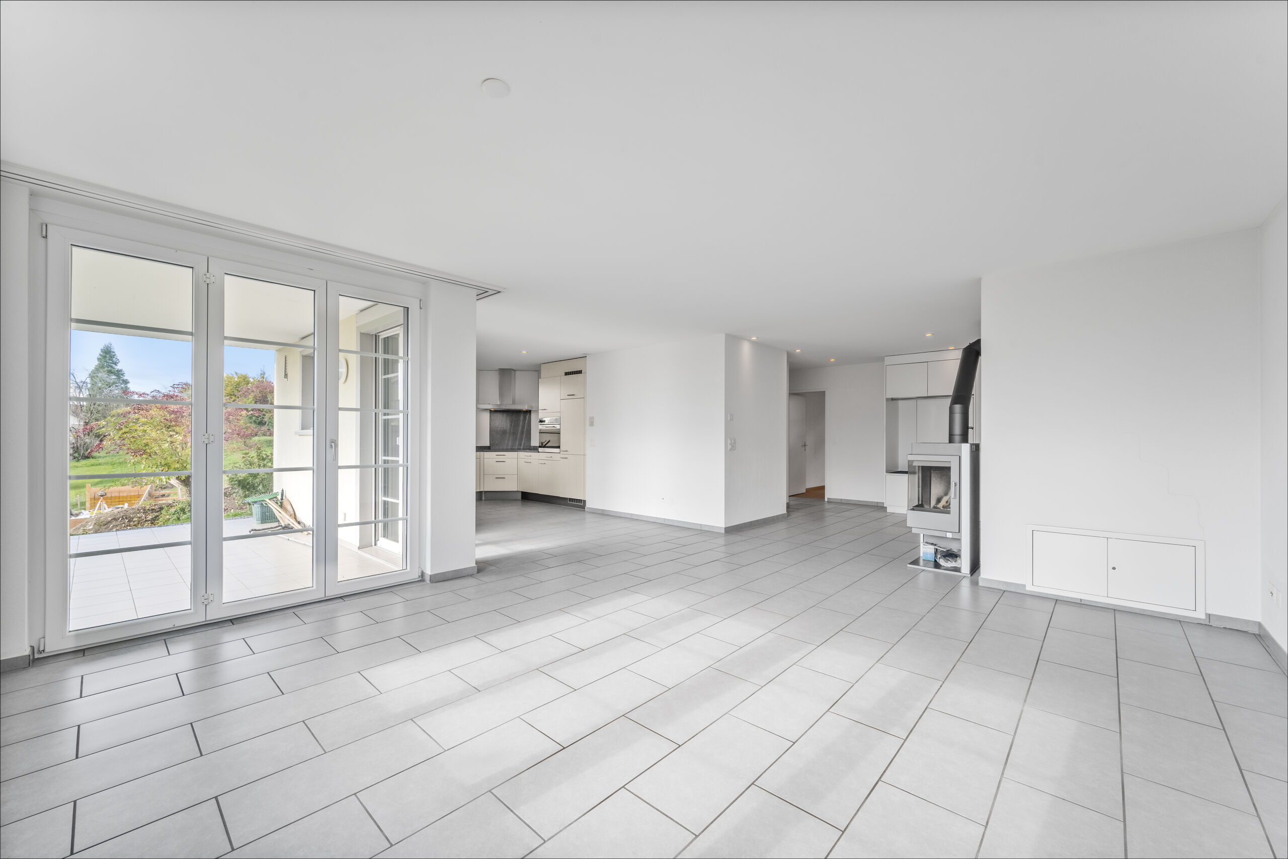 Der helle Wohn- und Essbereich überzeugt mit grosszügigem Grundriss und einem gemütlichen Schwedenofen – perfekt für entspannte Stunden in der kühleren Jahreszeit. Die offene Küche und die hochwertigen Bodenbeläge – Keramikplatten im Wohn-, Koch- und Essbereich sowie Parkett in den Zimmern – schaffen ein wohnliches Ambiente.
