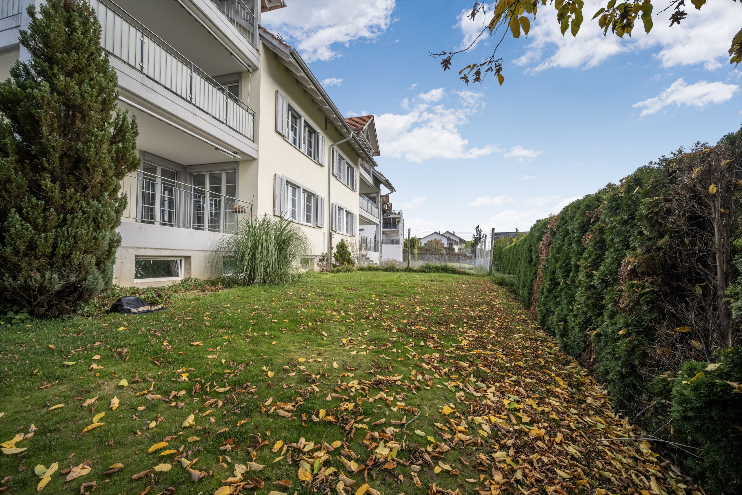 Im Aussenbereich geniessen Sie einen grossen, gedeckten Gartensitzplatz mit angrenzender Grünfläche – ideal zum Entspannen oder für gesellige Momente im Freien. Zudem steht ein Fitnessraum im Haus zur Mitbenutzung zur Verfügung.