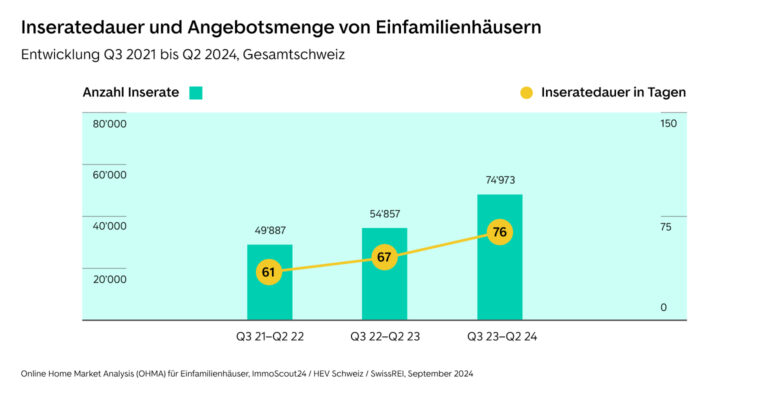 In der beobachteten Periode 2023/24 war ein massiver Zugang der inserierten Einfamilienhäuser gegenüber der Vorjahresperiode mit einem markanten Plus von 36% zu beobachten. In der vergangenen Periode hat es erneut mehr inserierte Einfamilienhäuser gegeben, jedoch in einem tieferen Ausmass (+ 4%). Bei der Insertionsdauer ist schweizweit ebenfalls eine steigende Tendenz zu beobachten, aktuell ist ein Einfamilienhaus durchschnittlich 79 Tage online.