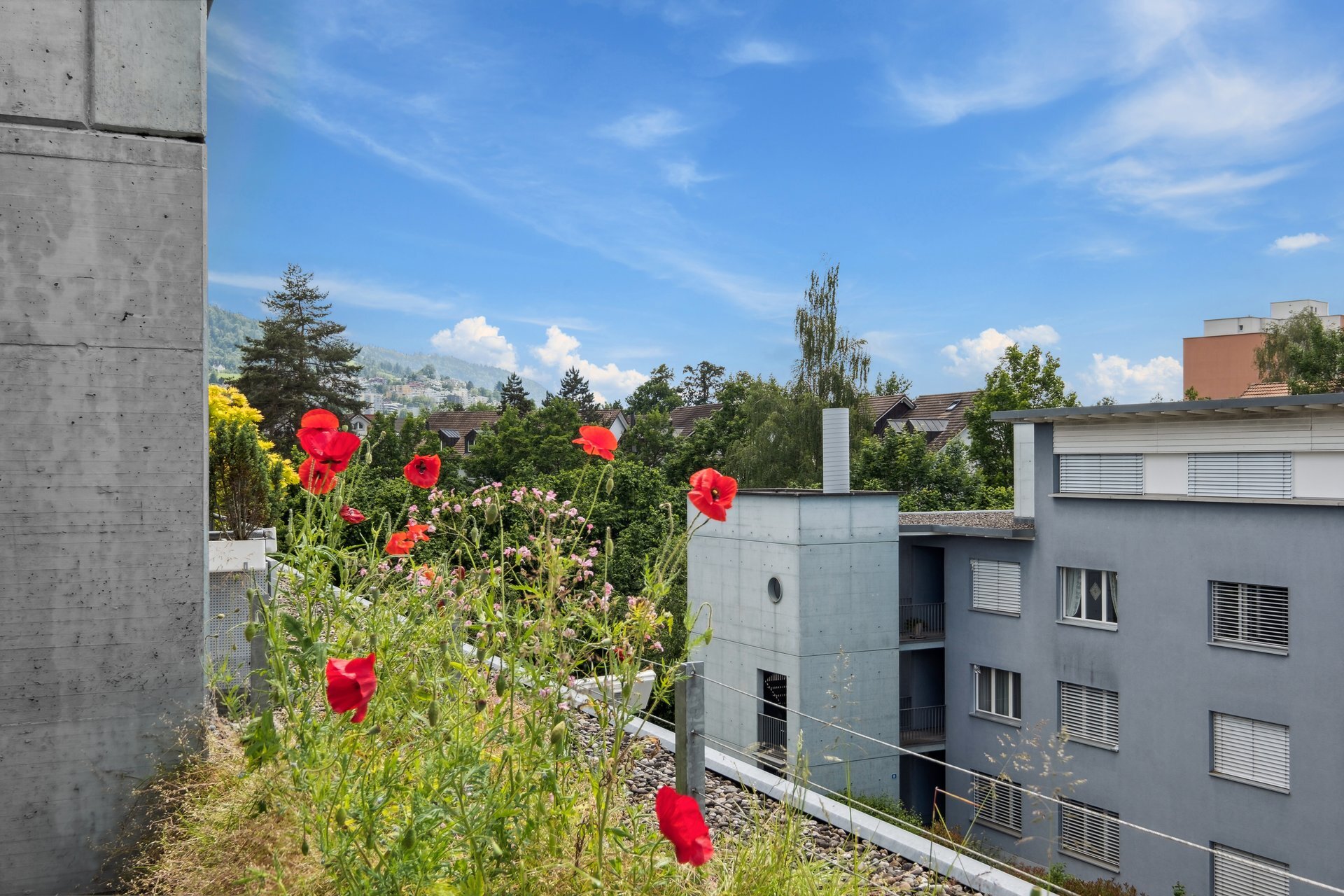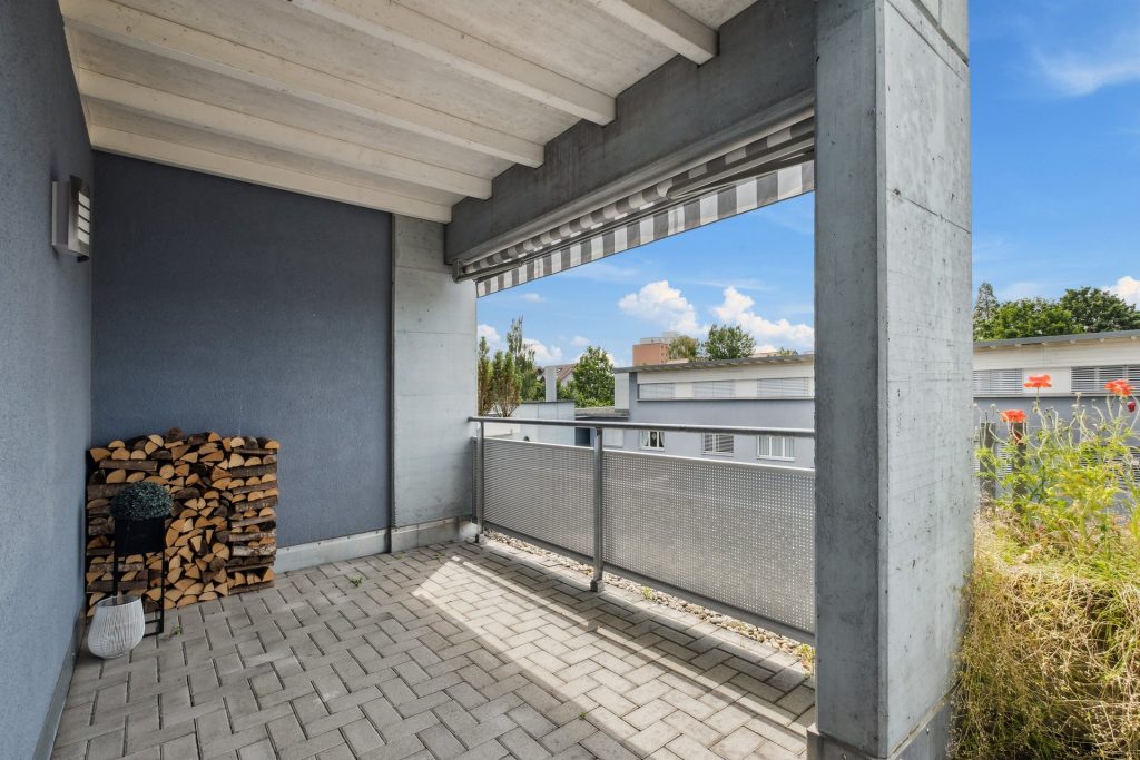 Die rund 50 m² grosse Terrasse, teilweise überdacht und mit Sonnenschirm ausgestattet, eröffnet einen schönen Blick auf die umliegende Bergwelt. Ein überdachter Parkplatz kann dazu erworben werden.