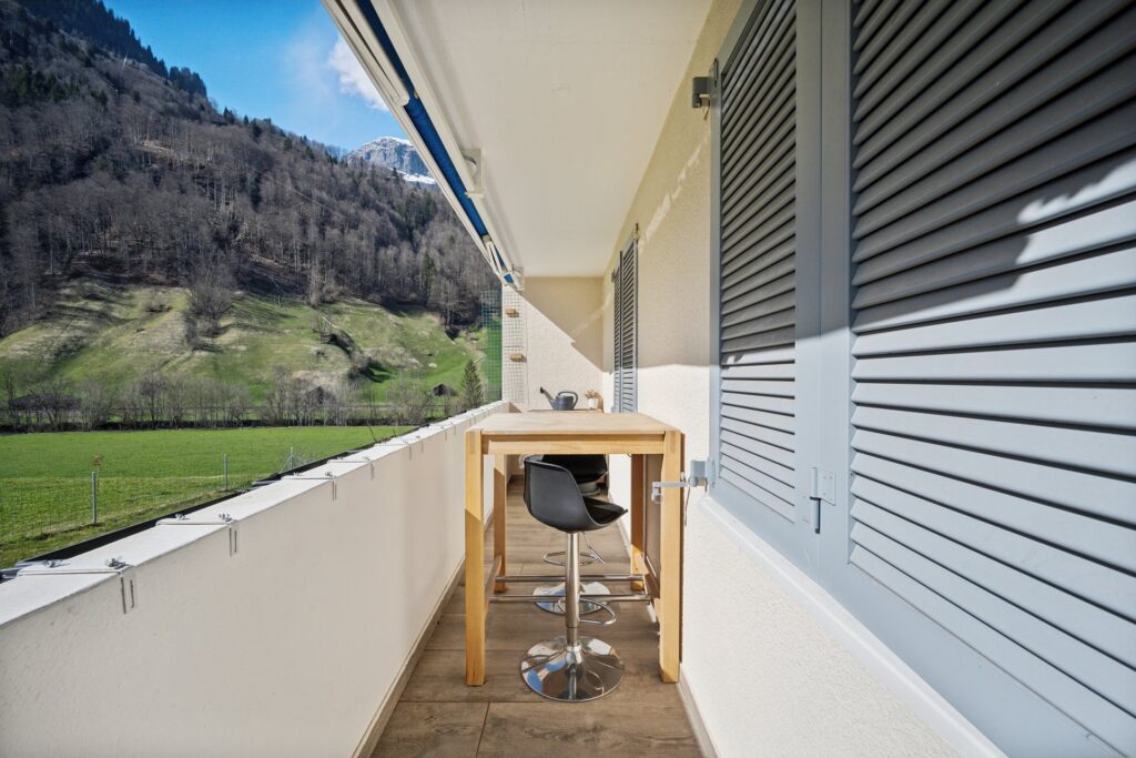 Der gedeckte Balkon eröffnet eine spektakuläre Aussicht auf die umliegende Bergwelt – ein Logenplatz zum Durchatmen. Zusätzlichen Komfort schaffen ein abschliessbarer Keller, ein Estrich sowie Velo- und Skiabstellplätze im Untergeschoss.