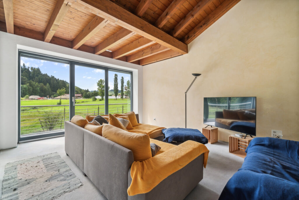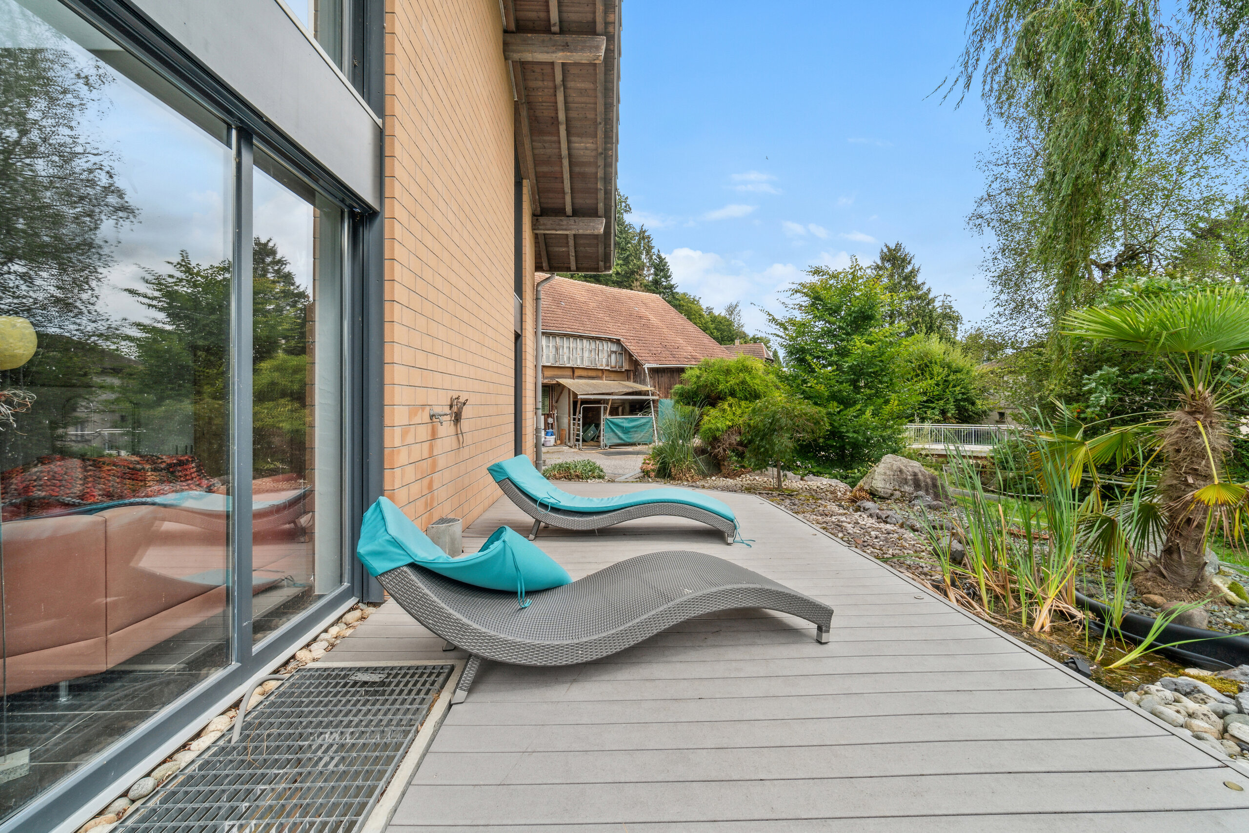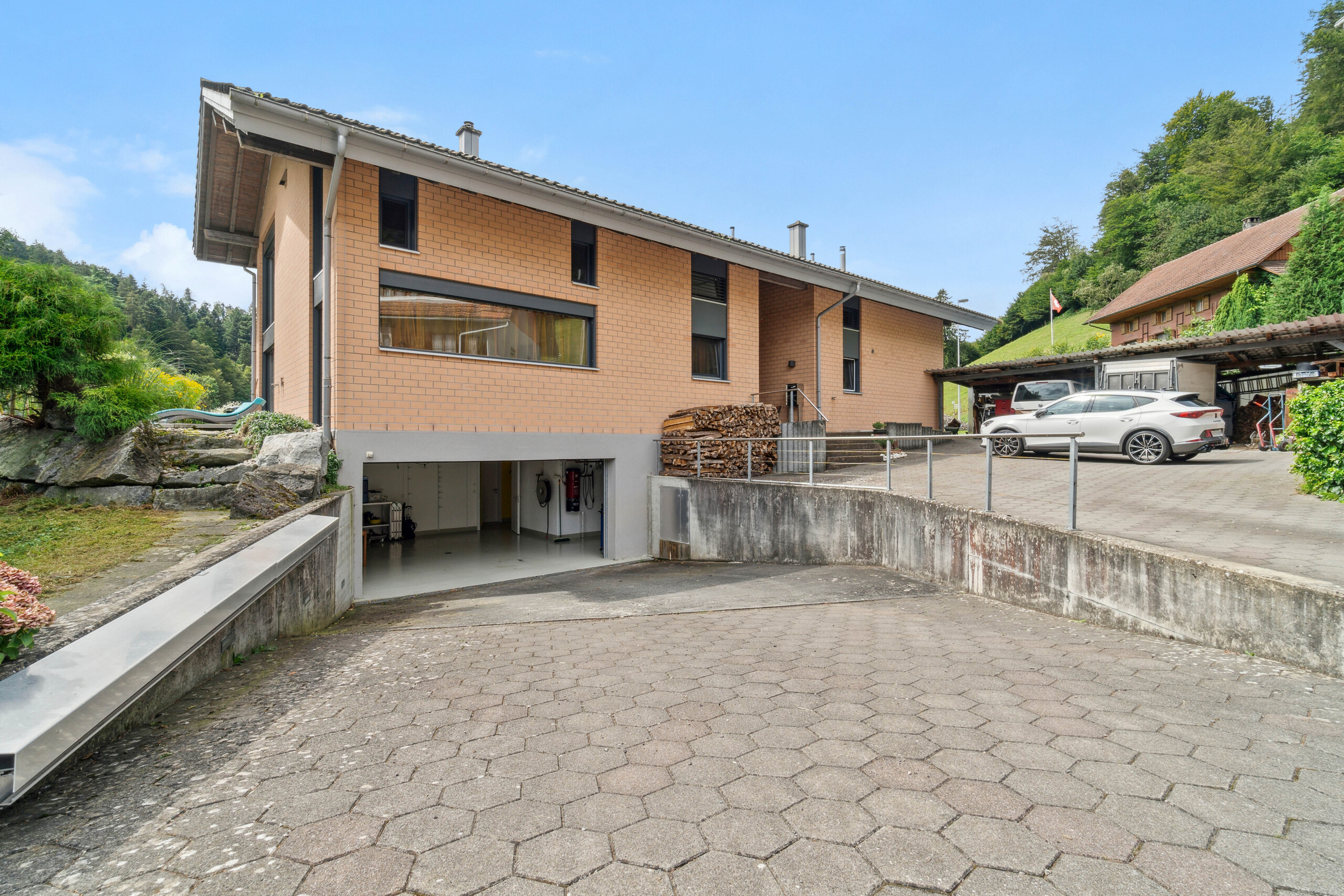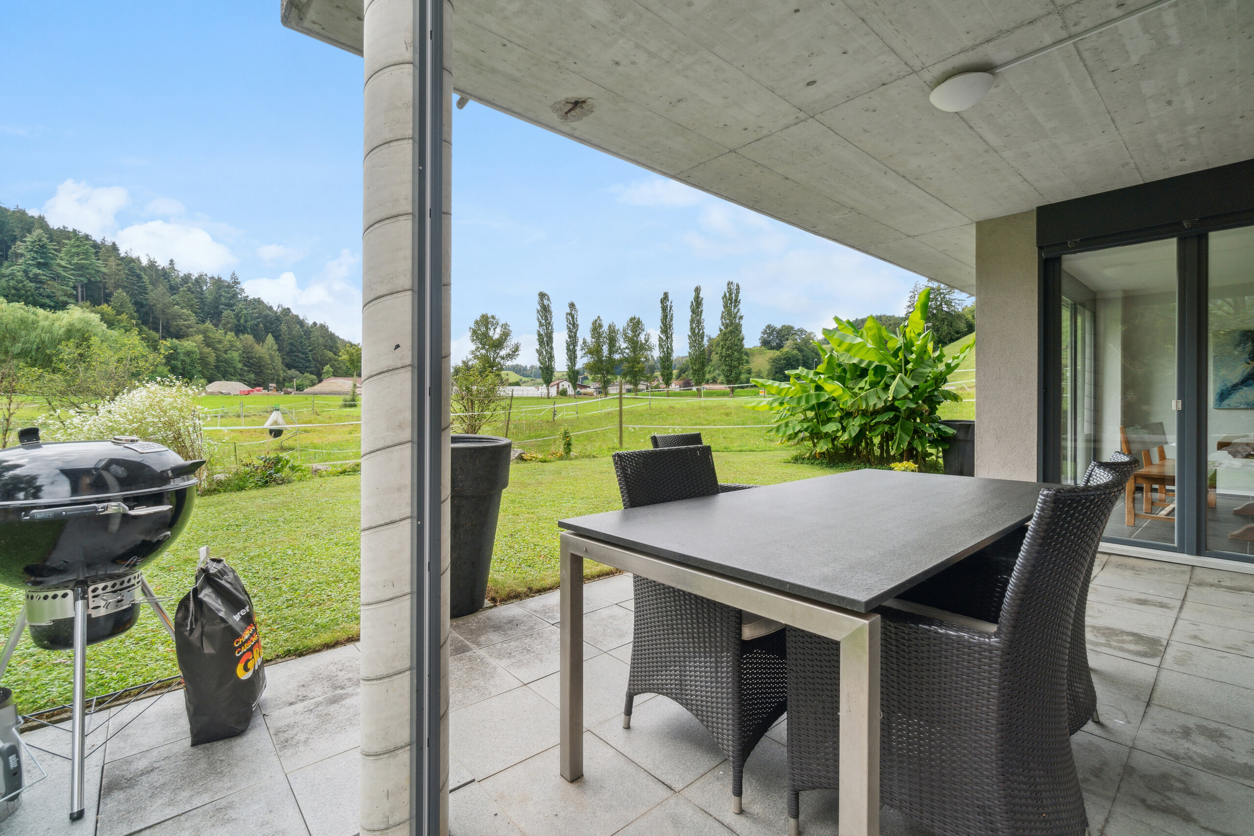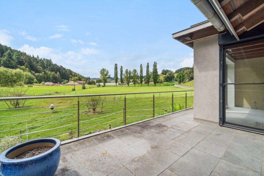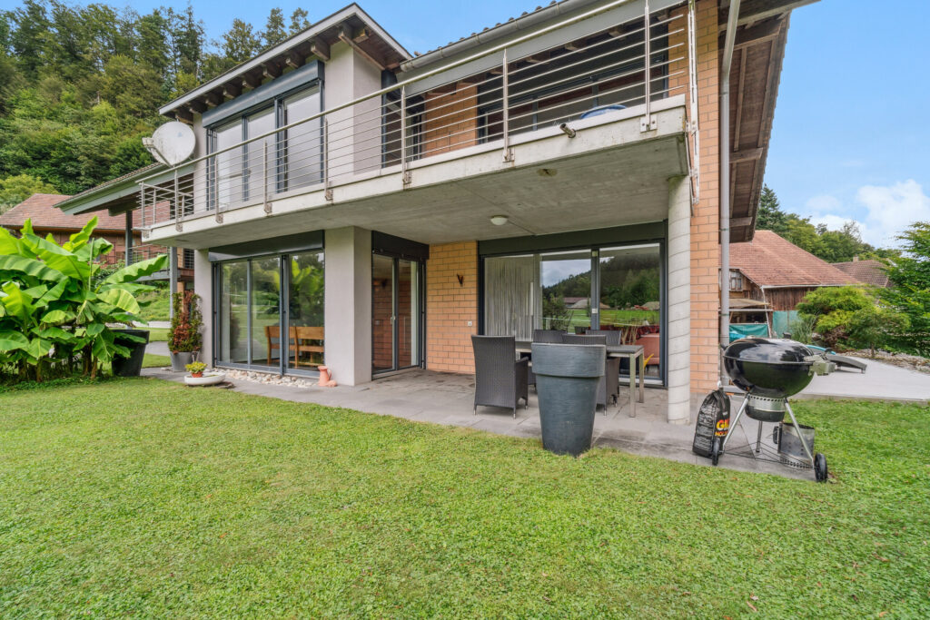 Balkon und Terrasse – teilweise überdacht und nach Südwesten ausgerichtet – laden zum Verweilen im Freien ein. Auf dem Grundstück befindet sich zudem ein Bauernhaus, das abgerissen und durch ein neues Ökonomiegebäude ersetzt werden darf. Die Baubewilligung liegt bereits vor, sodass beispielsweise ein Pferdestall oder ein anderes Hobbygebäude realisiert werden kann.