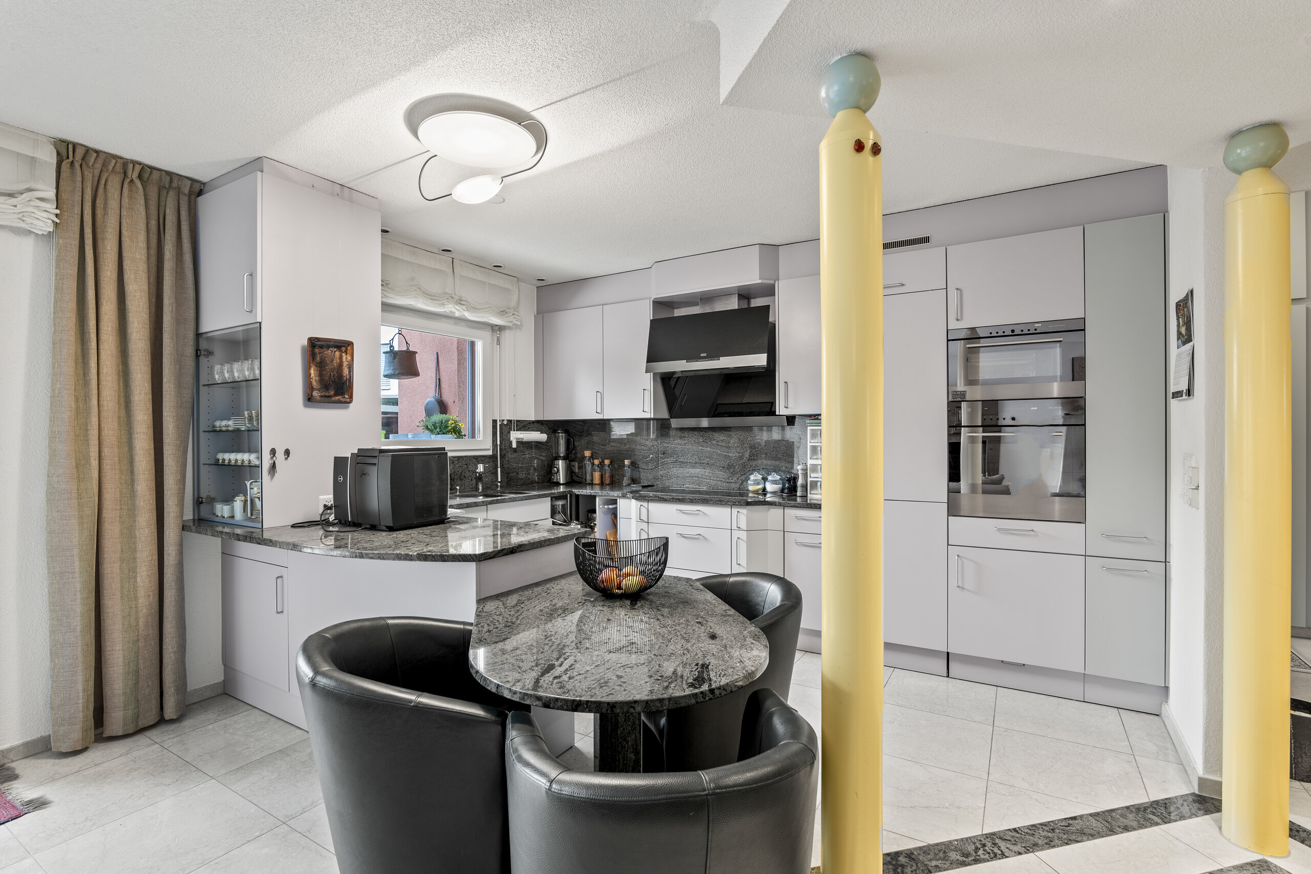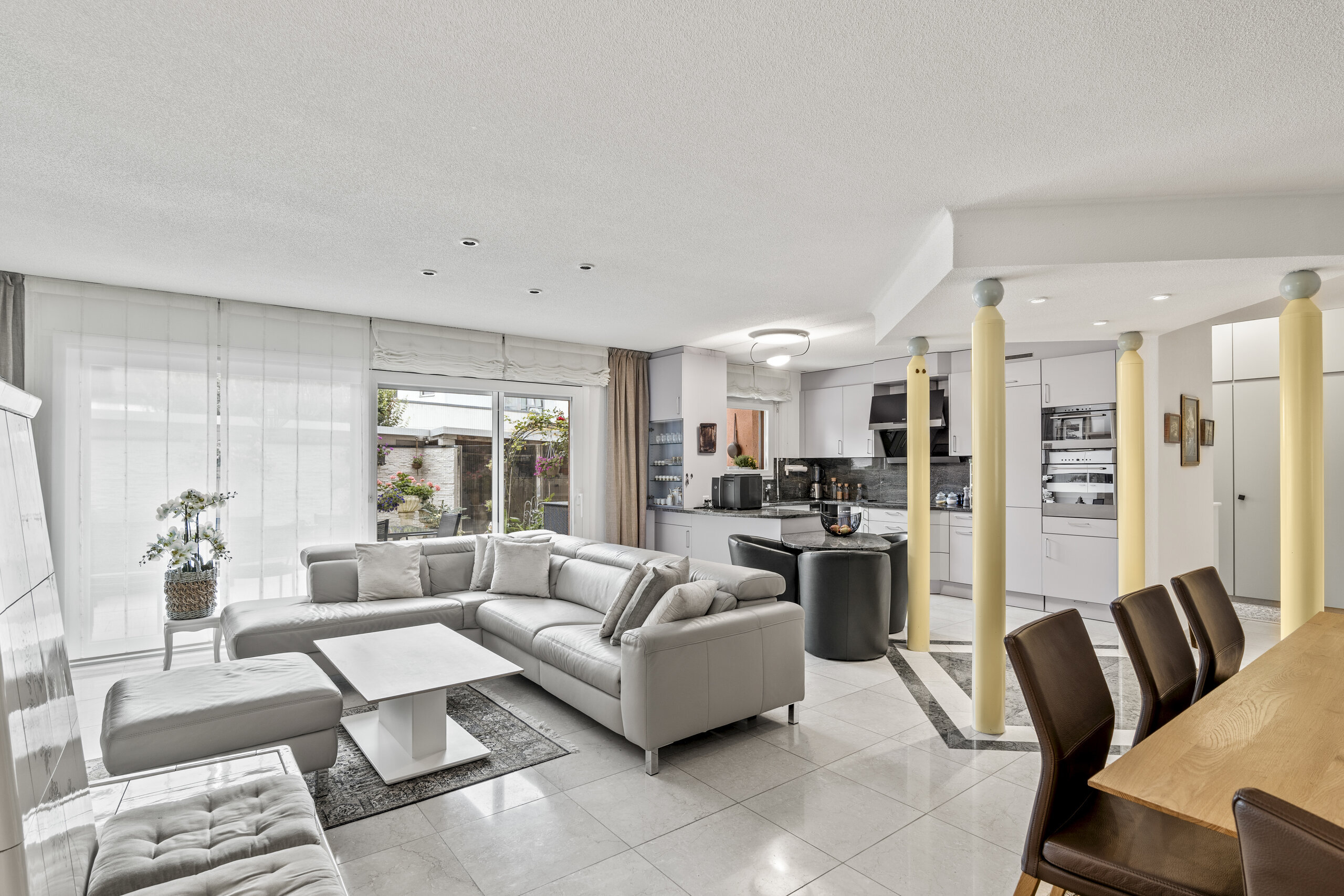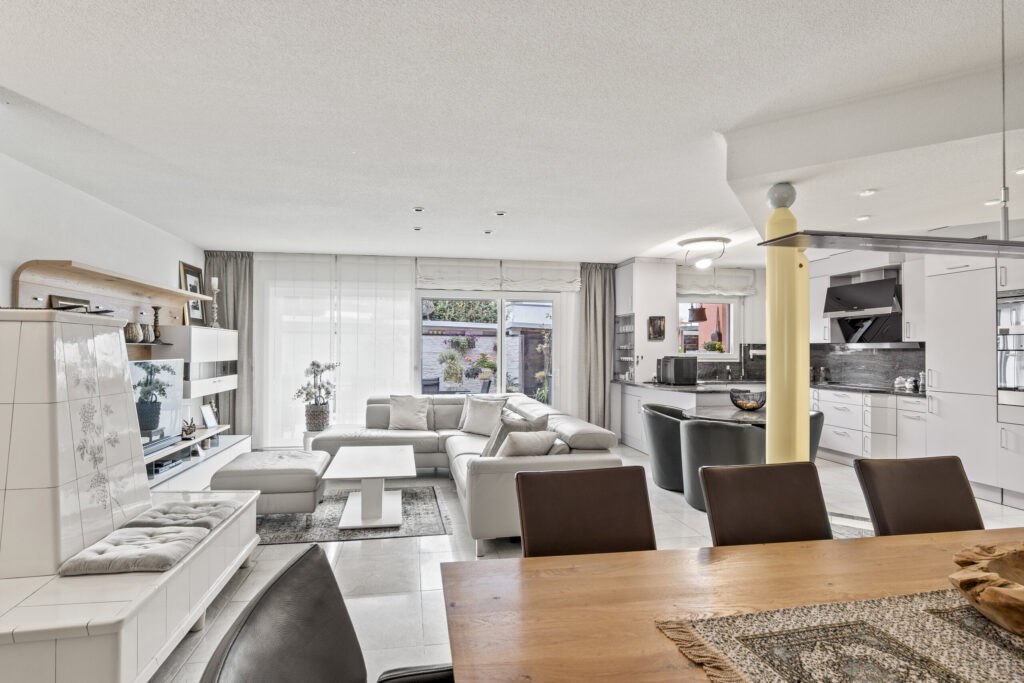 Der helle Wohn- und Essbereich mit gemütlichem Sitzofen öffnet sich direkt zur sonnigen Terrasse im Erdgeschoss – ein perfekter Ort für entspannte Stunden im Freien. Die offene Küche mit Granitabdeckung, praktischem Stauraum und angebautem Frühstückstisch lädt zum Kochen und Verweilen ein. Im Eingangsbereich sorgen diverse Einbauschränke für Ordnung und Funktionalität.