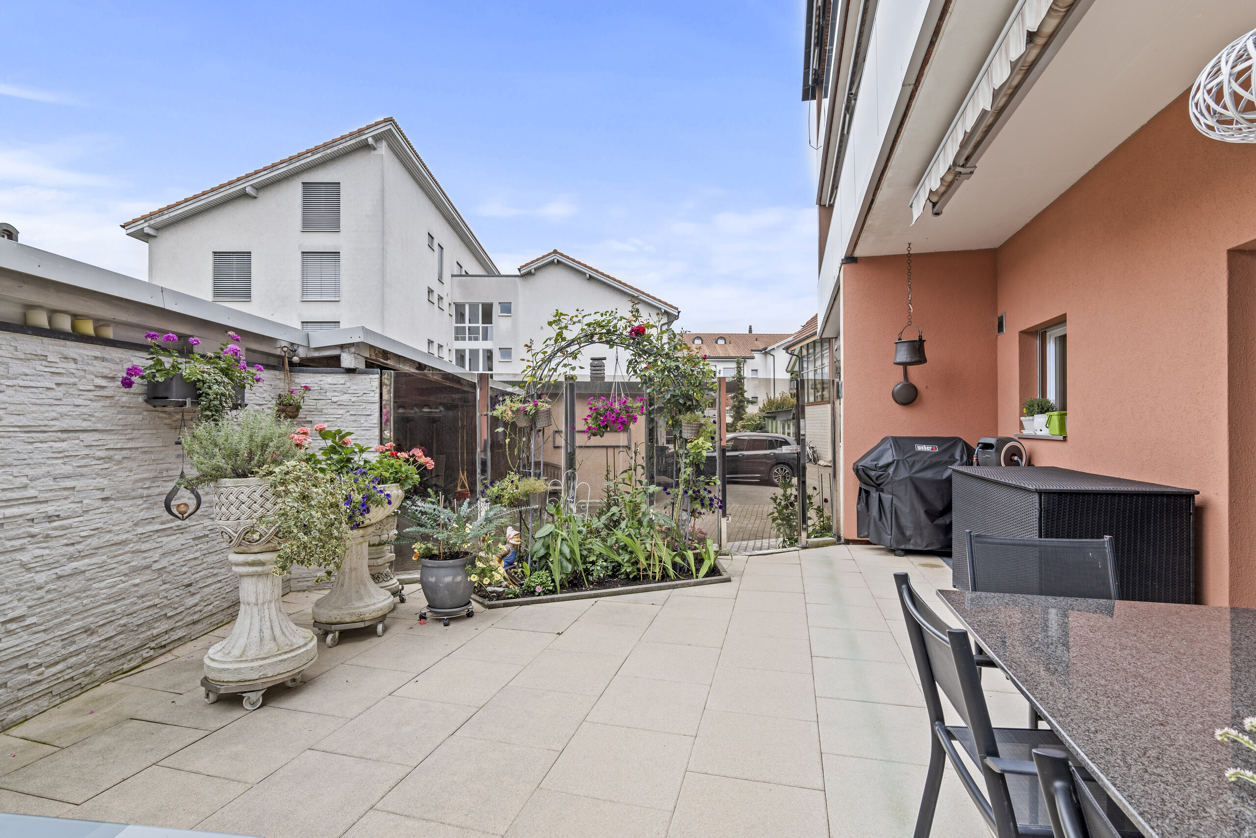 - Sonnige Terrasse im Erdgeschoss sowie ein gedeckter Balkon im Obergeschoss