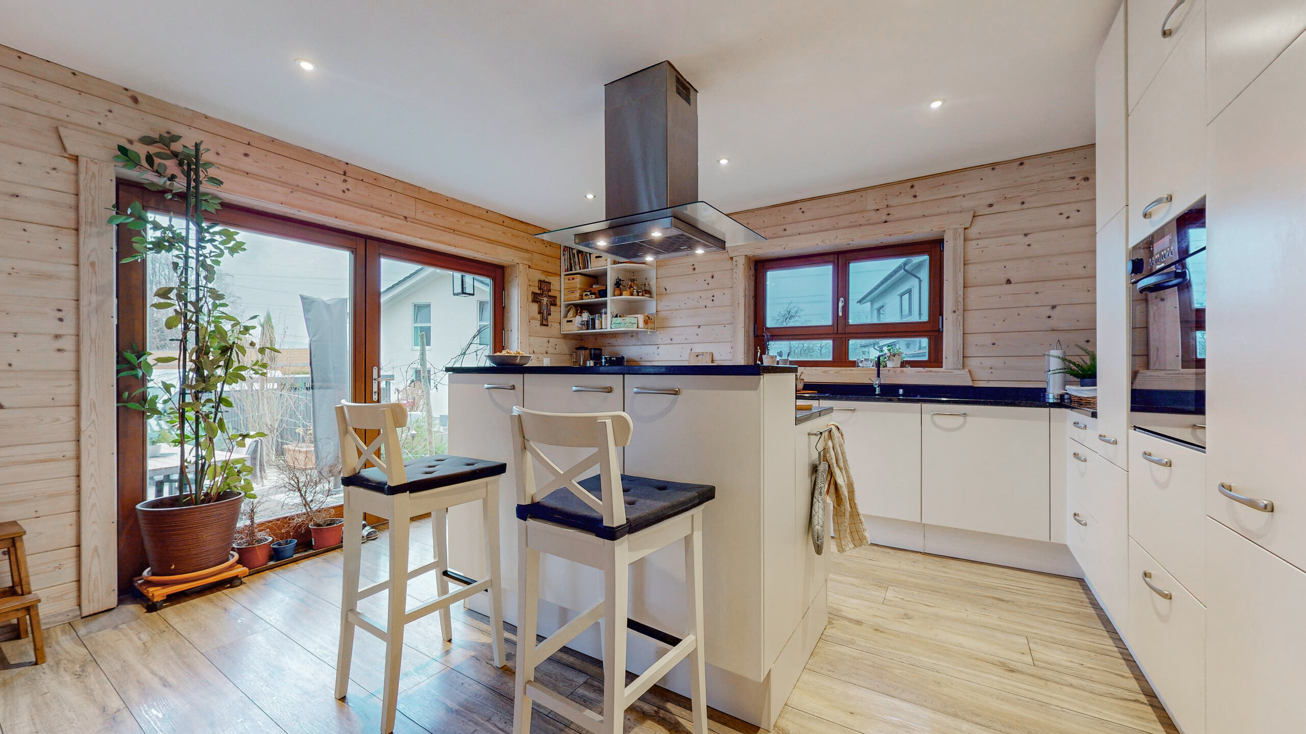 Der helle, offene Wohn- und Essbereich mit gemütlichem Schwedenofen bildet das Herzstück des Hauses und öffnet sich direkt zur Terrasse. Die halboffene Küche mit Granitabdeckung, Kochinsel und viel Stauraum überzeugt durch Funktionalität und Stil. Zwei moderne Badezimmer mit Dusche/WC sowie eine separate Gästetoilette runden den Komfort im Alltag ab.