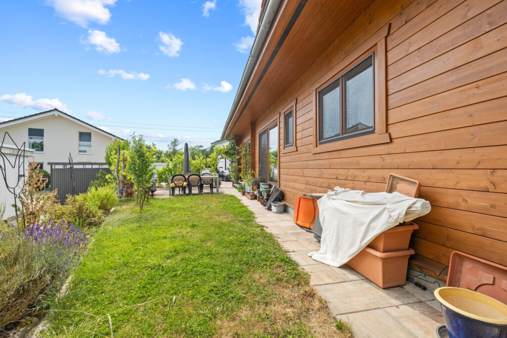 - Ein Garten mit schöner Grünfläche umgibt das Haus