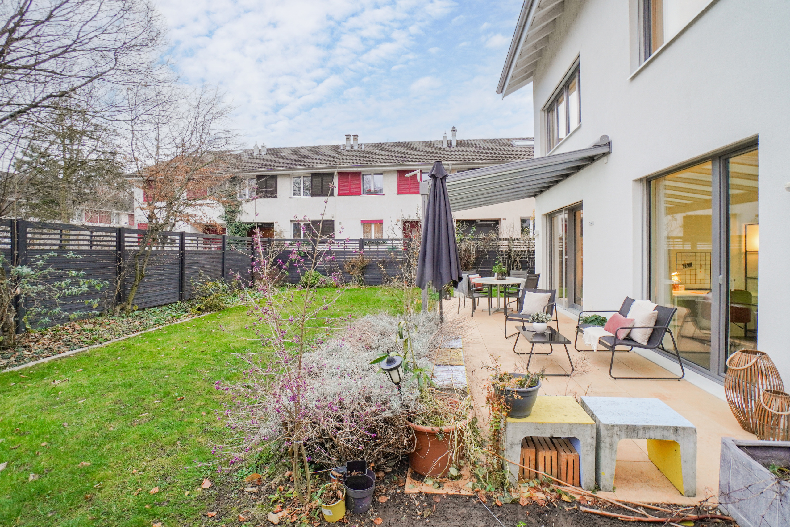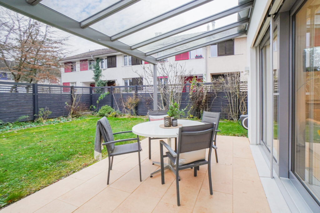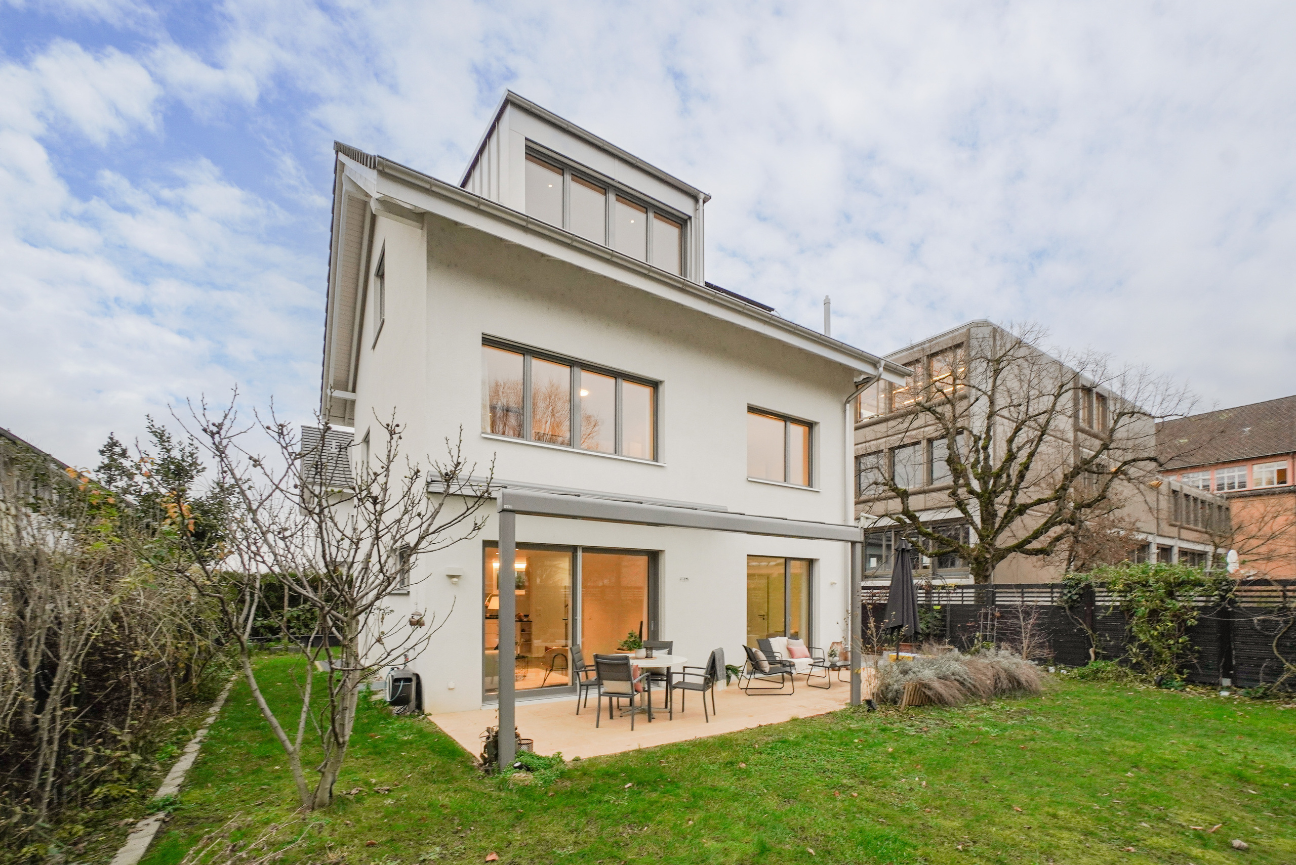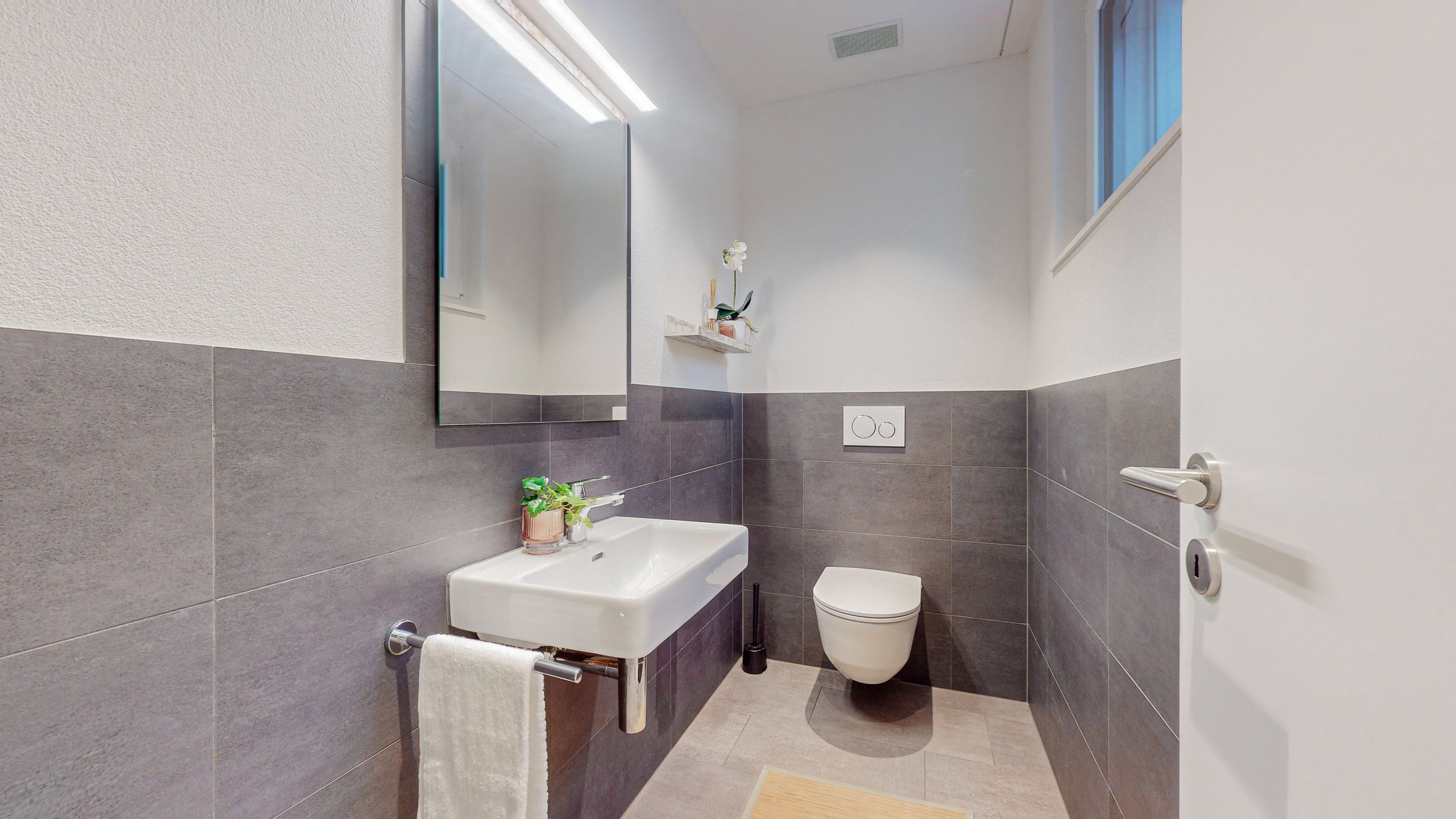Die stilvoll gestalteten Nassbereiche (zwei Duschen/WC, ein Bad/WC sowie eine separate Toilette) unterstreichen die Qualität des Hauses. Der Aussenbereich überzeugt mit einer teilweise gedeckten Terrasse und einem gepflegten Umschwung.