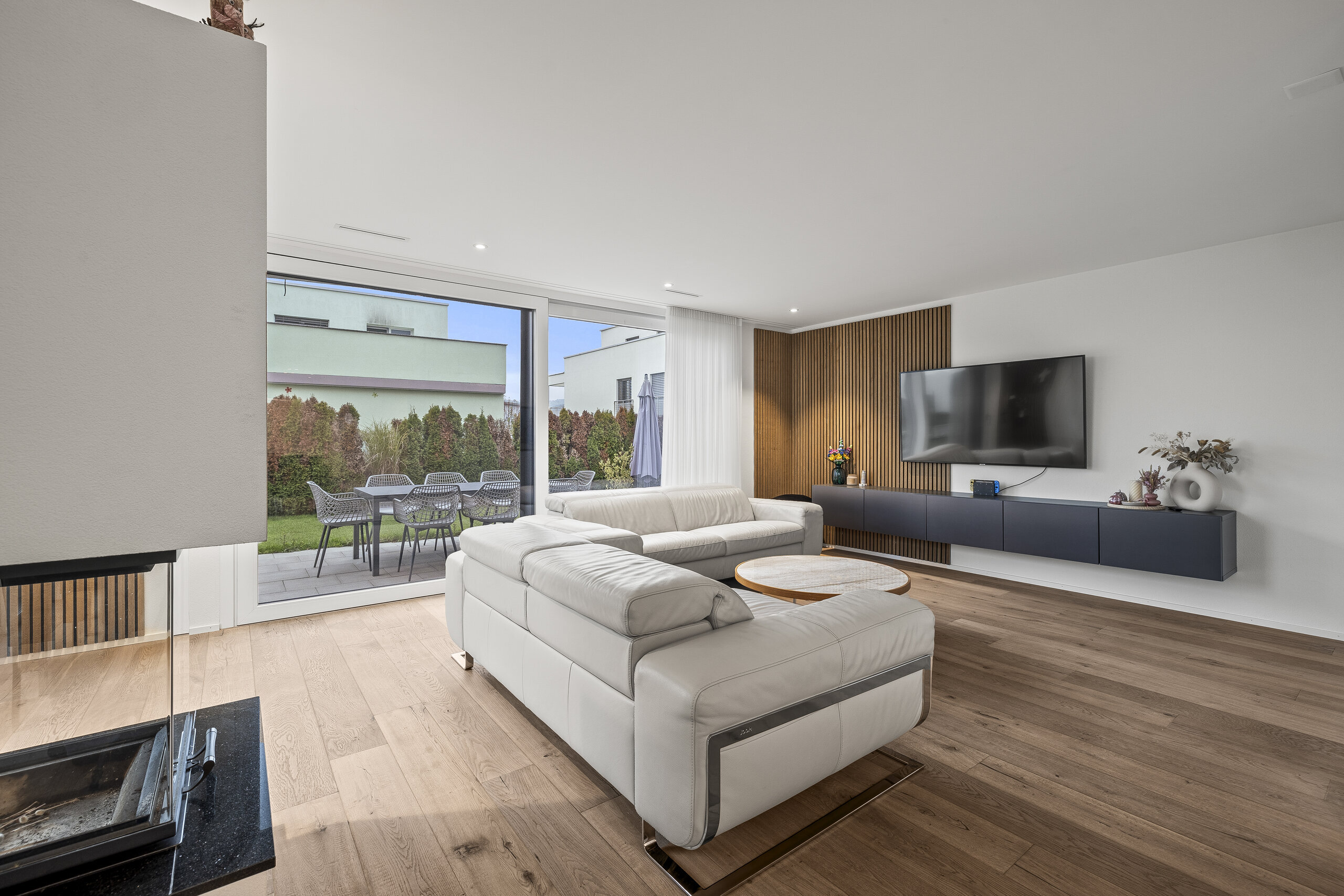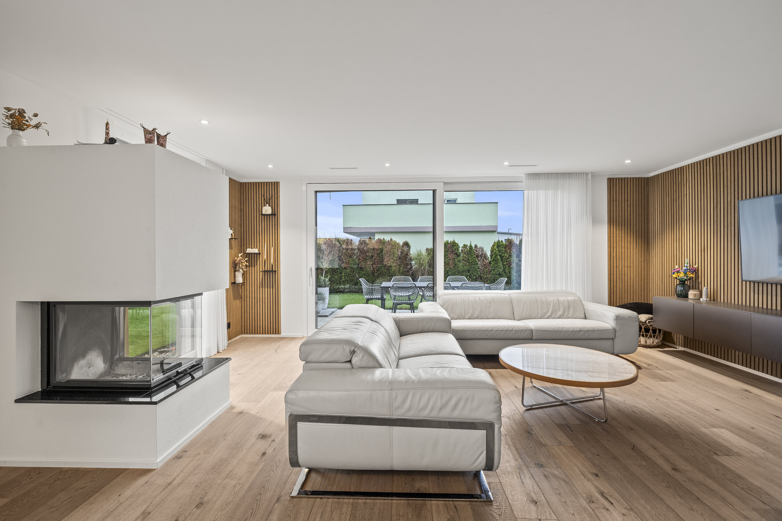 - Grosser, heller Wohn- und Essbereich mit elegantem Cheminée und direktem Zugang zum Aussenbereich