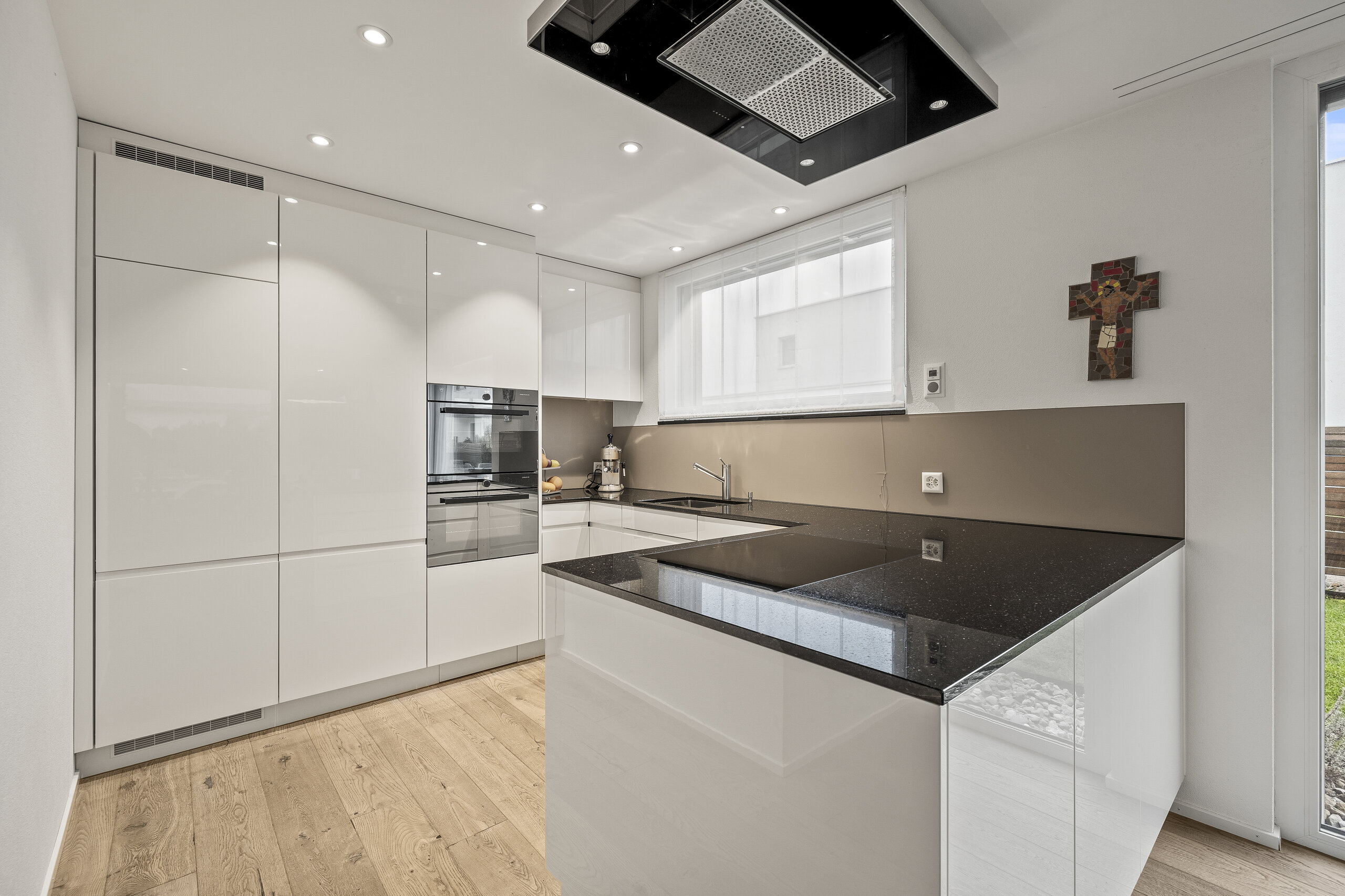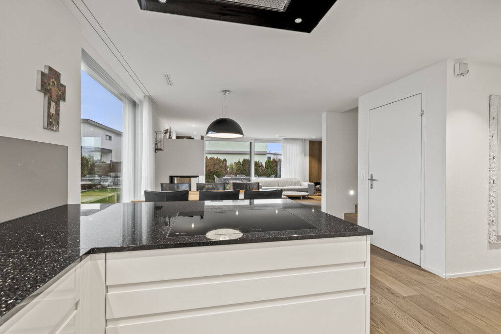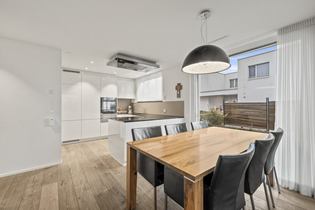 Das Herzstück bildet der grosse Wohn- und Essbereich mit elegantem Cheminée und direktem Zugang zum Aussenbereich. Hier verbinden sich Gemütlichkeit und Stil zu einem harmonischen Wohnambiente. Die offene, moderne Küche ist mit neuwertigen Geräten ausgestattet und bietet viel Stauraum – ideal für alle, die gerne kochen und Gäste bewirten.