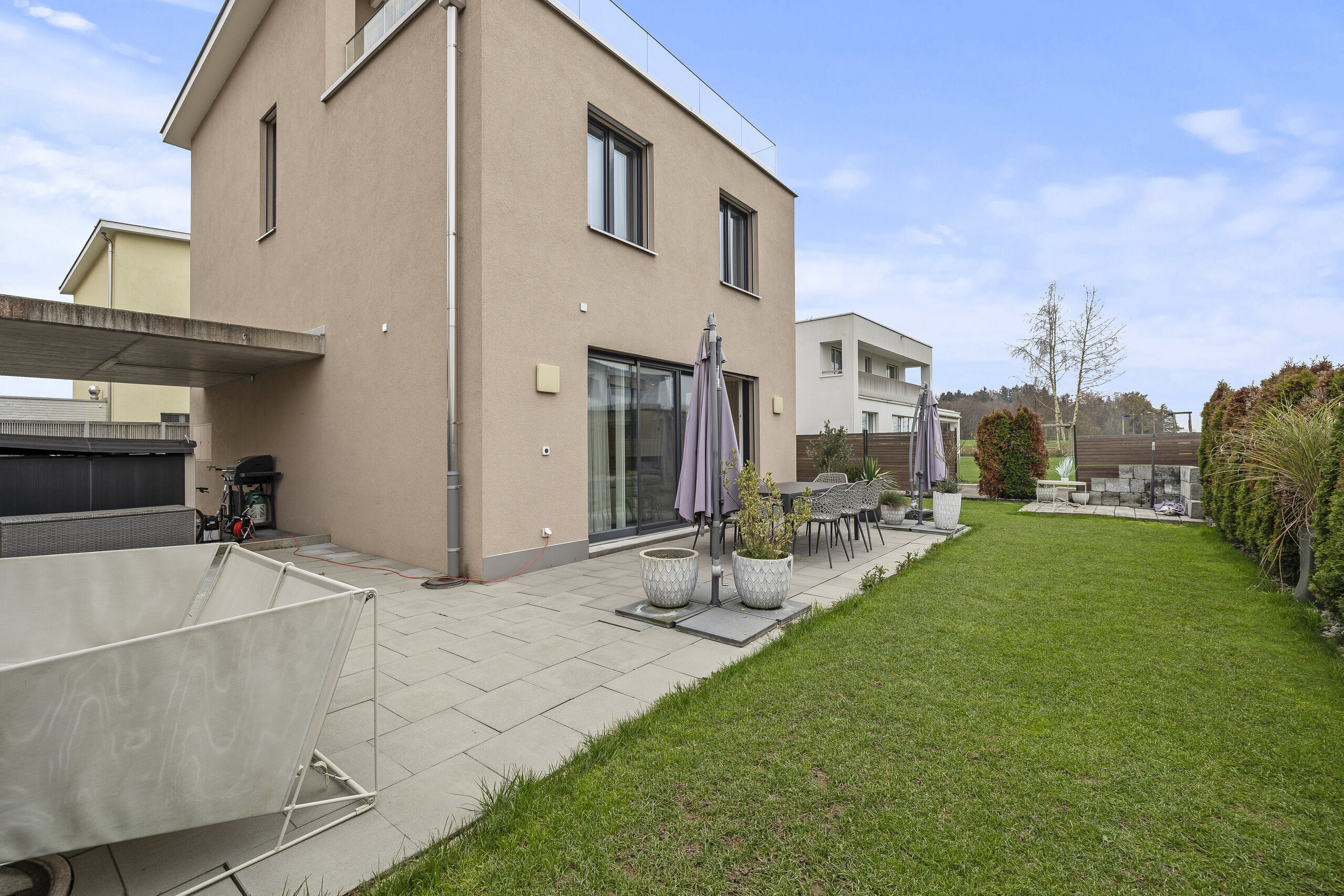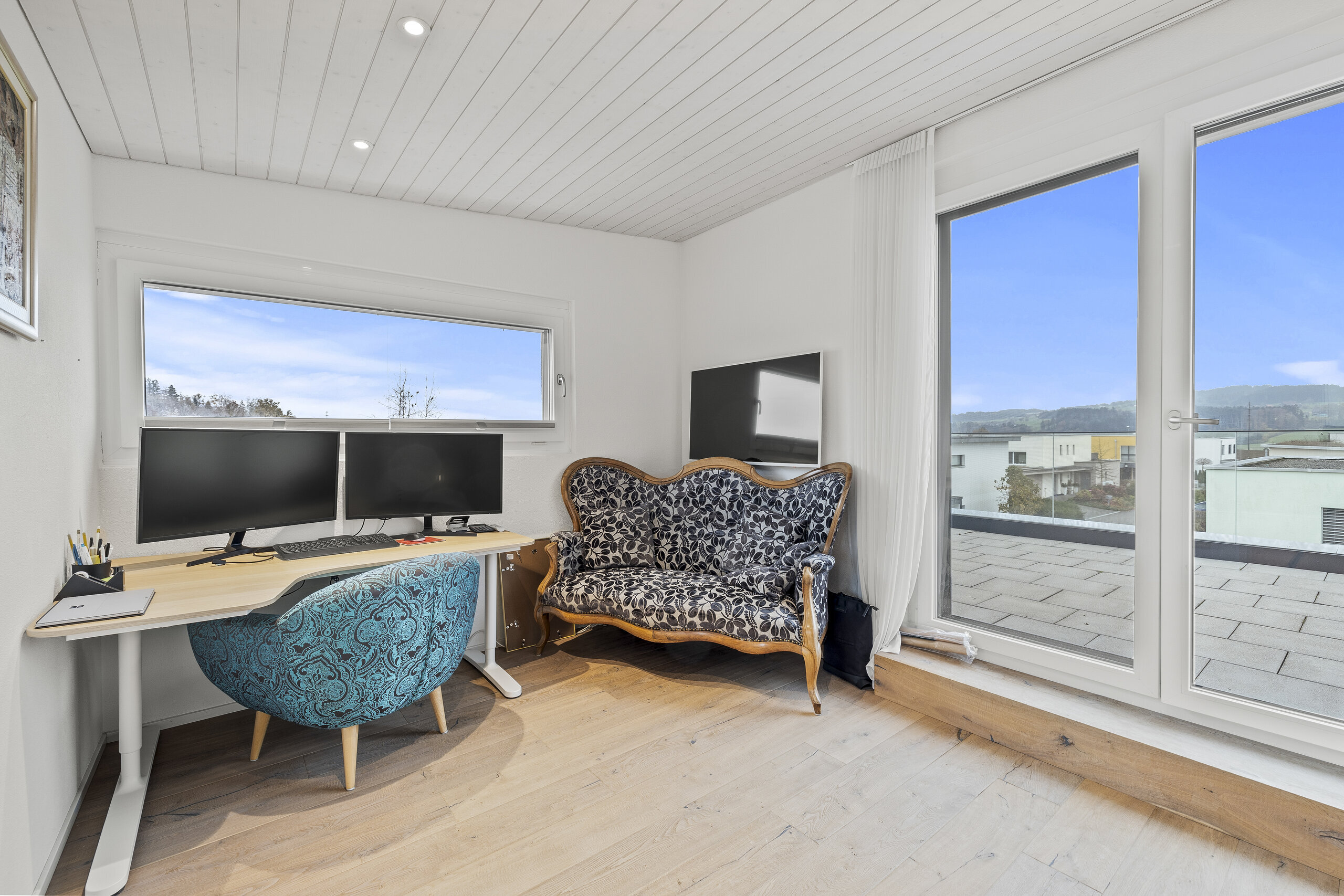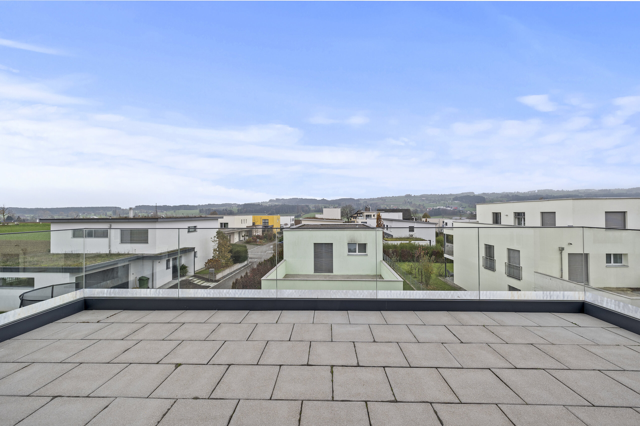 Ein besonderes Highlight ist die Terrasse im zweiten Obergeschoss, die einen herrlichen Blick auf die umliegende Landschaft eröffnet. Ergänzt wird das Angebot durch einen pflegeleichten Umschwung mit schöner Grünfläche und einer grossen Terrasse, die zu entspannten Stunden im Freien einlädt.