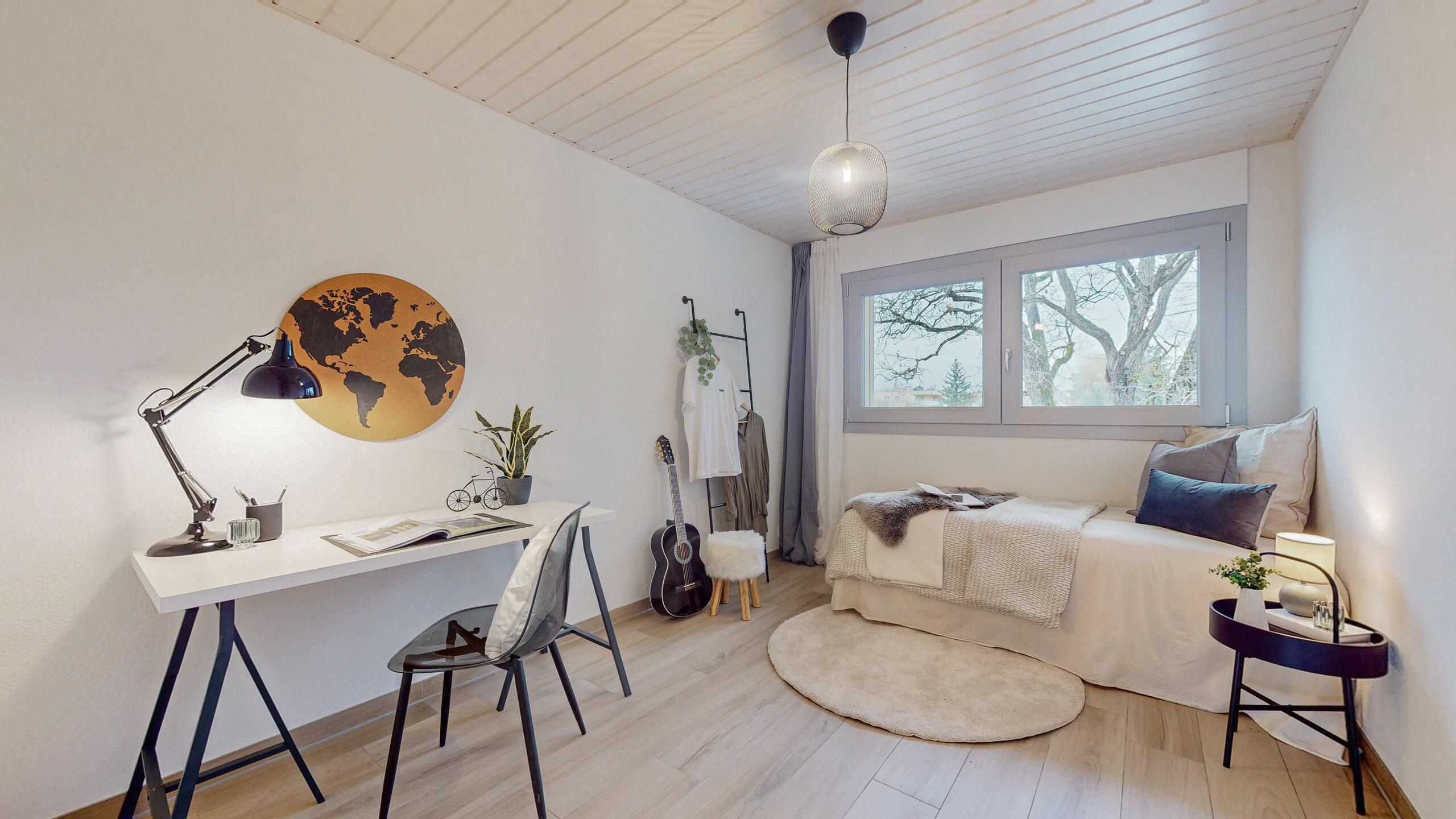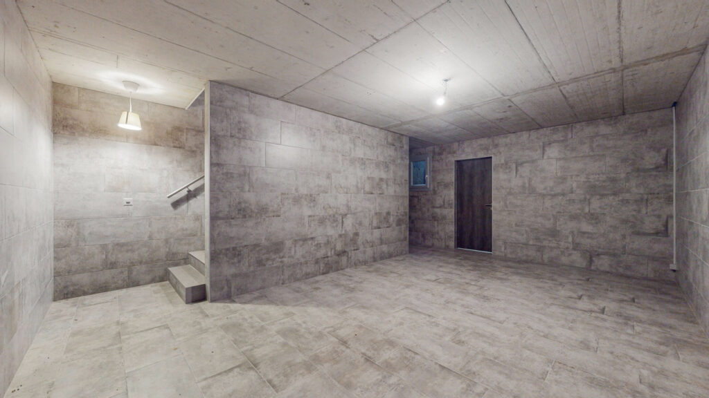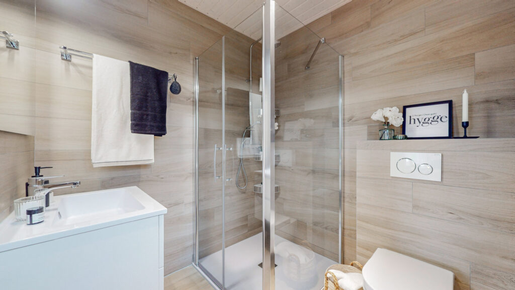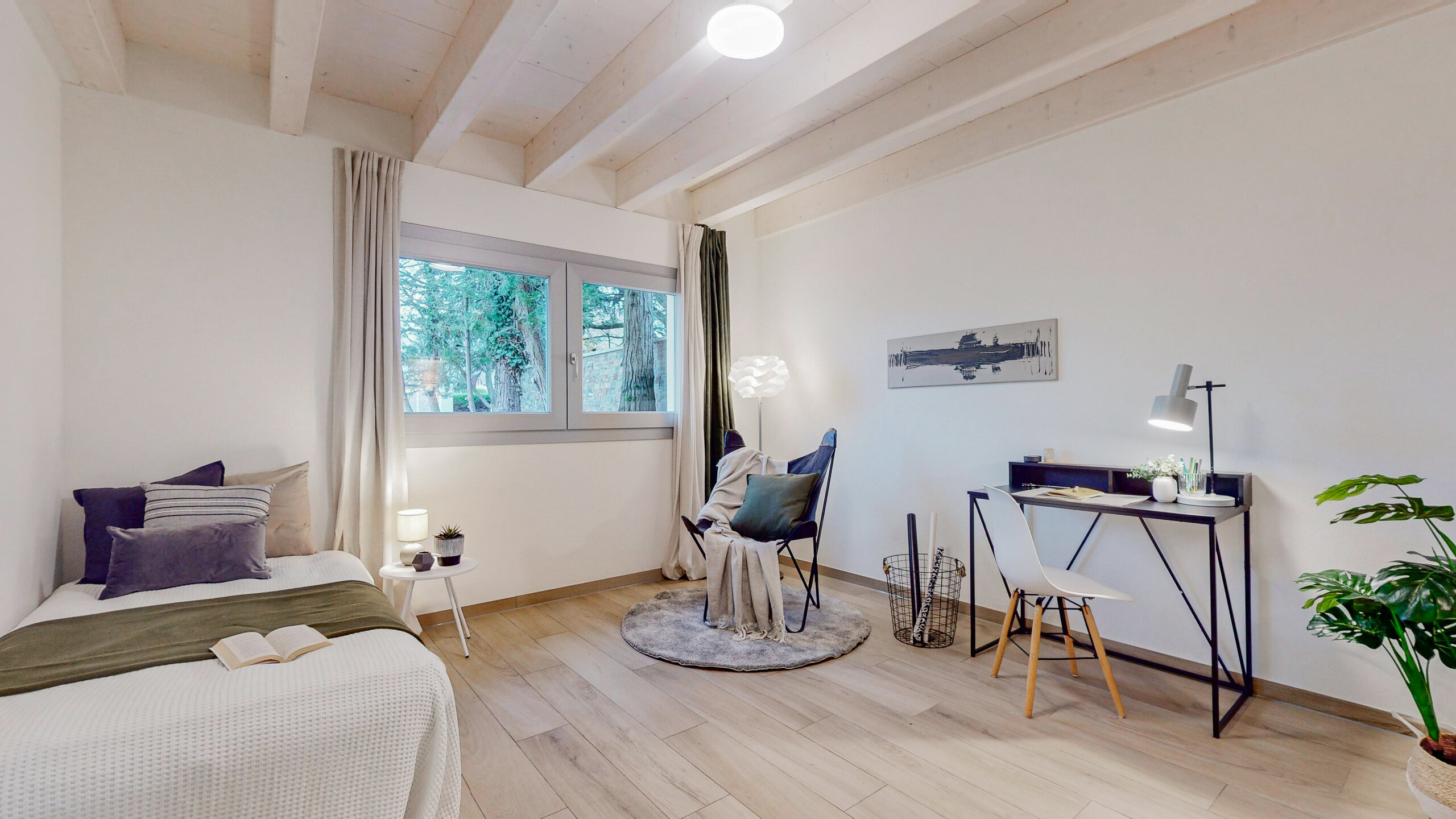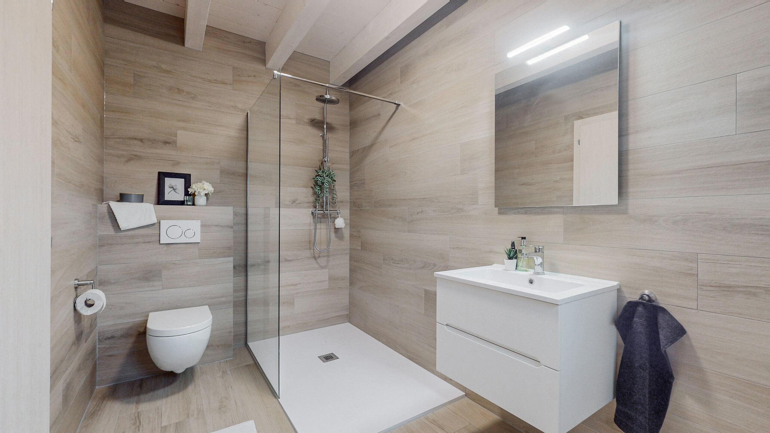 Im ersten Stock erwartet Sie ein heller, offener Wohnbereich, der vielseitig genutzt werden kann. Drei moderne Bäder – zwei mit Dusche/WC und eines mit Badewanne/WC – bieten hohen Komfort im Alltag. Besonders hervorzuheben ist das grosse Schlafzimmer mit eigenem Bad en suite und Balkon, das einen privaten Rückzugsort schafft.