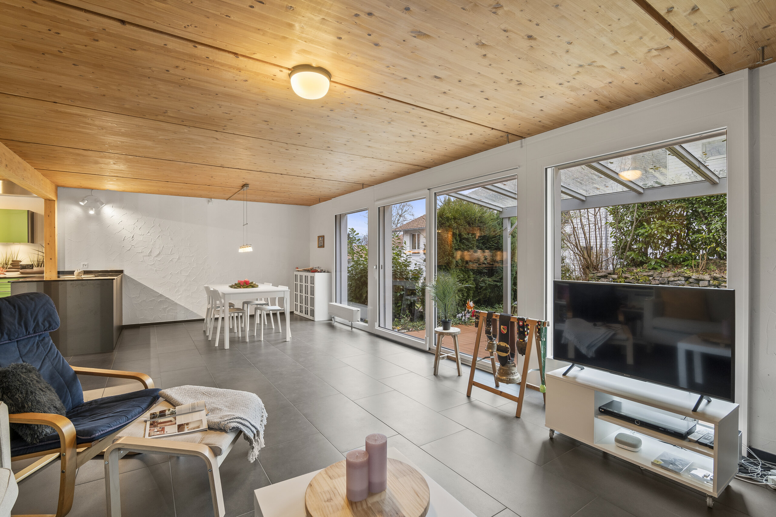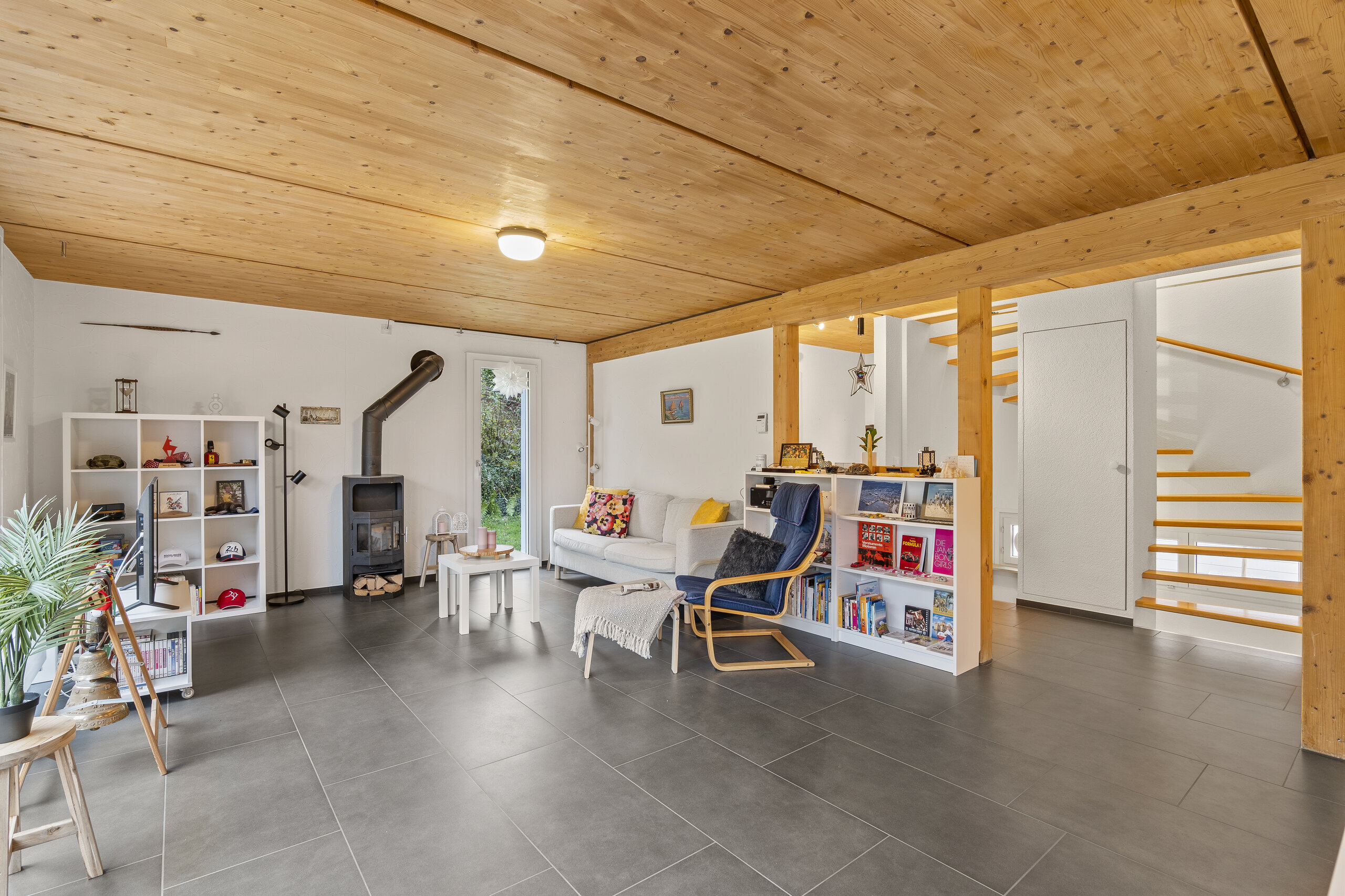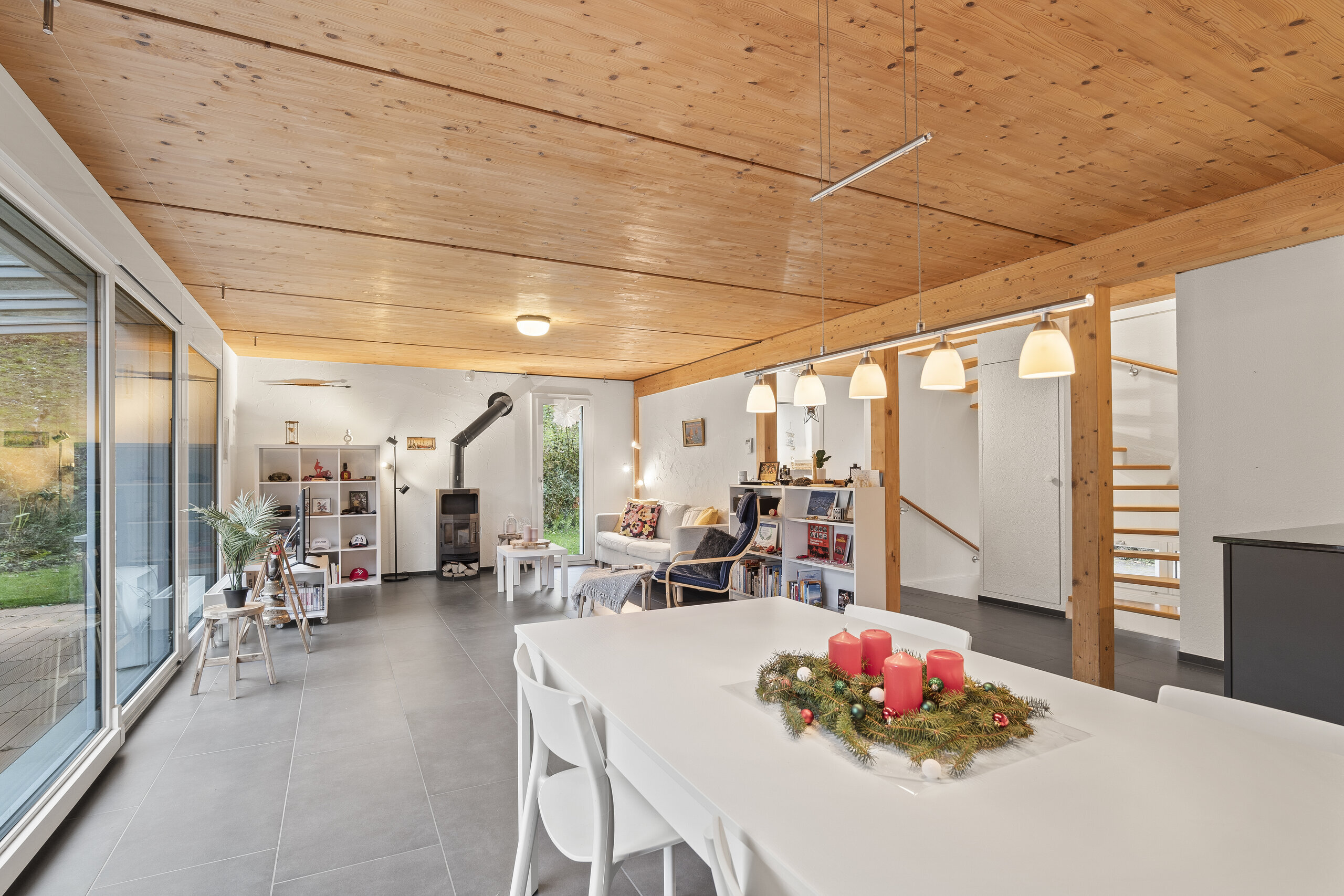 - Einladender Wohnbereich mit charaktervollen Sichtbalken, einem gemütlichen Schwedenofen und direktem Zugang zum Aussenbereich