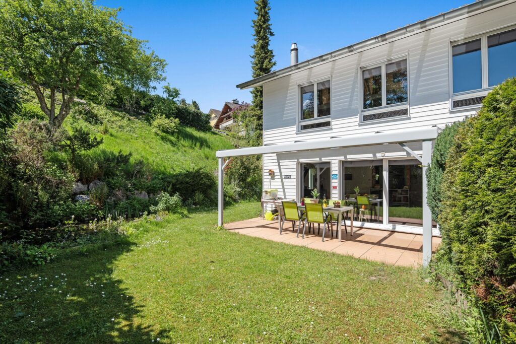 - Überdachte Terrasse und ein pflegeleichter Garten mit hoher Privatsphäre dank dichter Bepflanzung und Hanglage