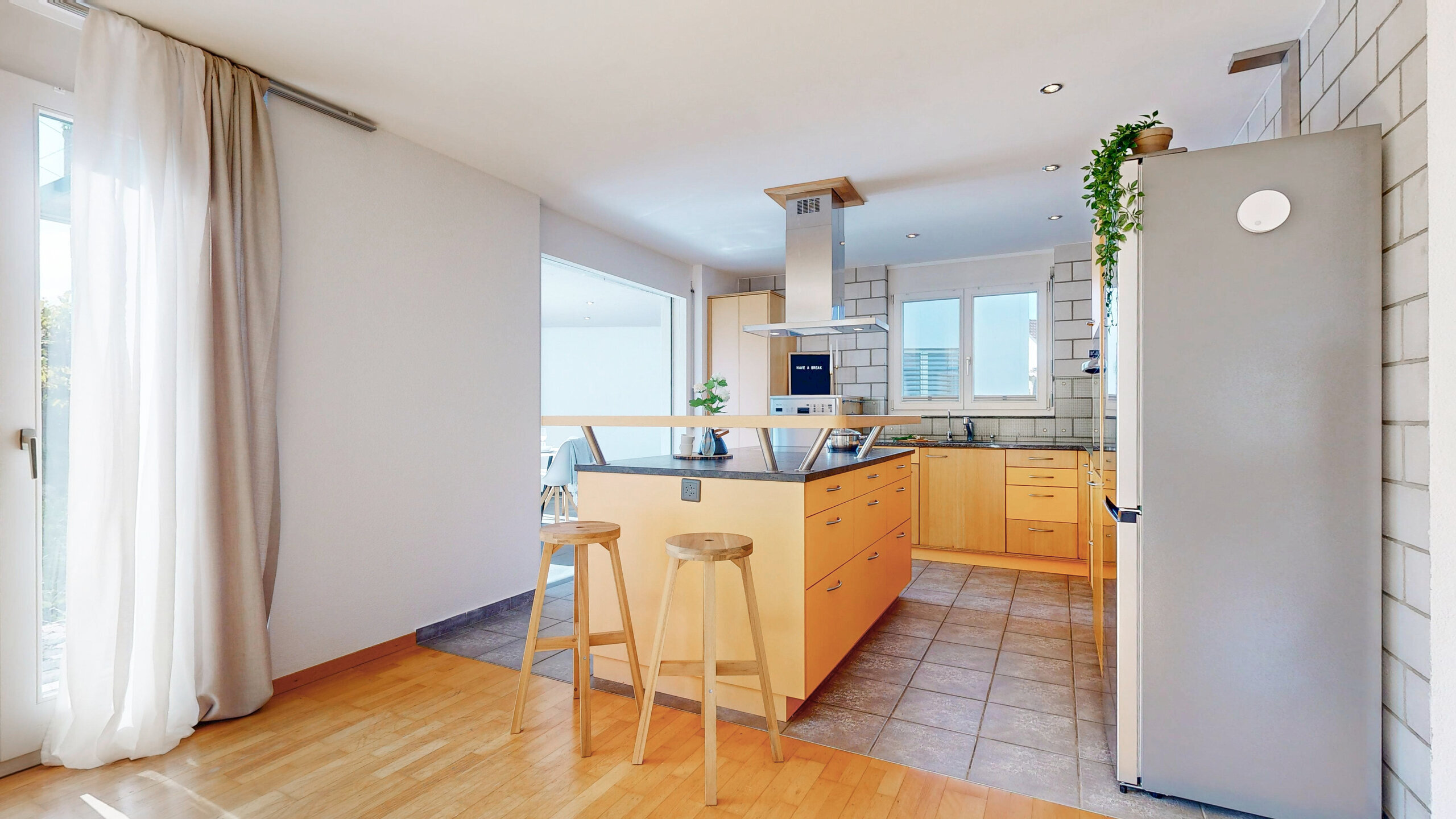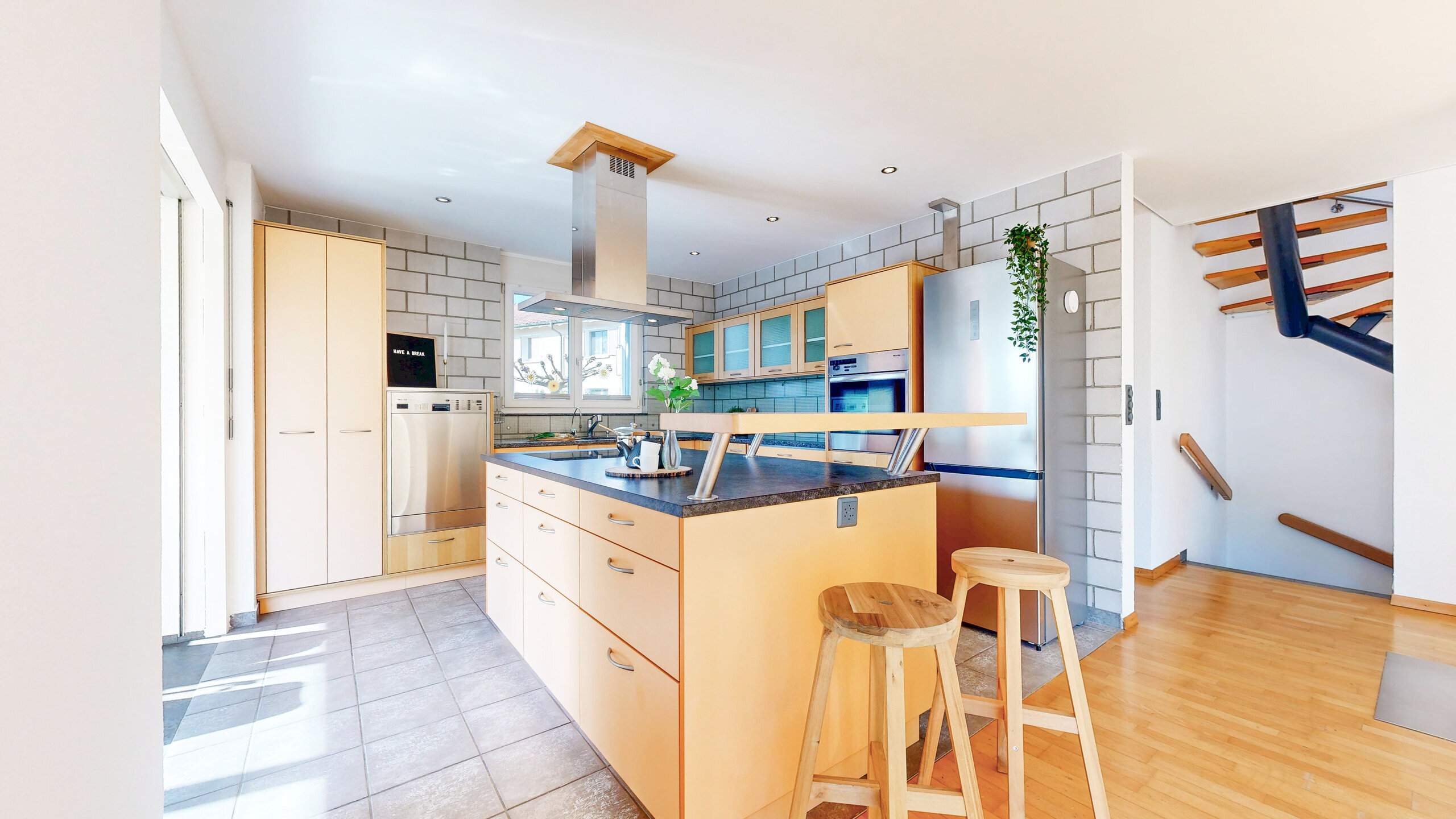 Im Erdgeschoss bildet der offene Wohnbereich mit Schwedenofen das Zentrum des Hauses. Der direkte Zugang zum Garten schafft eine angenehme Verbindung zwischen Innen- und Aussenraum. Die moderne, offene Küche mit Granitabdeckung, Kochinsel und viel Stauraum fügt sich harmonisch in den Wohnbereich ein und bietet beste Voraussetzungen für gemeinsames Kochen.