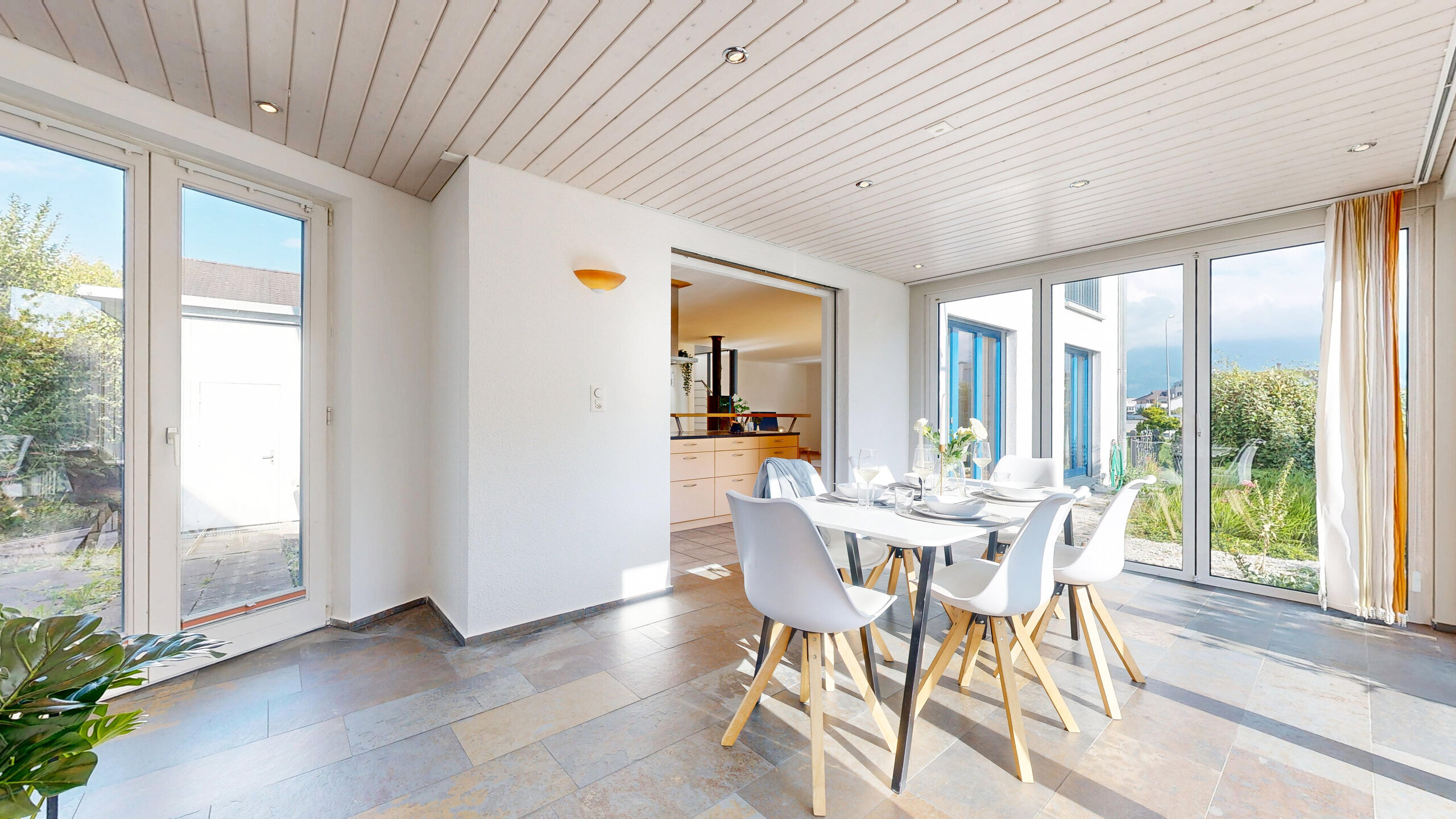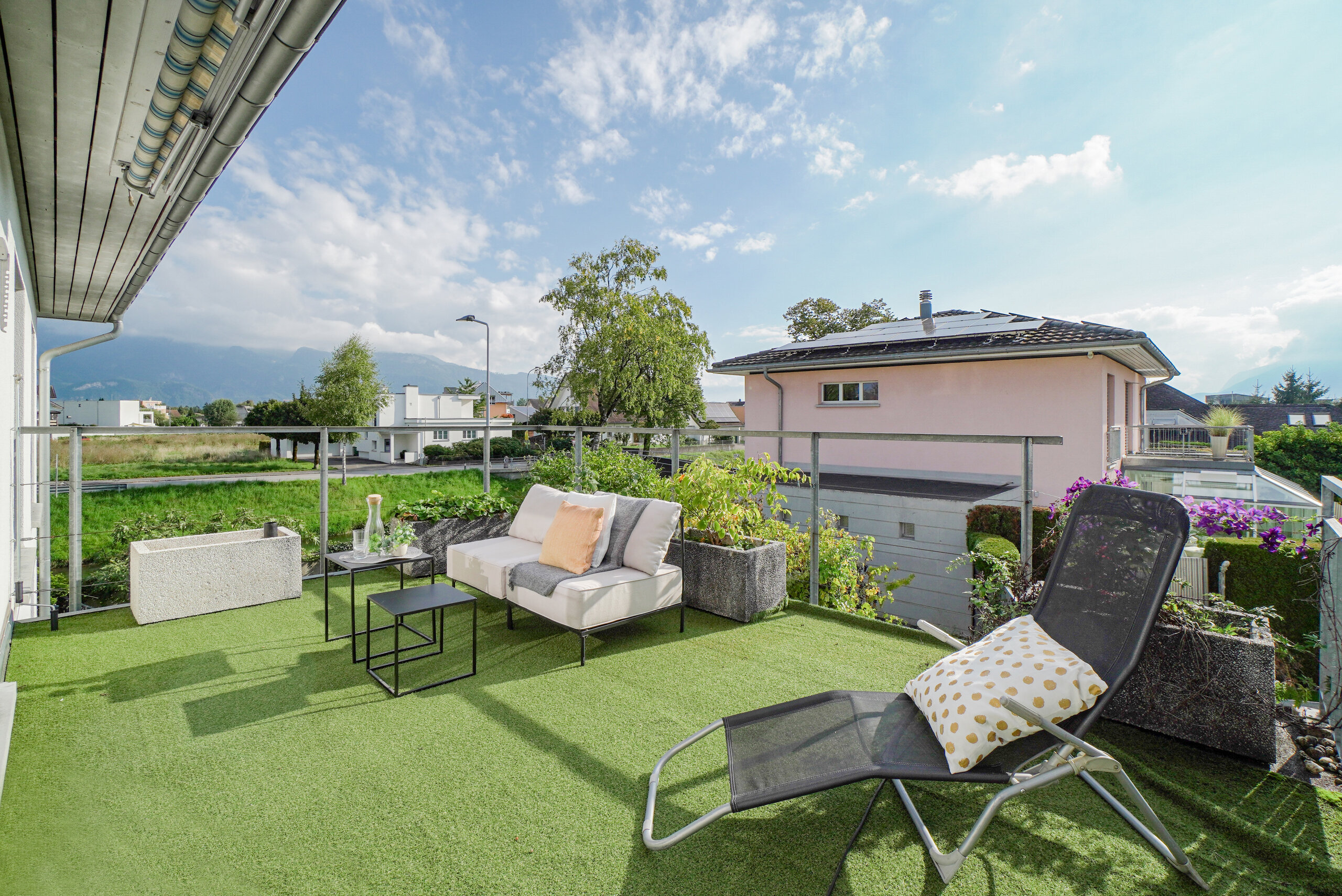 - Einladende Terrasse im Obergeschoss mit Sonnenstore und offener Weitsicht