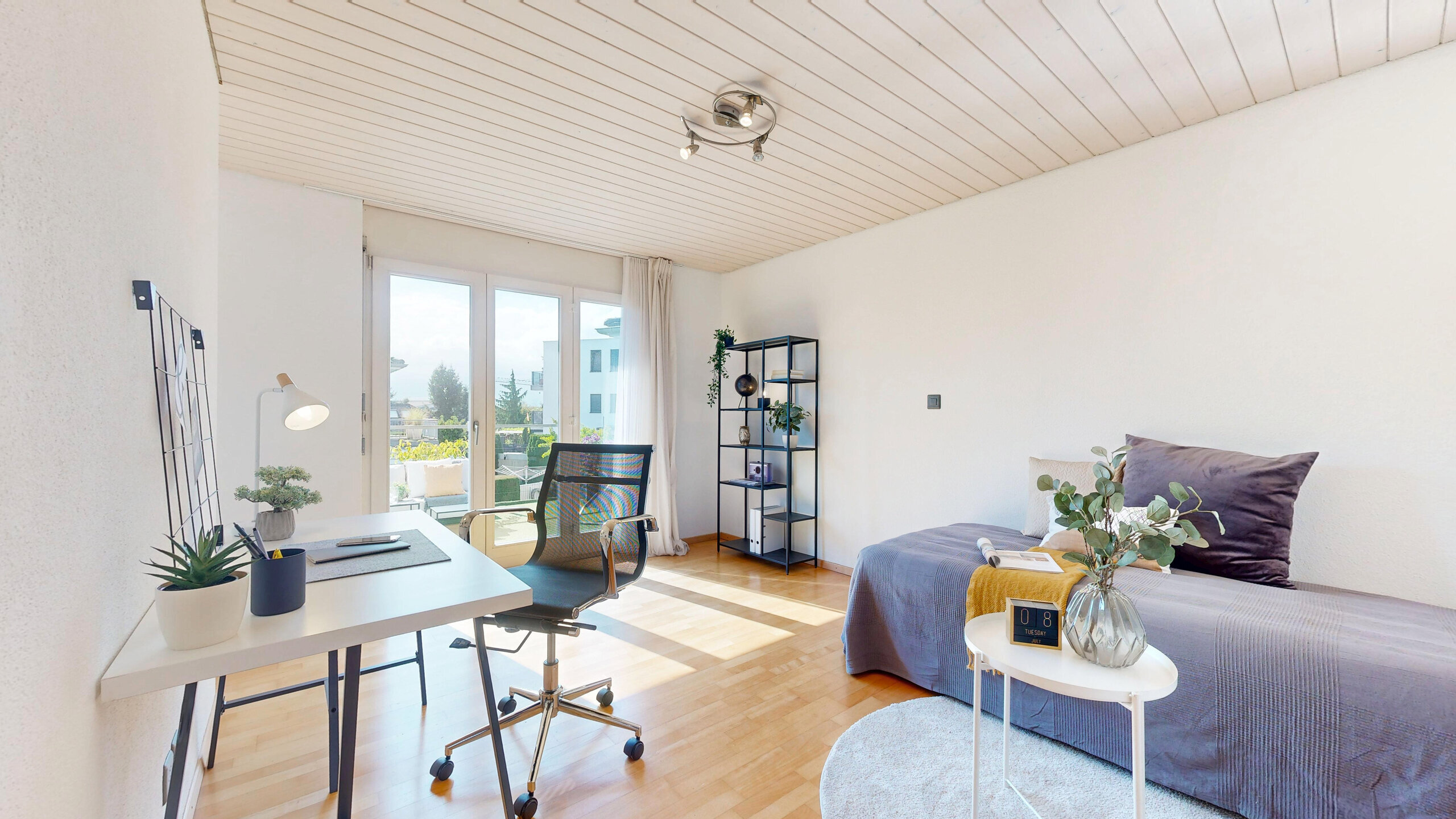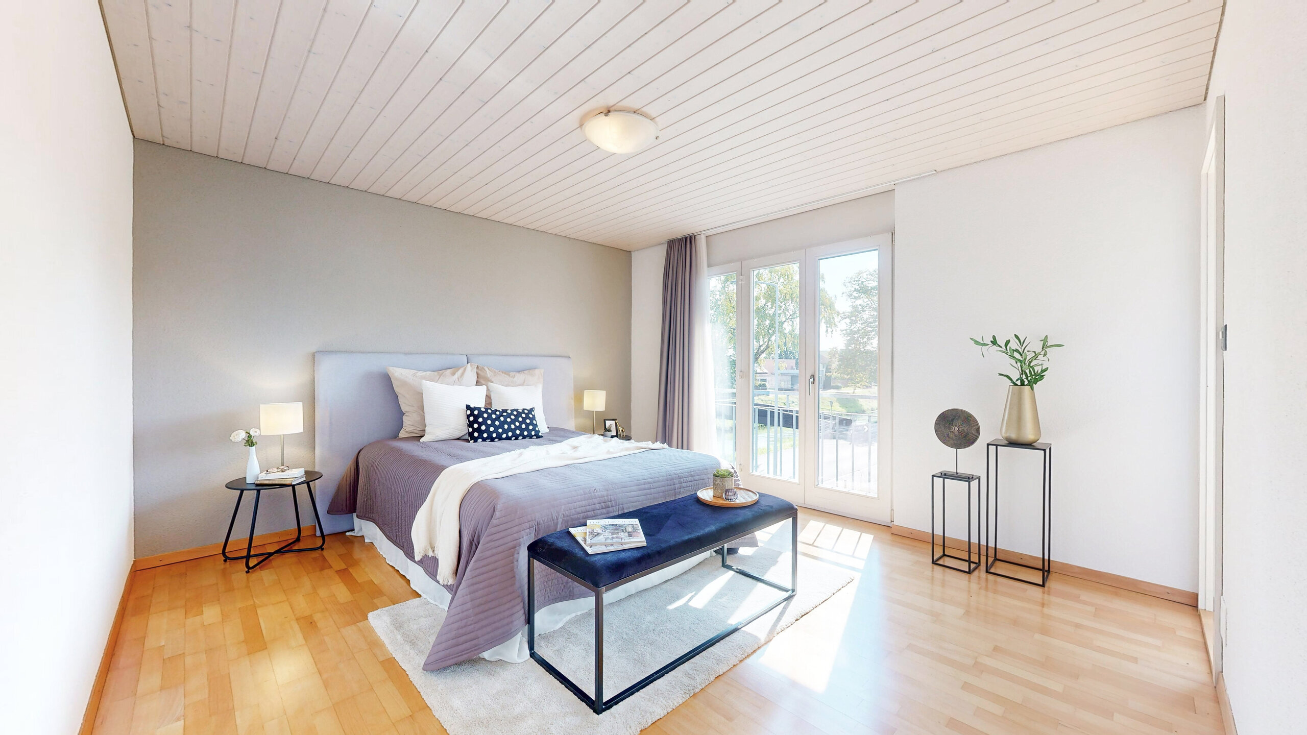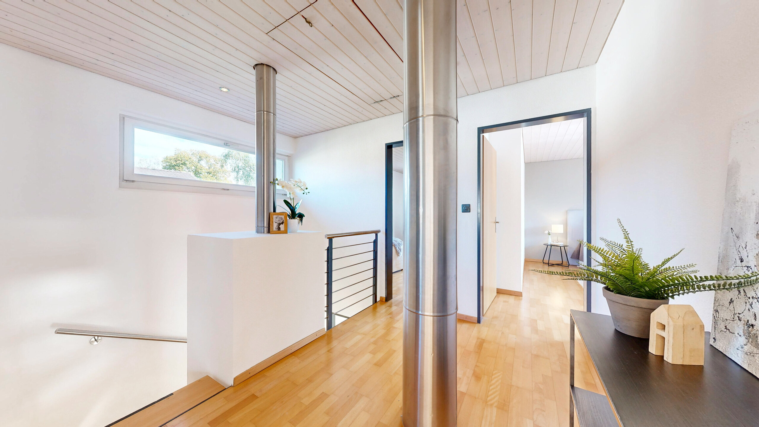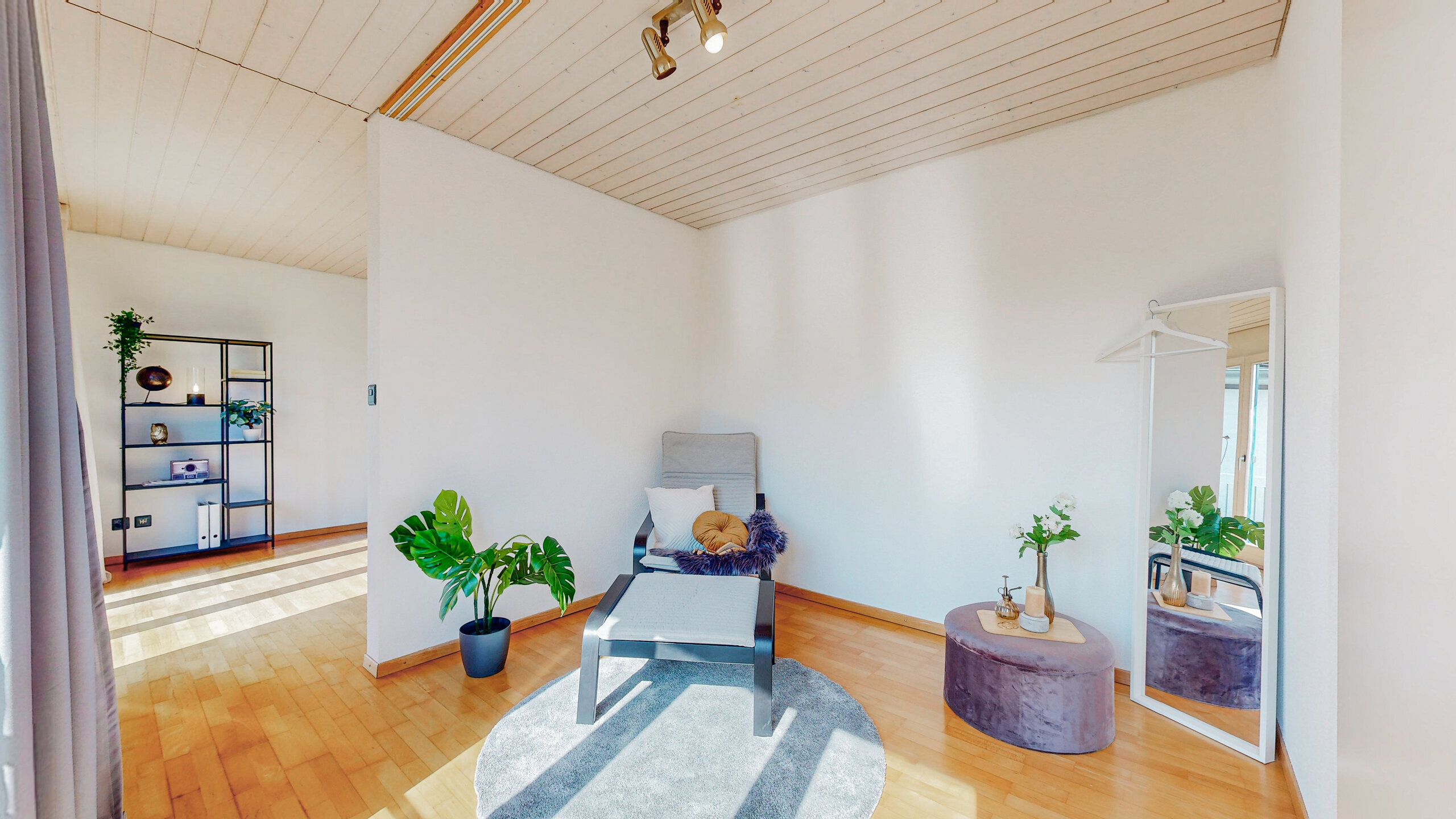 Das Obergeschoss beherbergt ein helles Schlafzimmer mit eigenem Garderobenzimmer sowie einen Nassbereich mit Bad/Dusche/WC. Eine einladende Terrasse mit Sonnenstore und weiter Aussicht lädt zum Entspannen ein. Zusätzlich sorgt ein lichtdurchfluteter, beheizter Wintergarten für ganzjährig nutzbaren Wohnraum mit besonderem Ambiente.