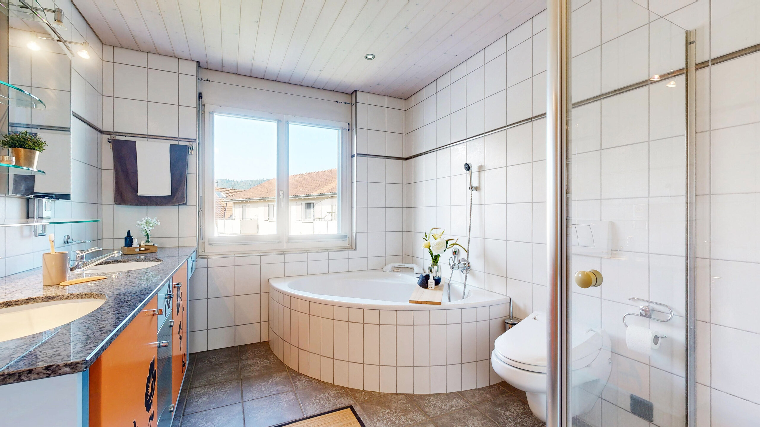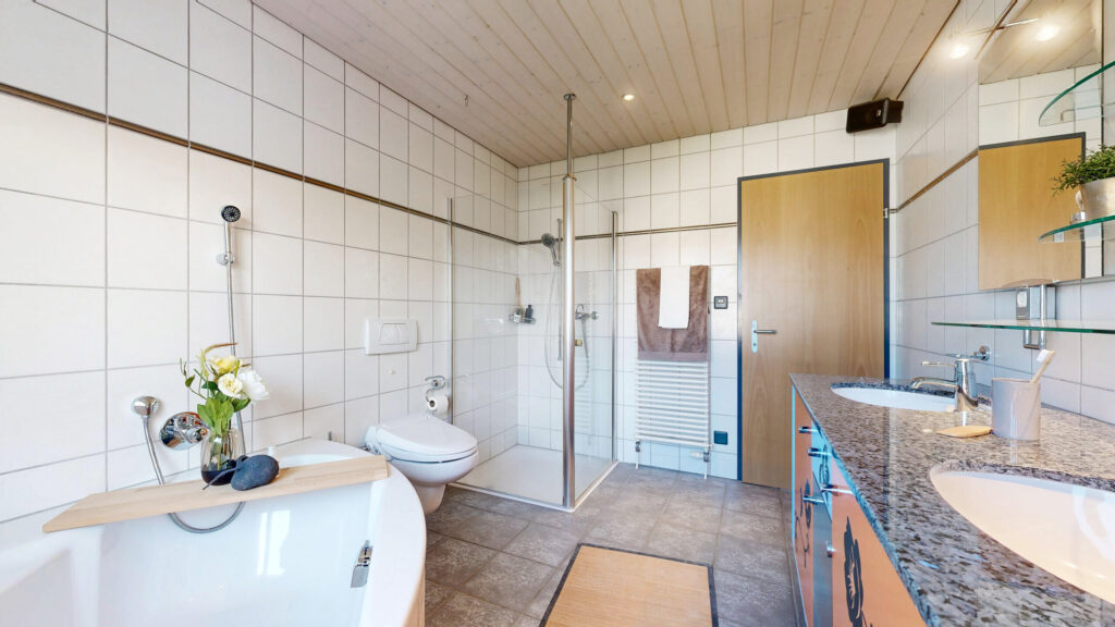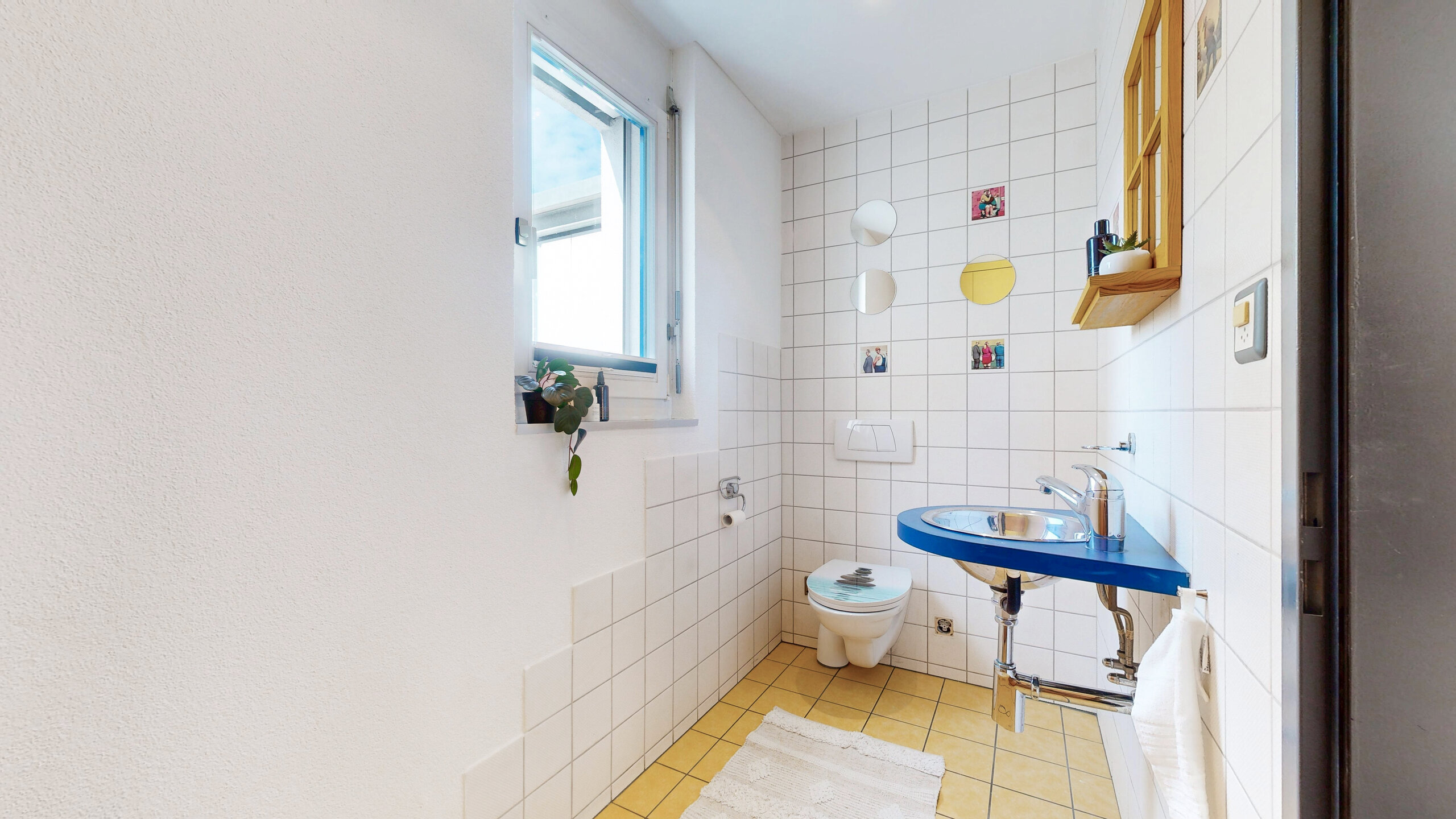 - Nassbereich mit Bad/Dusche/WC im Obergeschoss sowie separate Gästetoilette im Untergeschoss