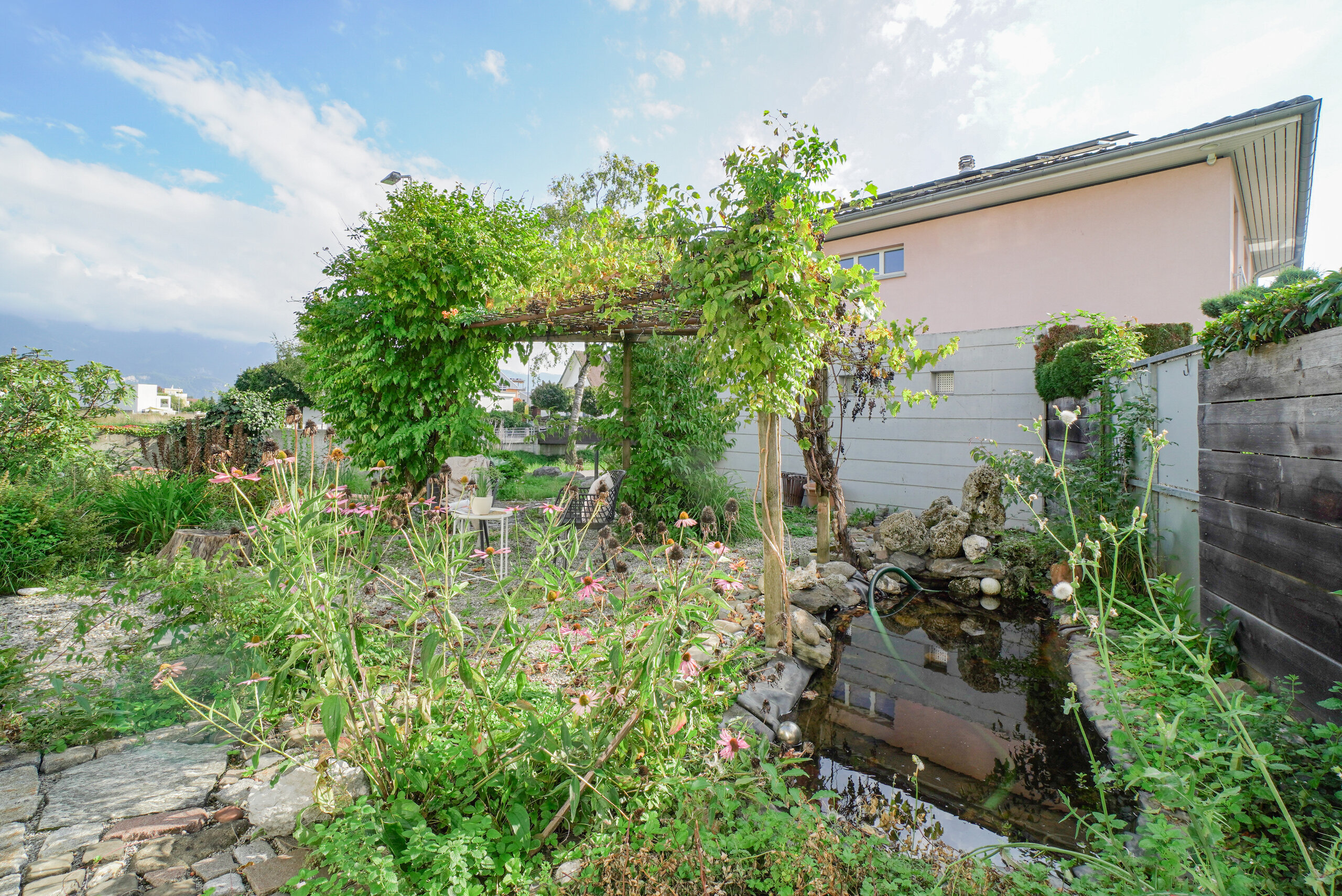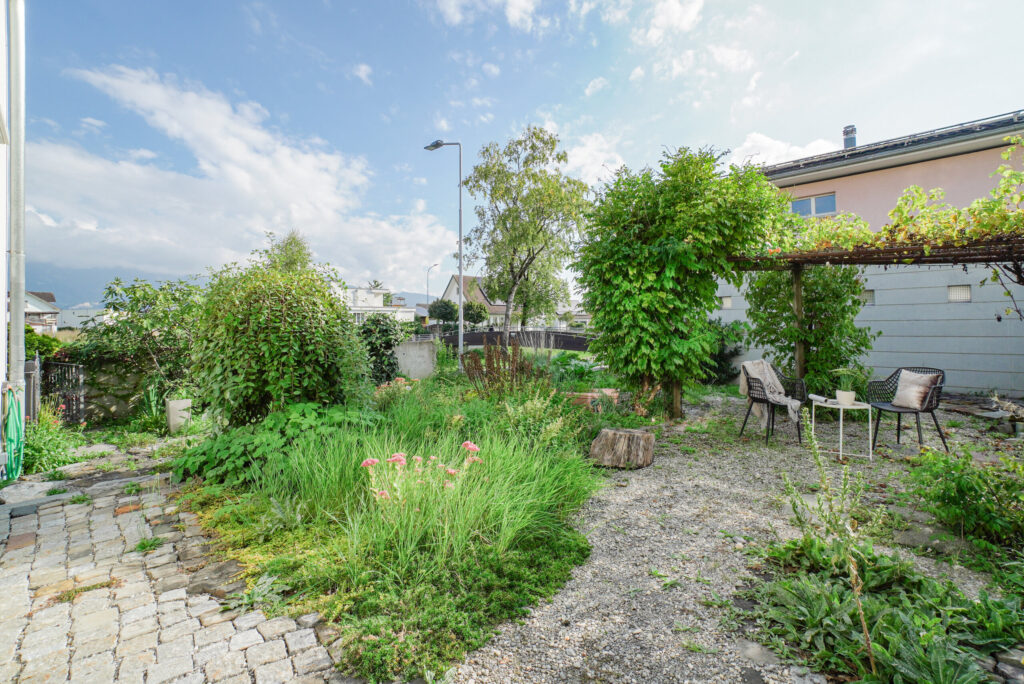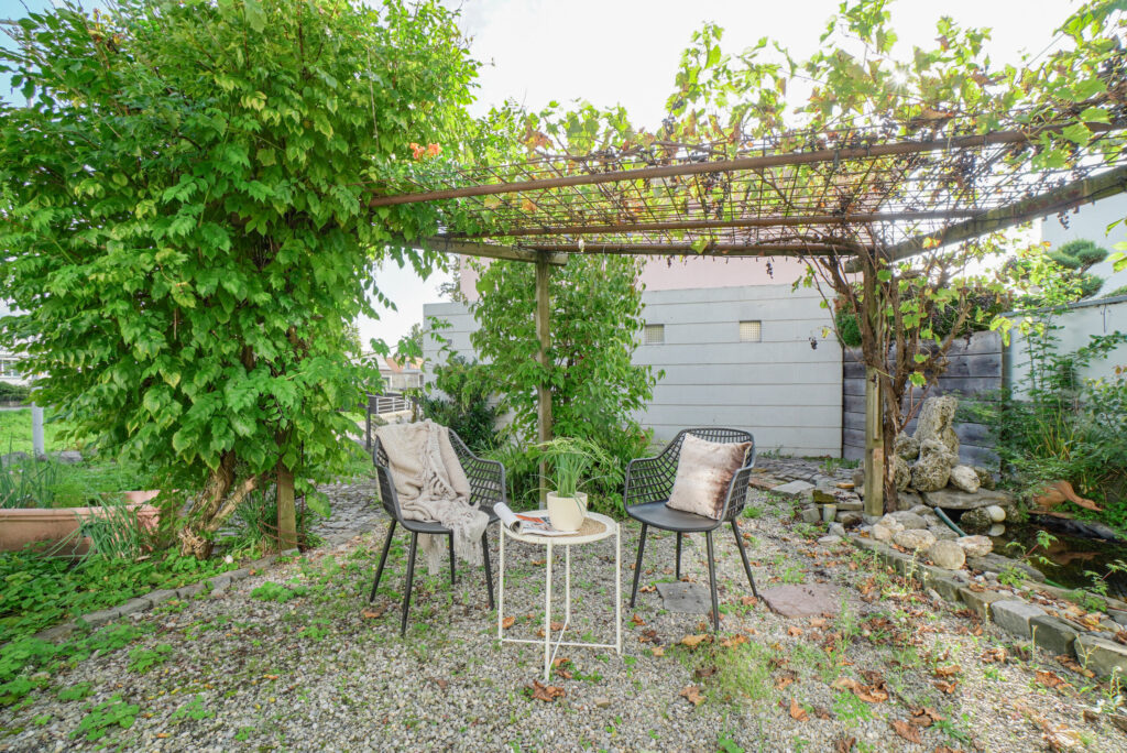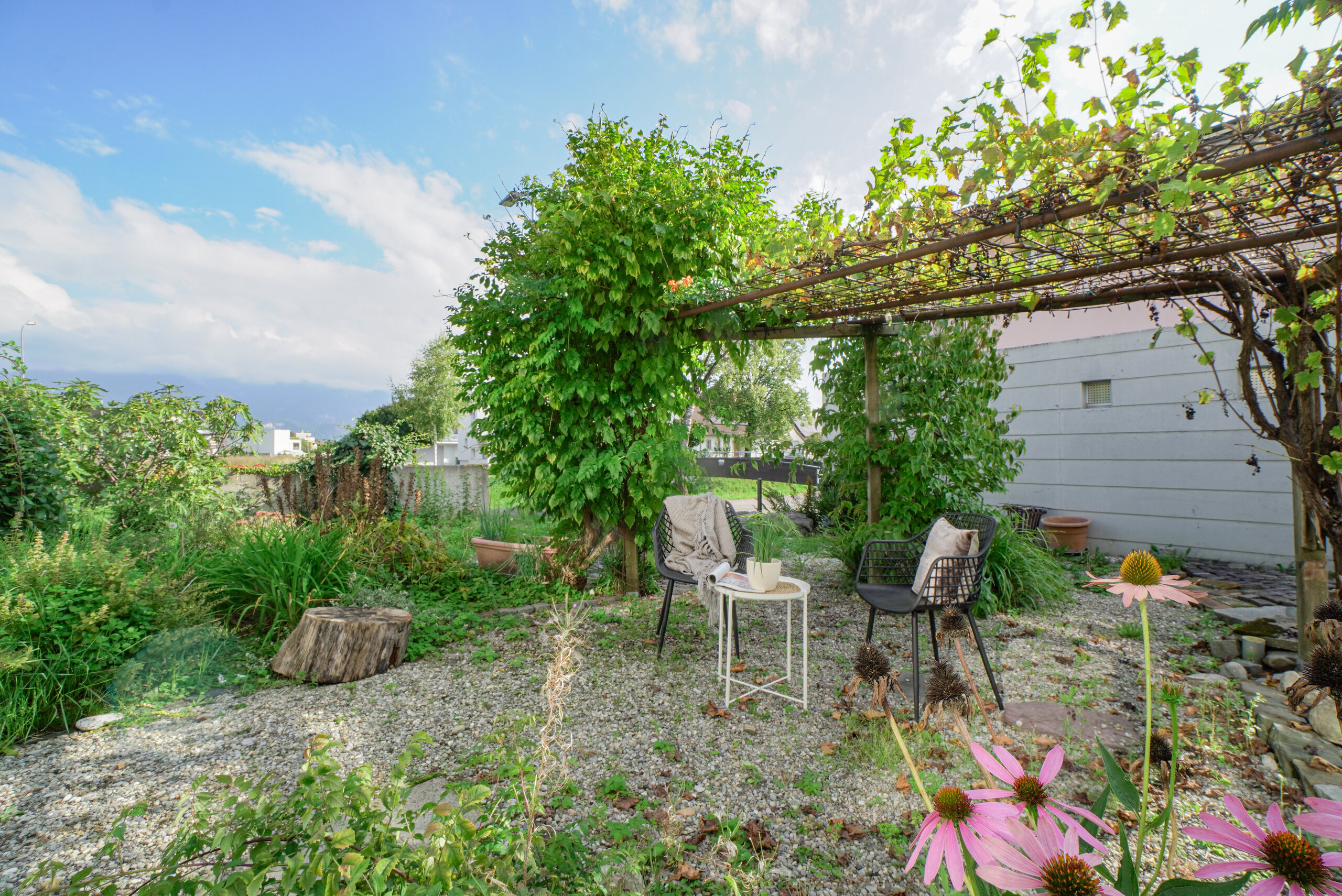 Der Aussenbereich bietet viel Raum für individuelle Gestaltungsmöglichkeiten. Neben einer Pergola und gepflegter Grünfläche bestehen vielfältige Optionen, den Garten nach eigenen Vorstellungen zu nutzen.