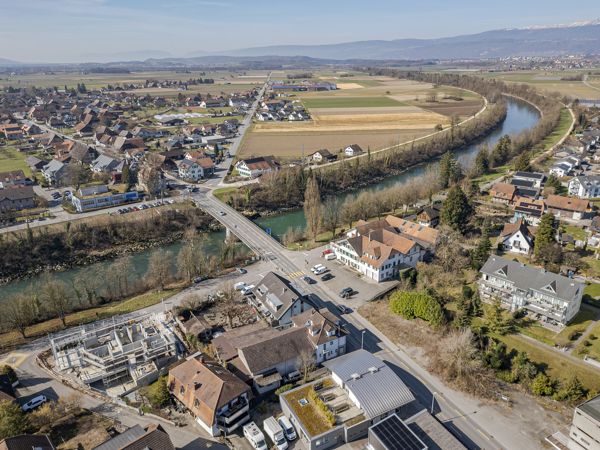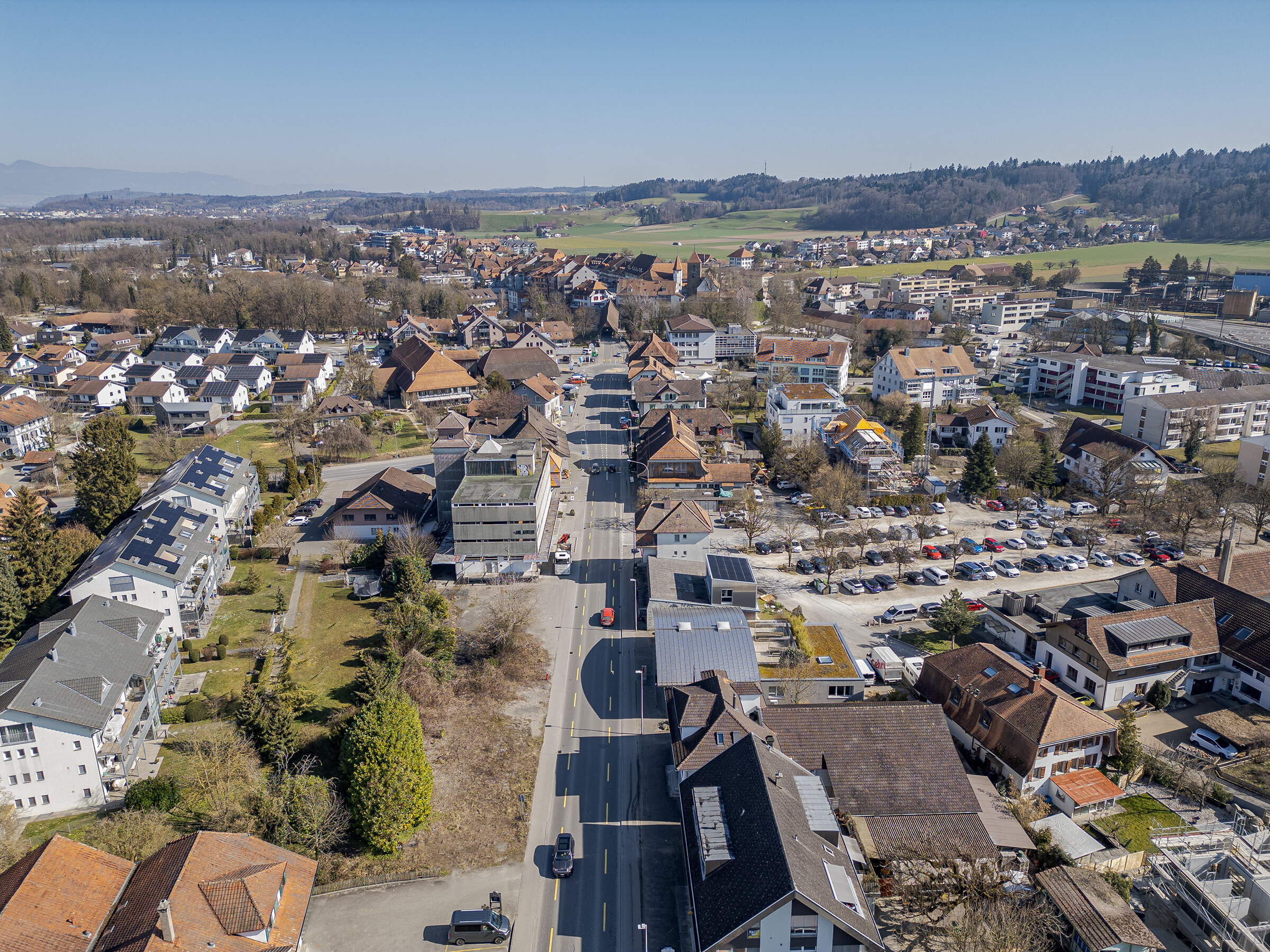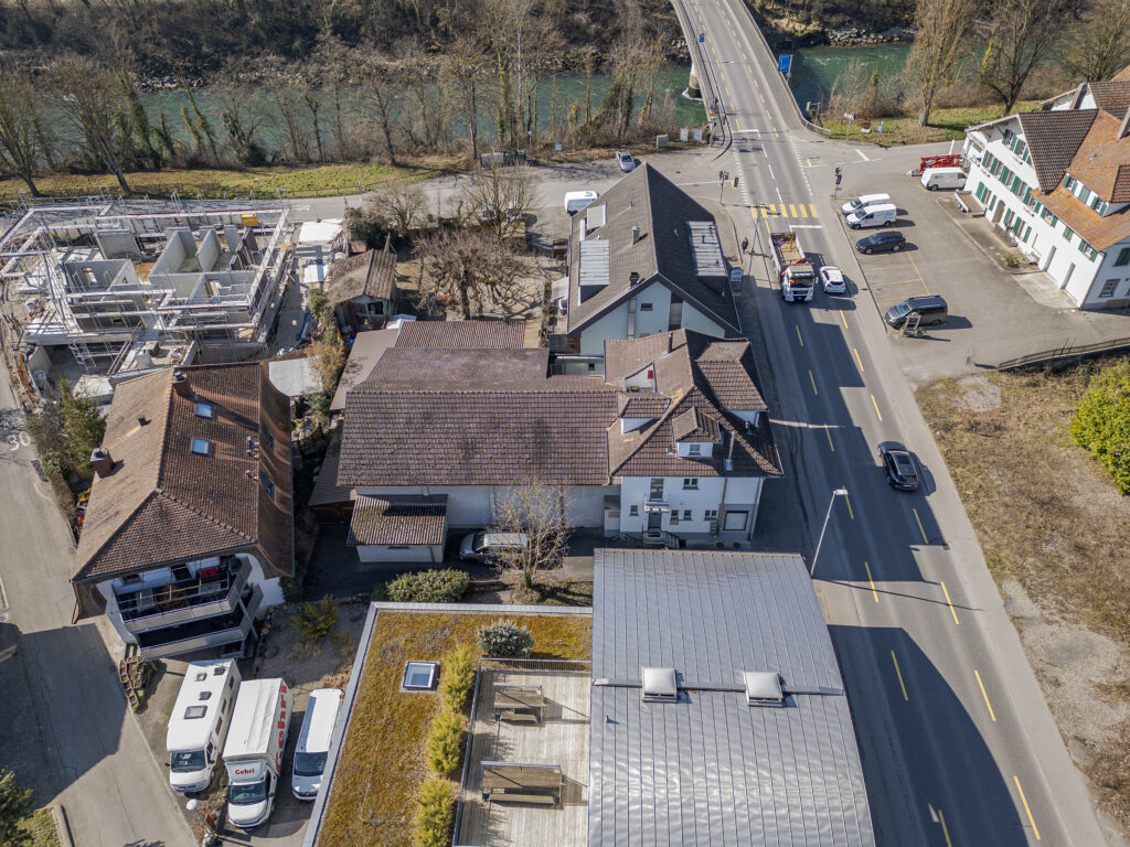 - Wohn- und Gewerbemix: Eine riesige Gewerbefläche, eine 2.5 Zimmer Wohnung und eine 3.5 Zimmer Wohnung mit Balkonen oder Terrasse