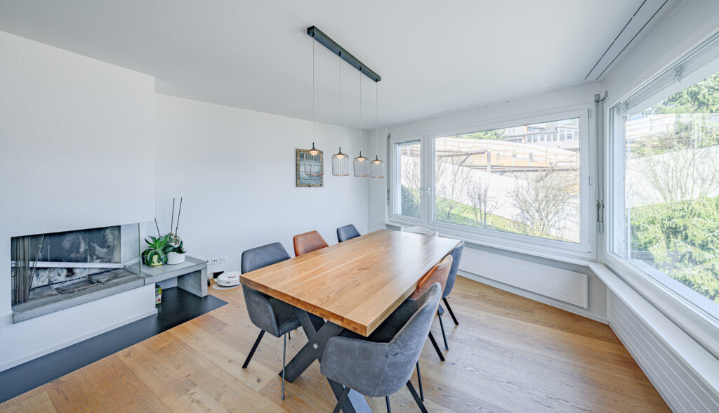 - Wohnbereich: Grosser Wohn- und Essbereich mit gemütlichem Cheminée und direktem Zugang zum Balkon