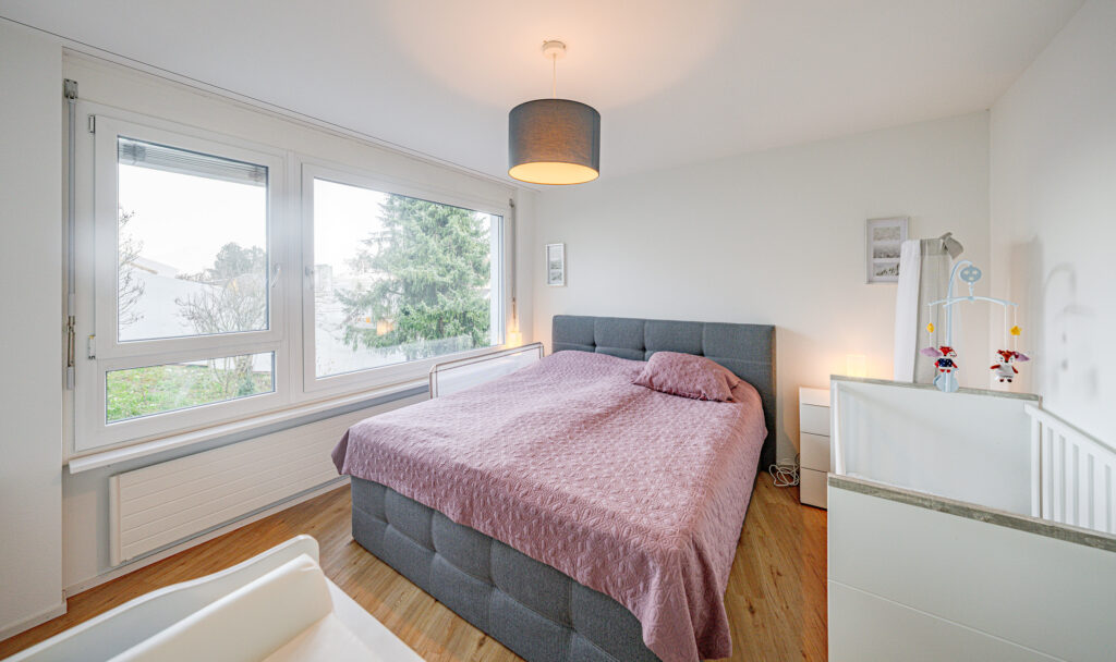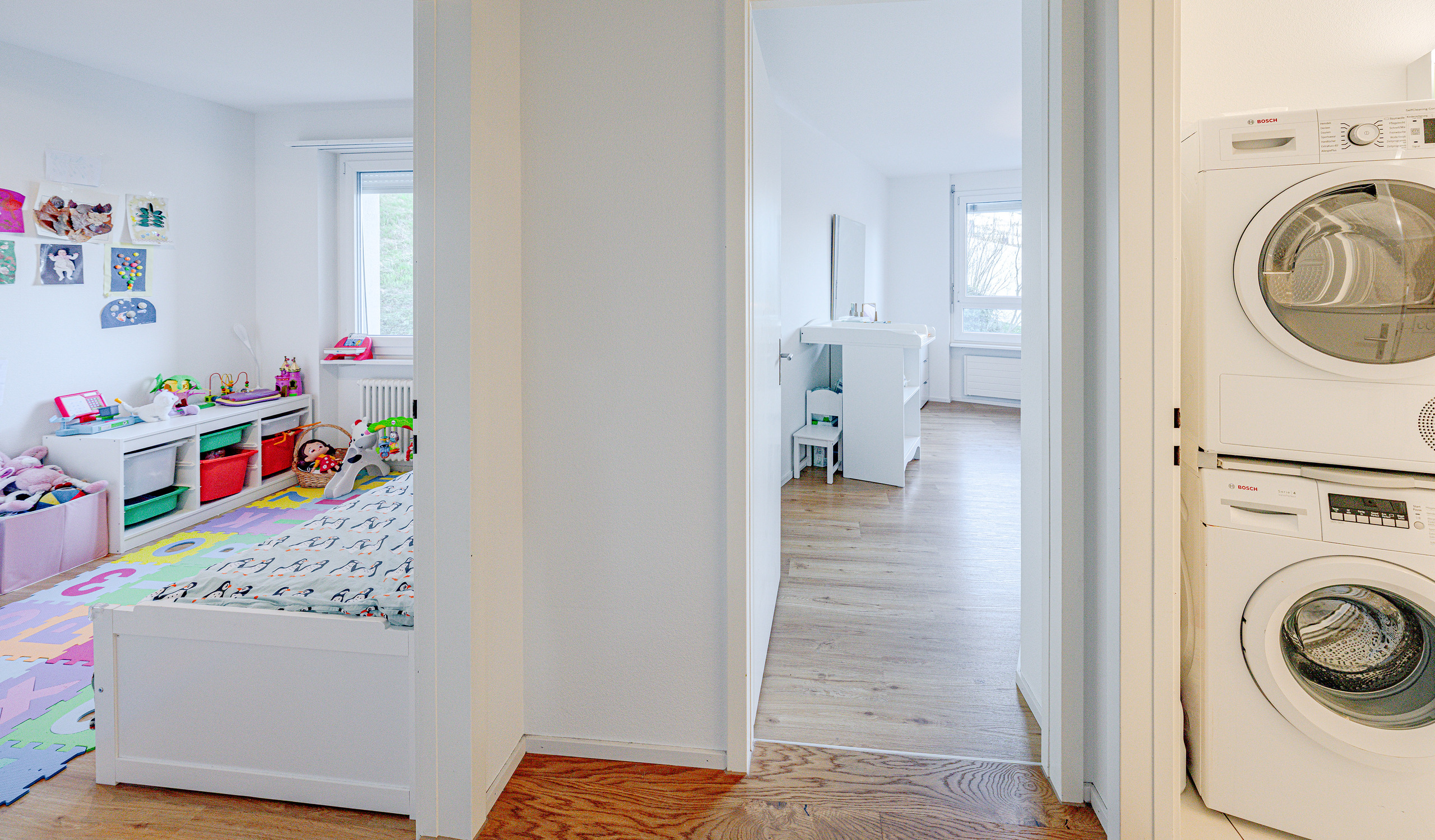 Praktische Nebenräume wie ein eigener Keller, eine gemeinschaftliche Waschküche und ein Veloraum sorgen für zusätzlichen Komfort. Eine Einzelgarage kann bei Bedarf dazu erworben werden.