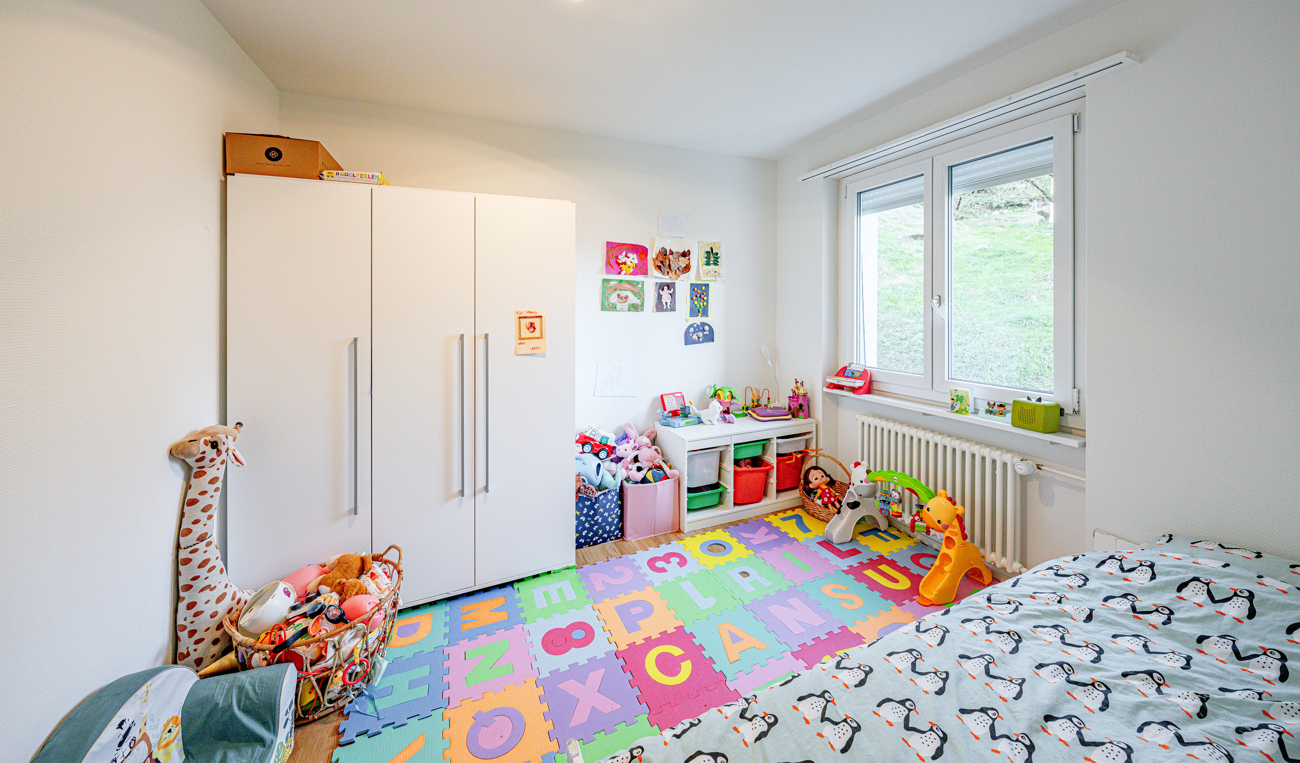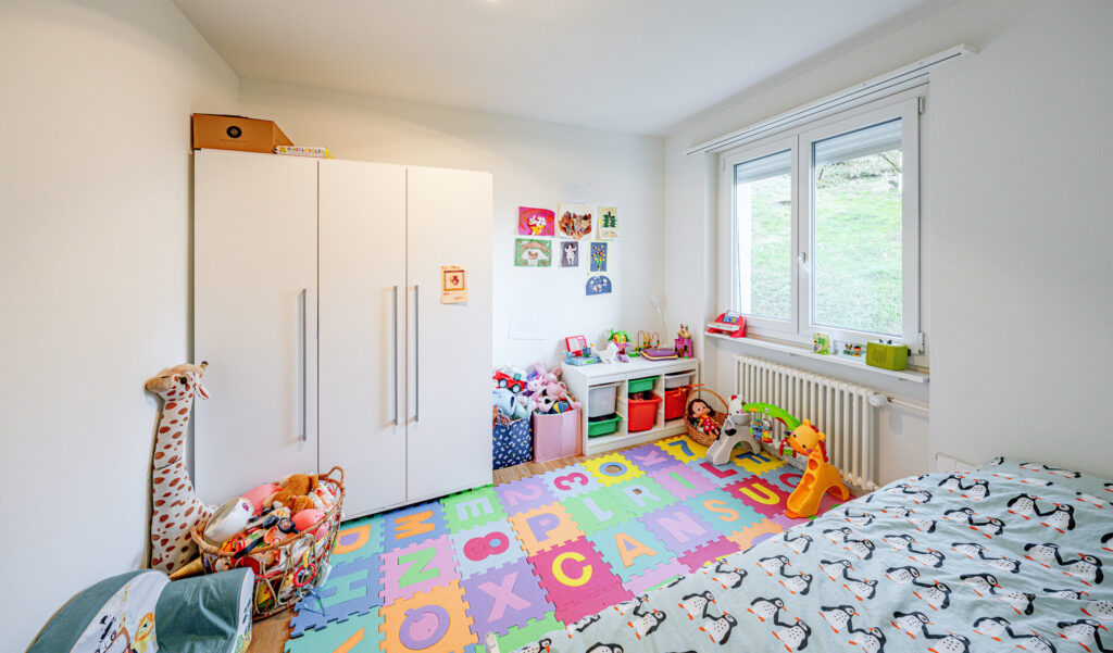 Die 113 m² Wohnfläche verteilen sich auf fünf Zimmer sowie einen grosszügigen Wohn- und Essbereich mit Cheminée. Hier öffnet sich der direkte Zugang zum gedeckten Balkon, von dem aus sich ein spektakulärer Blick auf das Nidwaldner Bergpanorama und den Vierwaldstättersee bietet.