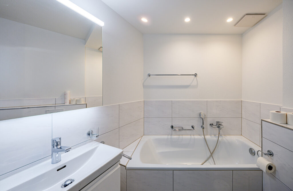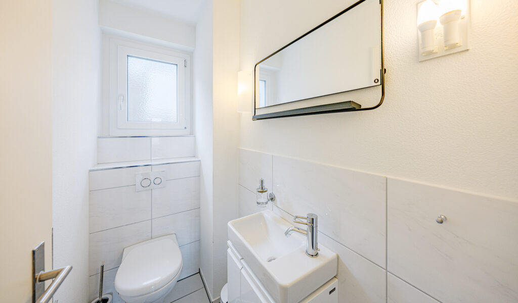 - Gepflegter Nassbereich: Mit Waschturm sowie separate Toilette