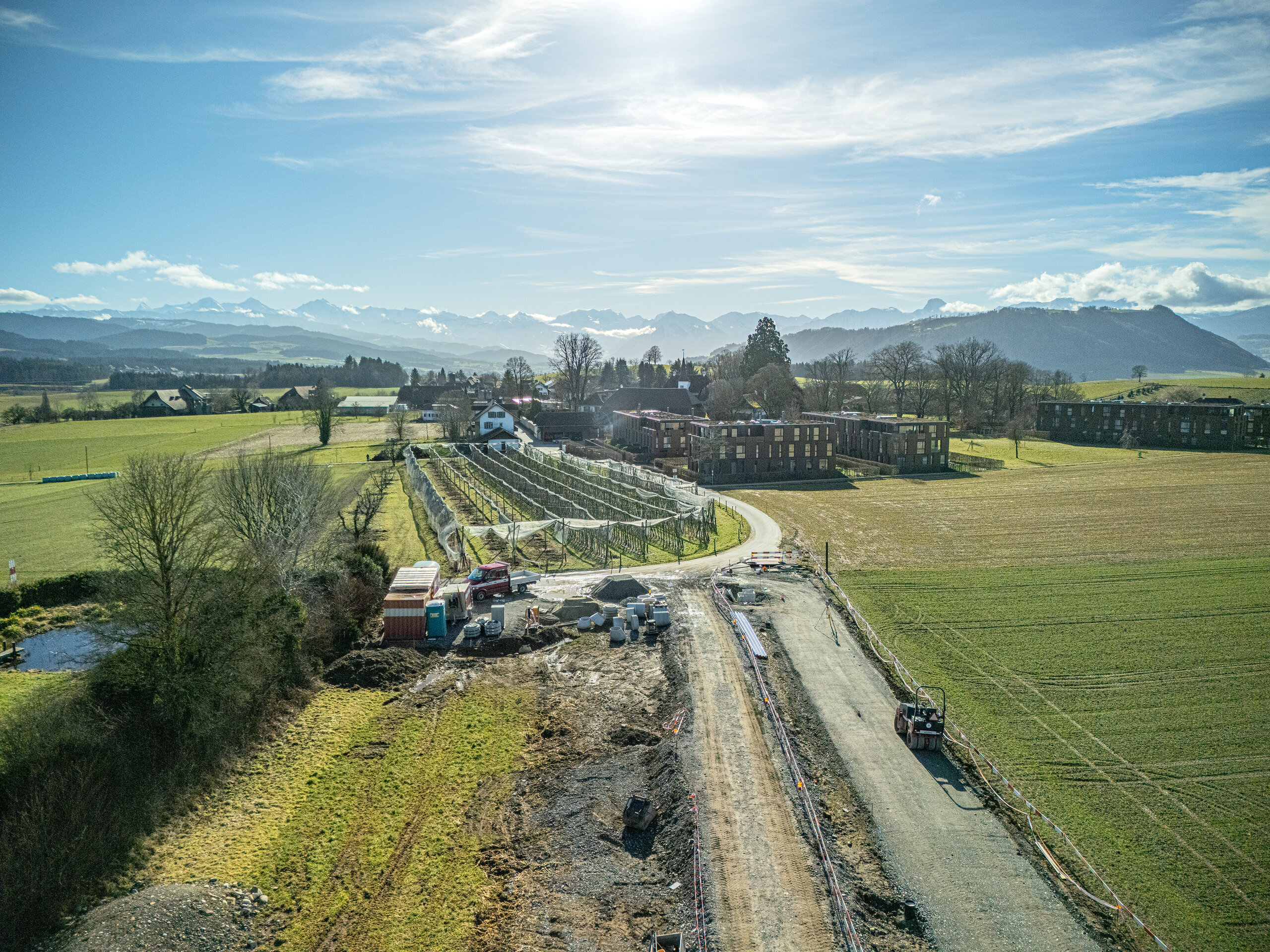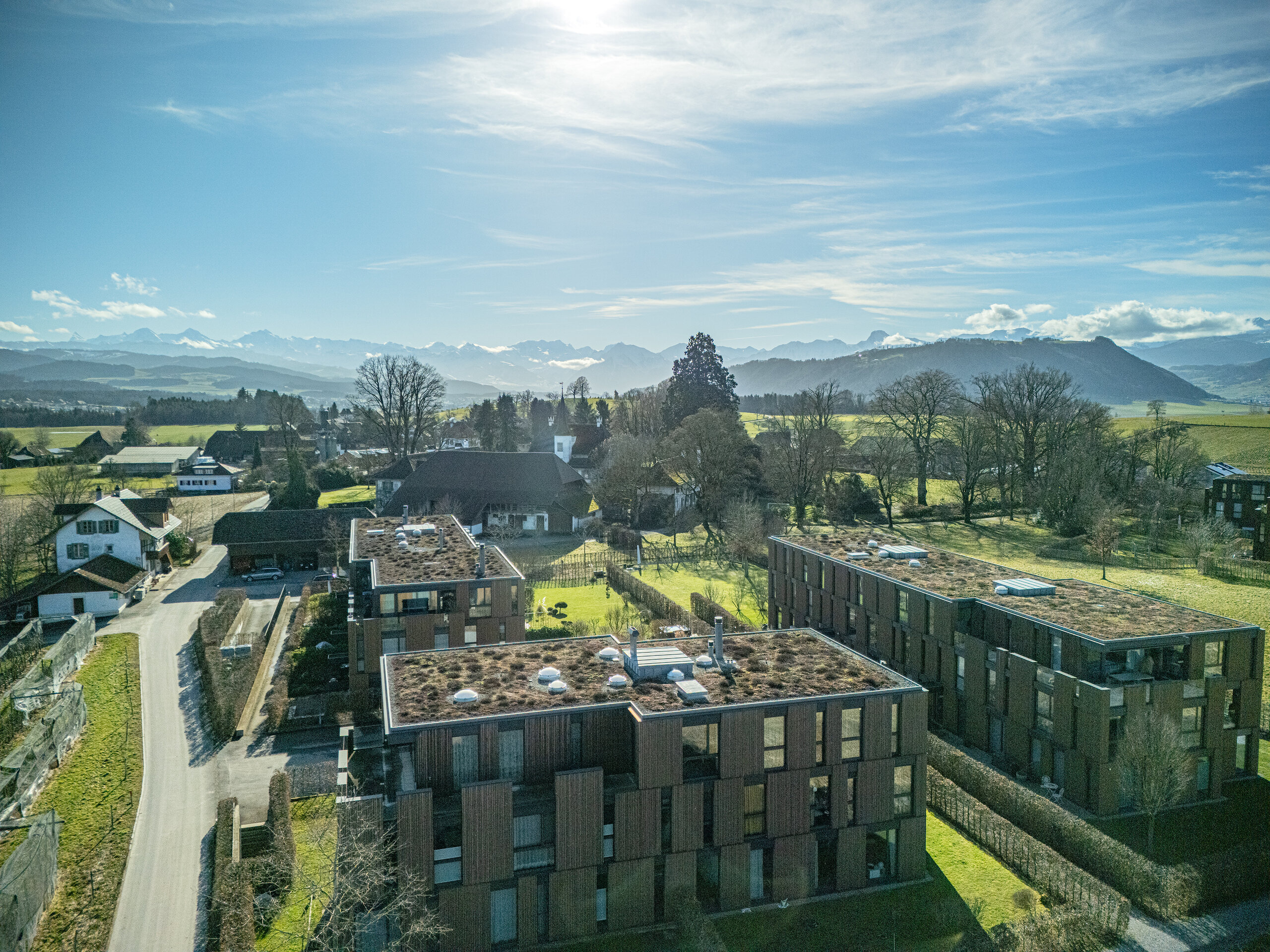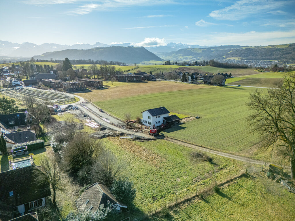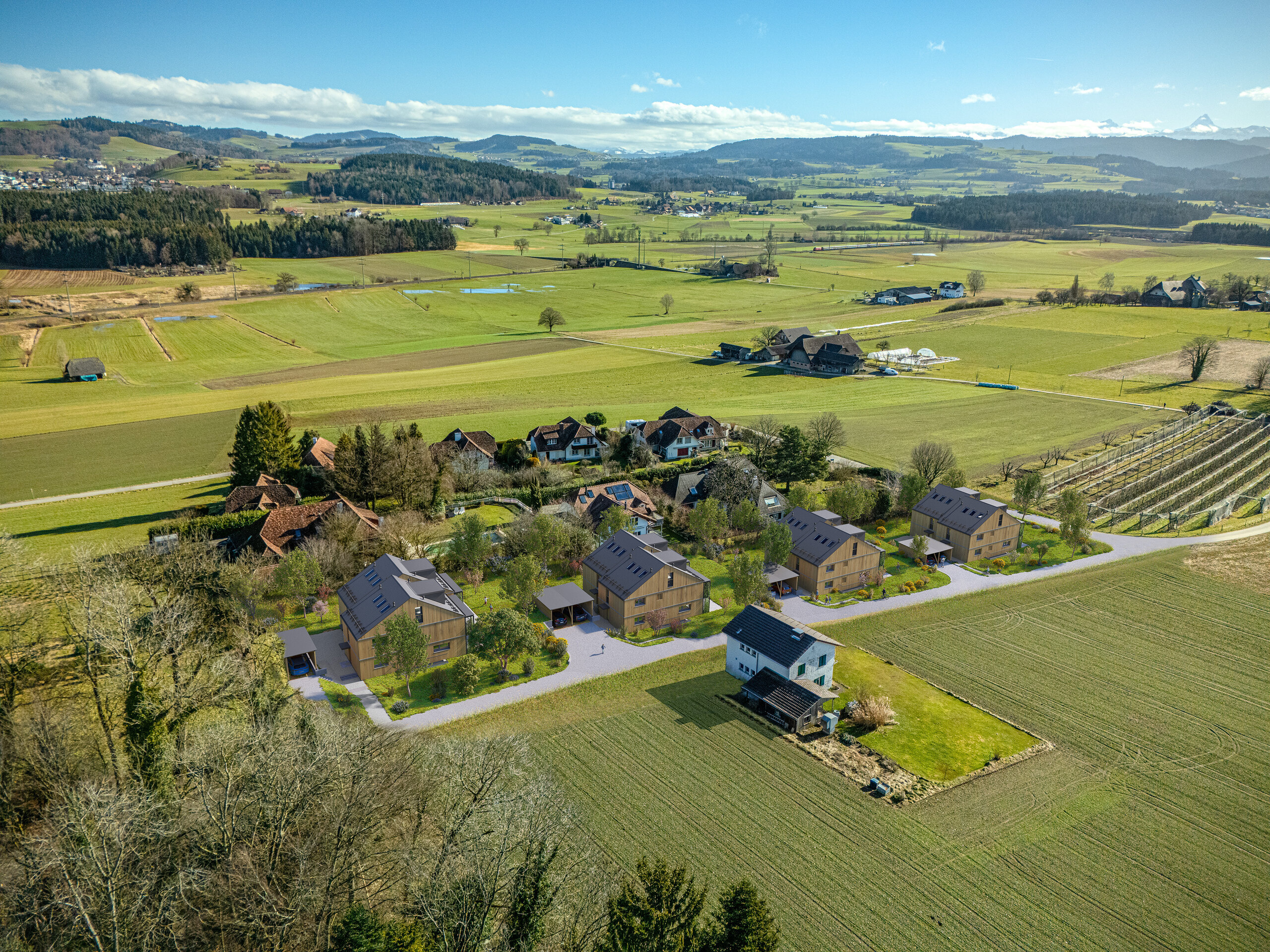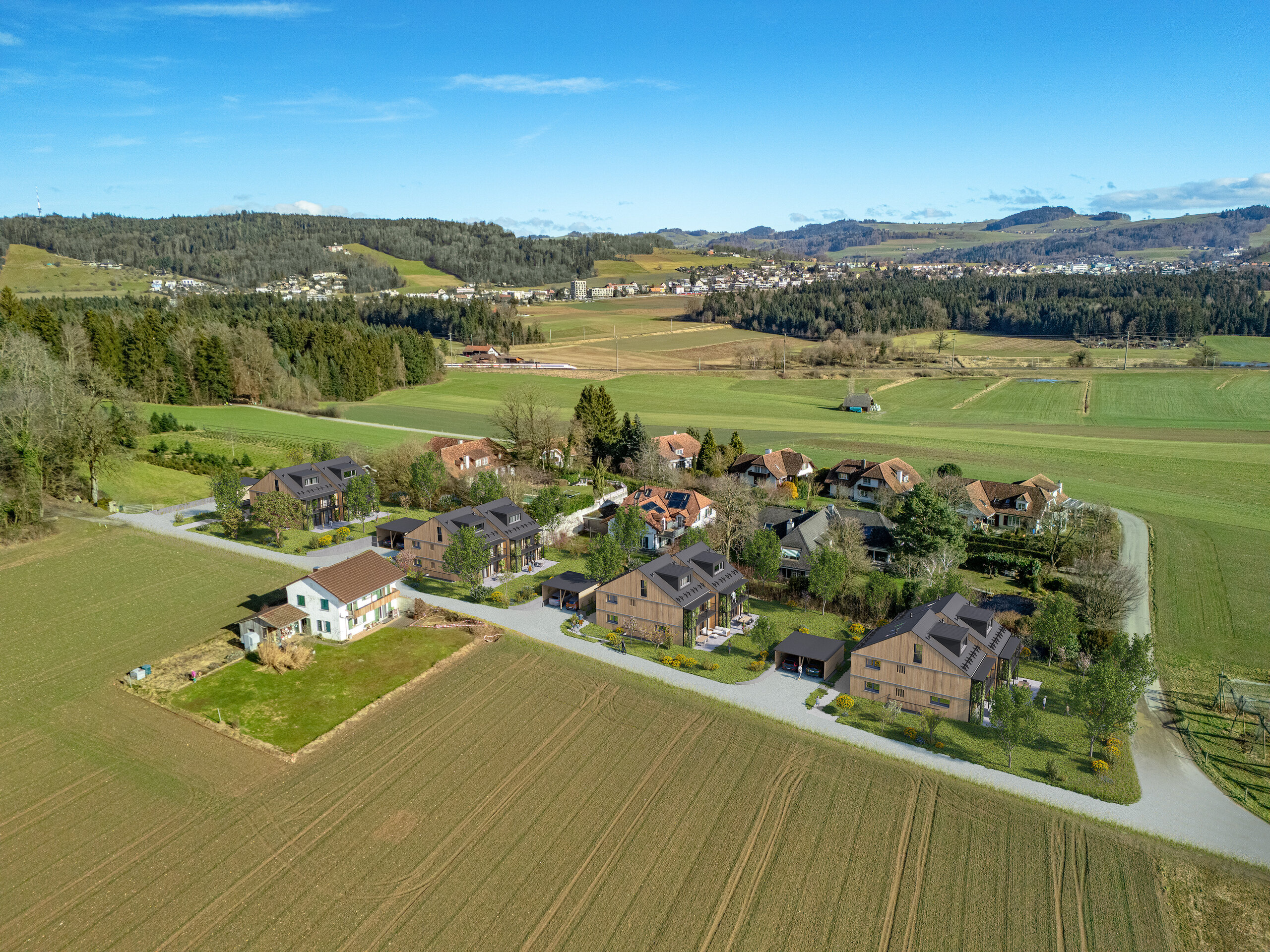 In Allmendingen bei Bern entsteht ein Neubauprojekt mit sechs Einfamilienhäusern, das modernen Wohnkomfort mit ländlicher Idylle verbindet. Statt maximaler Verdichtung setzt das Projekt auf grosszügige Freiräume, eine harmonische Architektur und eine eindrucksvolle Aussicht auf die Voralpen und Alpen. Eine verkehrsberuhigte Spielstrasse schafft zusätzlichen Mehrwert für Familien und sorgt für ein angenehmes Wohnumfeld.