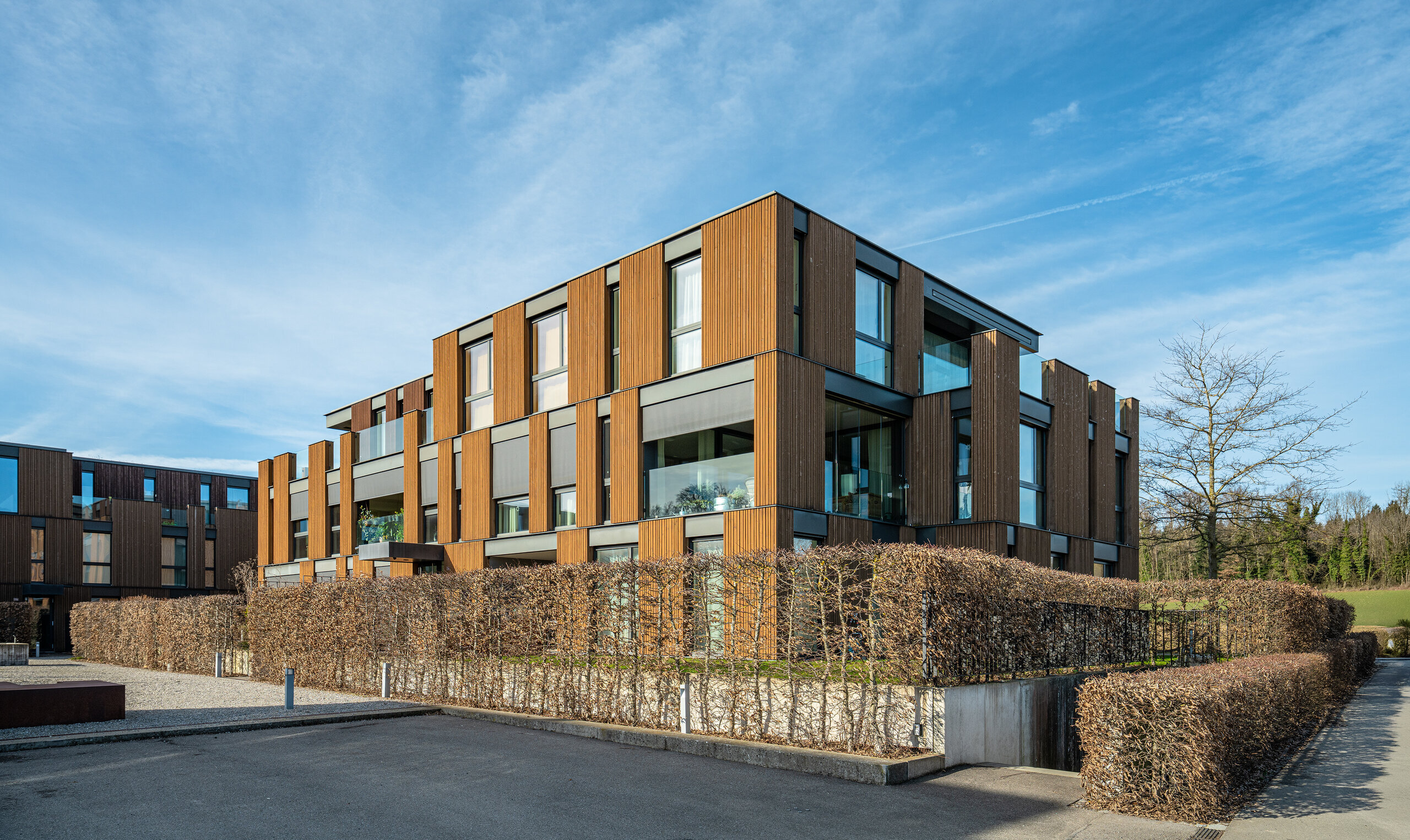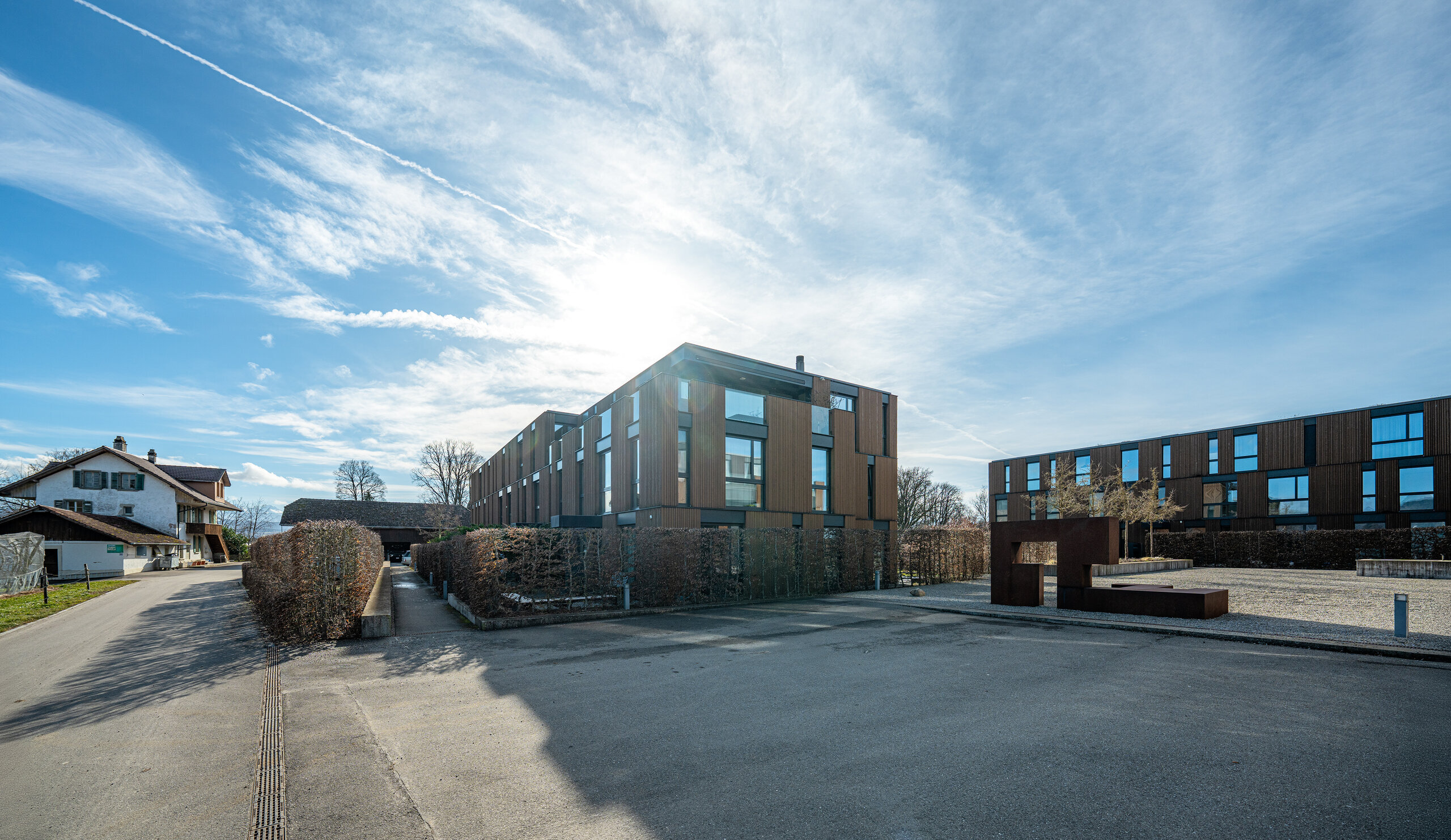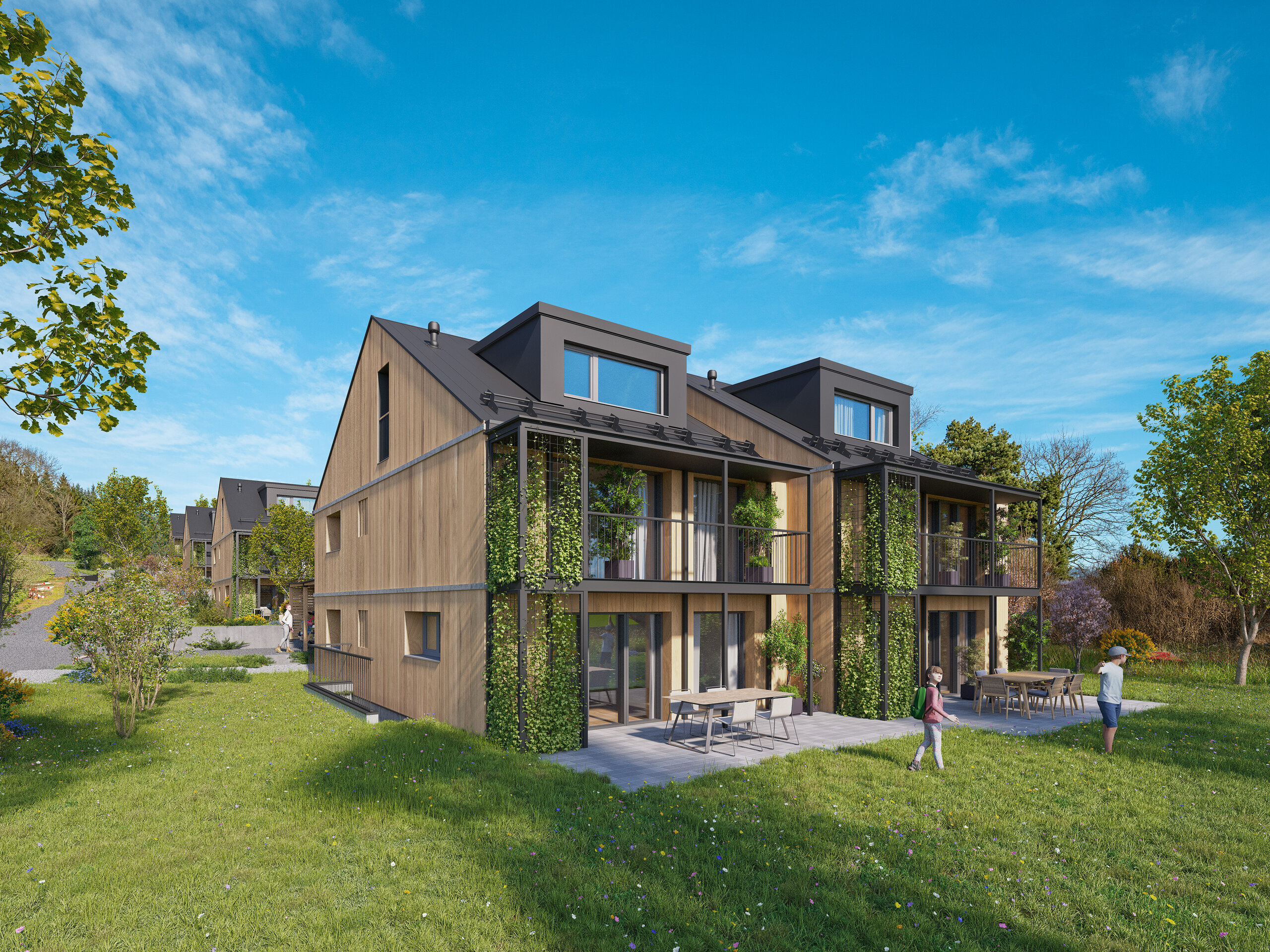 Nachhaltigkeit steht im Zentrum: Holz, Recyclingbeton und natürliche Dämmstoffe prägen die Bauweise, während Photovoltaikanlagen und Wärmepumpen für eine energieeffiziente Versorgung sorgen.