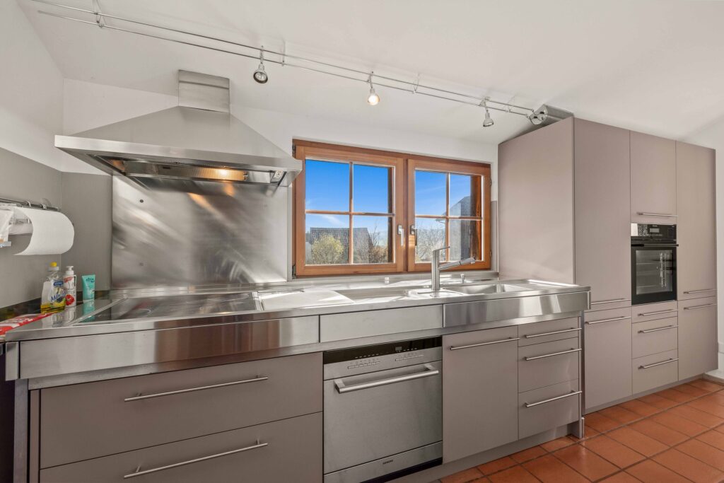 Die 130 m² Gesamtnutzfläche verteilen sich auf 3.5 Zimmer und vier Geschosse. Der offene, helle Wohn- und Essbereich mit gemütlichem Schwedenofen bildet das Herzstück des Hauses. Die geschlossene Küche bietet viel Stauraum und Platz für einen kleinen Esstisch.