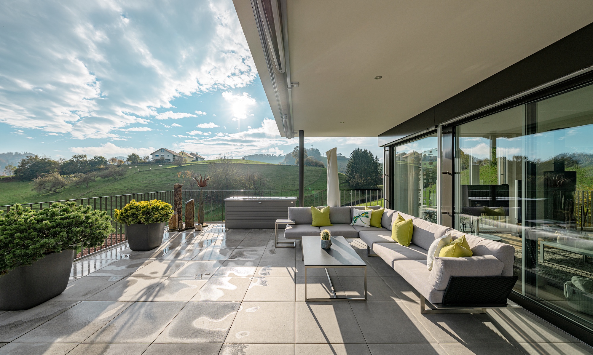 - Riesige, teilweise gedeckte Attikaterrasse mit Sonnenstoren und atemberaubender Weitsicht