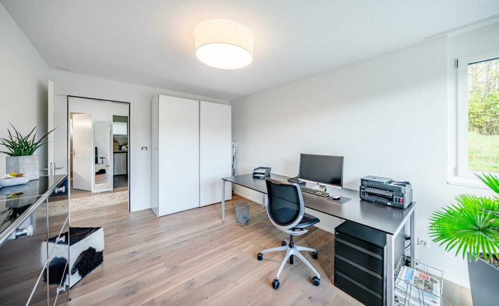 Für zusätzlichen Komfort sorgen ein praktisches Reduit, ein nachhaltiges Heizsystem mit Erdsonde, Bodenheizung und Photovoltaikanlage. Ein grosszügiger Doppeleinstellhallenplatz mit E-Ladestation muss dazu erworben werden.