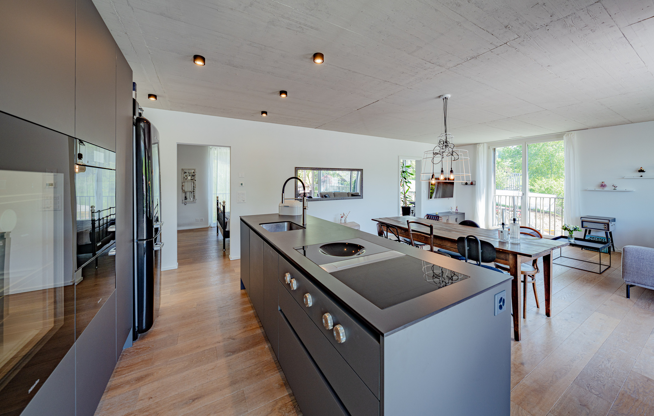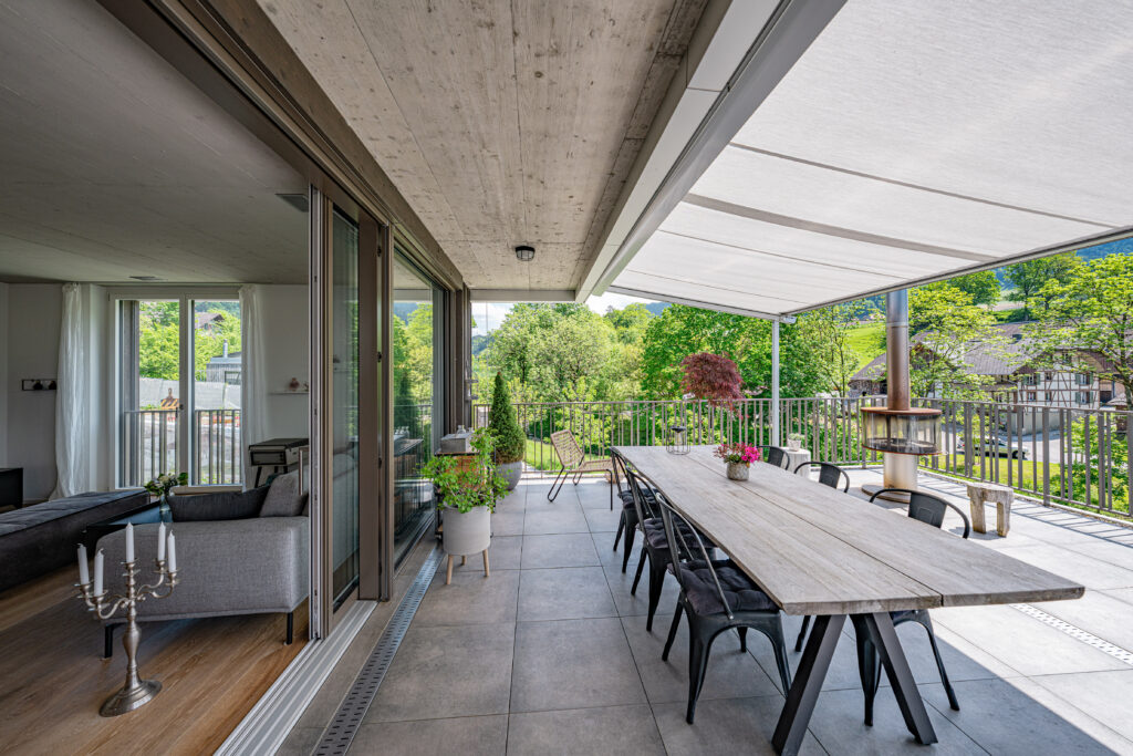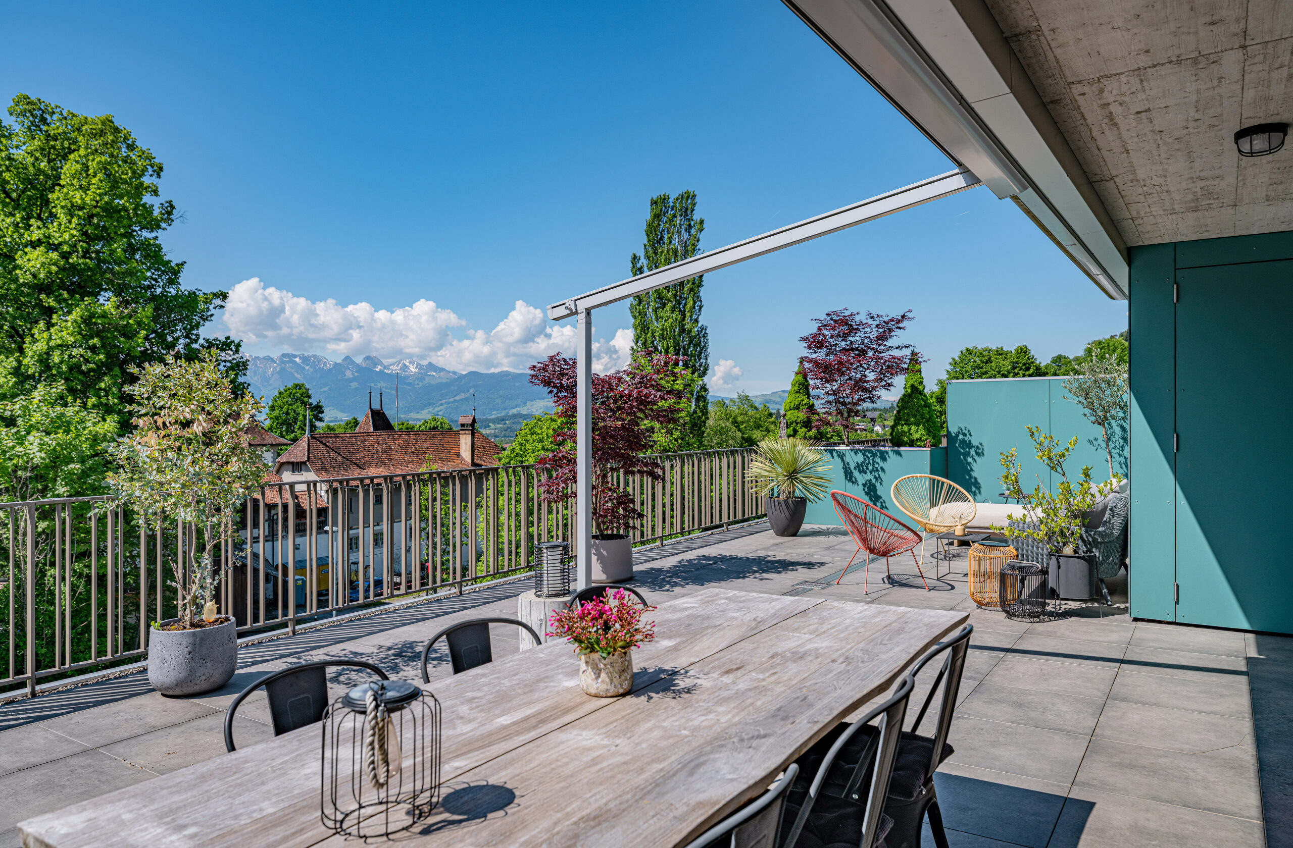 Der offene, lichtdurchflutete Wohn- und Essbereich mit bodentiefen Fensterfronten schafft ein helles, freundliches Ambiente und führt direkt auf die 72 m² grosse Terrasse. Diese erweitert den Wohnraum ins Freie und bietet reichlich Platz für Lounge, Essbereich und Pflanzen – verbunden mit herrlicher Weitsicht auf das Oberdiessbacher Schloss und die Berge.