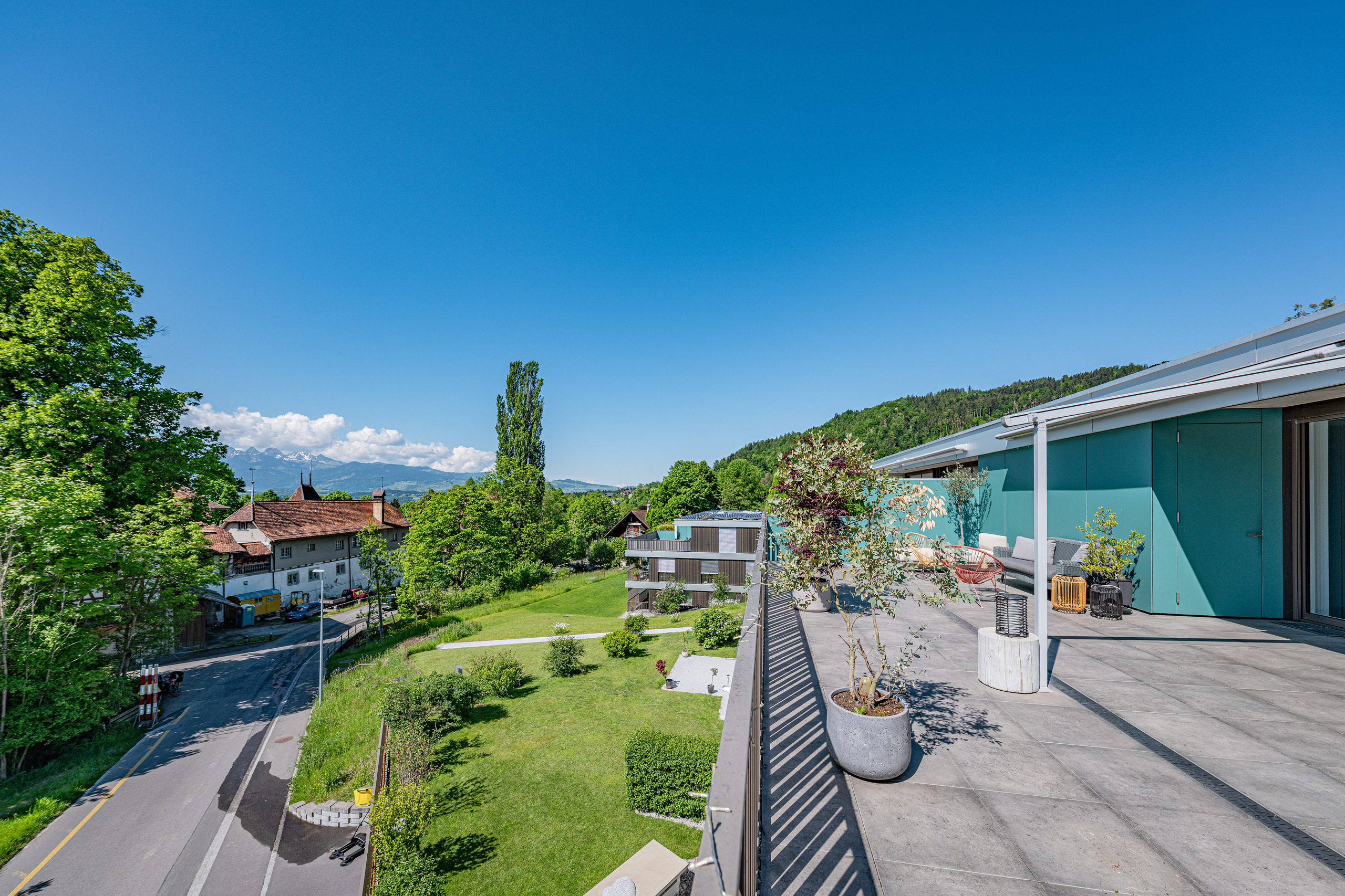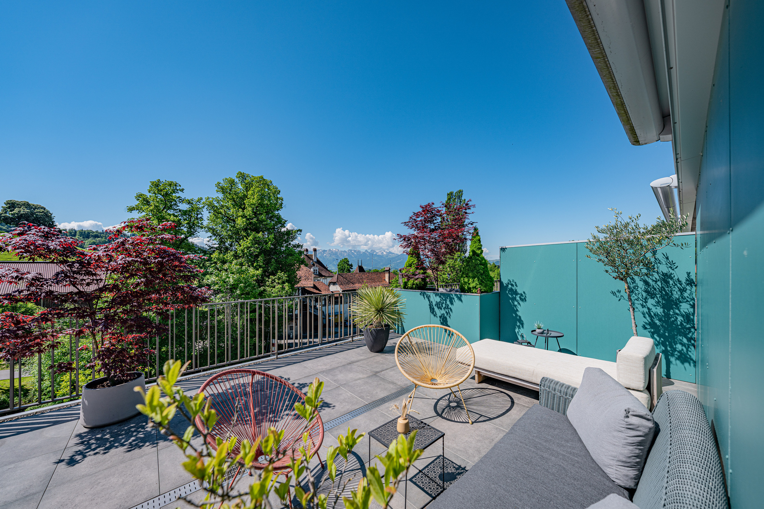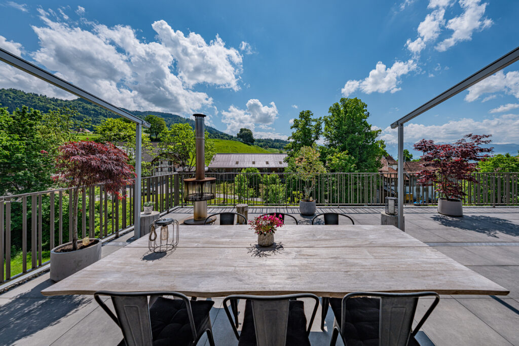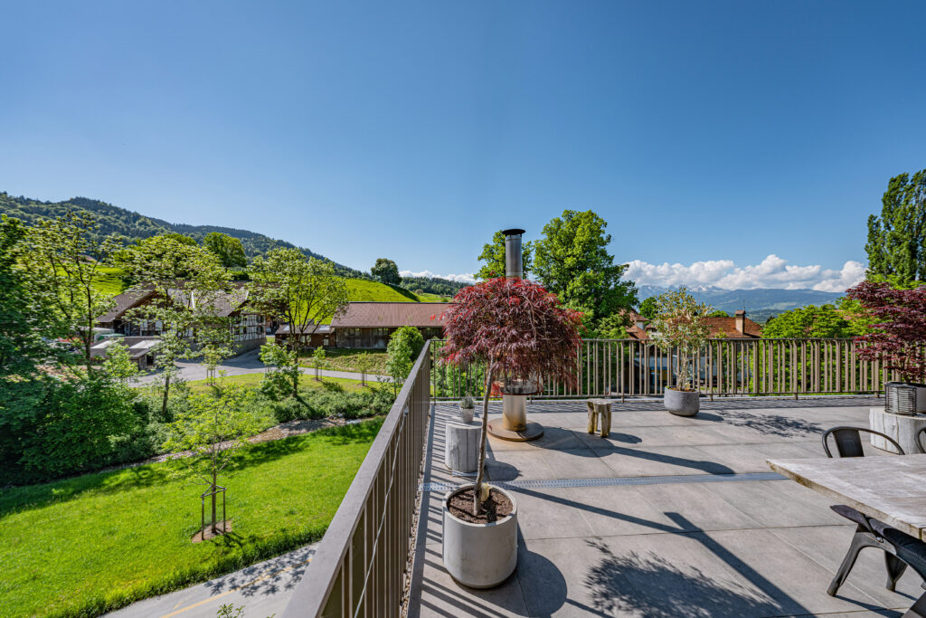 • Grosse Terrasse mit 72 m² und Weitsicht auf das Oberdiessbacher Schloss und die Berge
