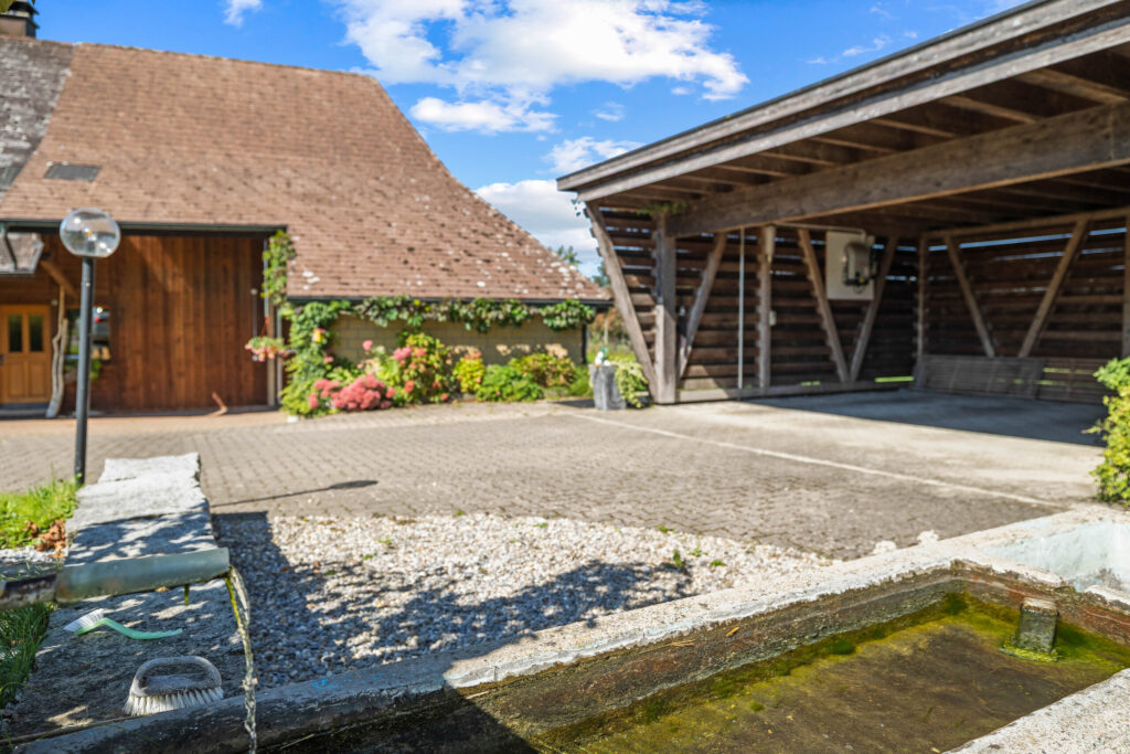 Ein separater Gebäudeteil eröffnet vielseitige Nutzungsmöglichkeiten, beispielsweise für die Haltung von Kleintieren. Auch die Parksituation überzeugt: Ein Carport für zwei Fahrzeuge sowie zusätzliche Aussenabstellplätze stehen zur Verfügung.