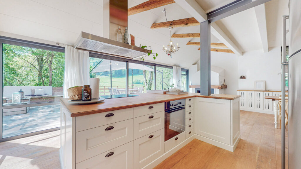 • Küche: Offene Küche mit viel Stauraum und Platz für einen Esstisch