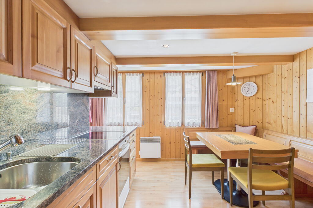 - Geschlossene Küche mit Platz für einen Esstisch und Zugang zum Wohnbereich