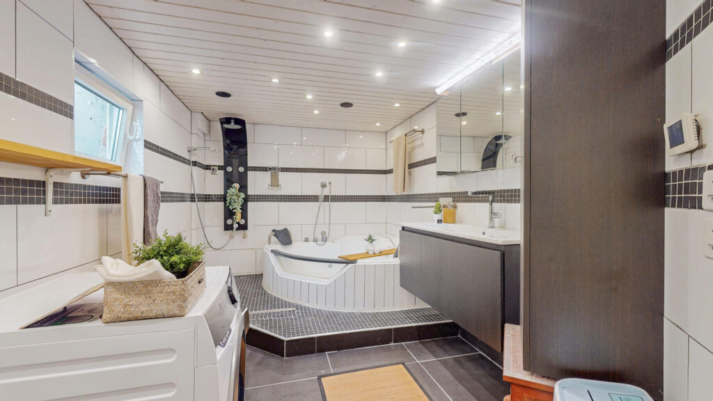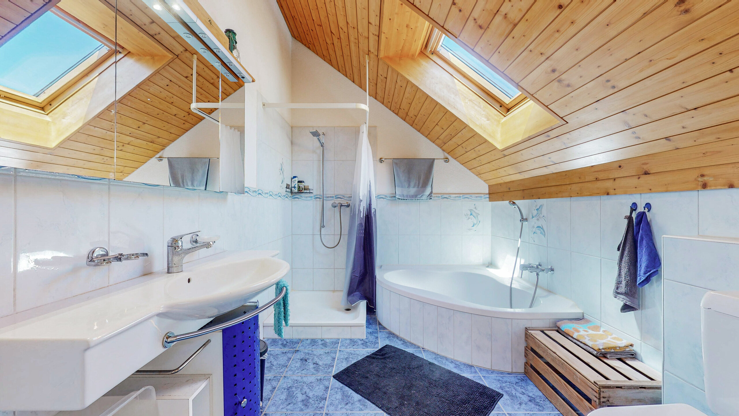- Nassbereich: Wellnesskomfort dank eingebauter Badewanne mit Jacuzzi im Untergeschoss
