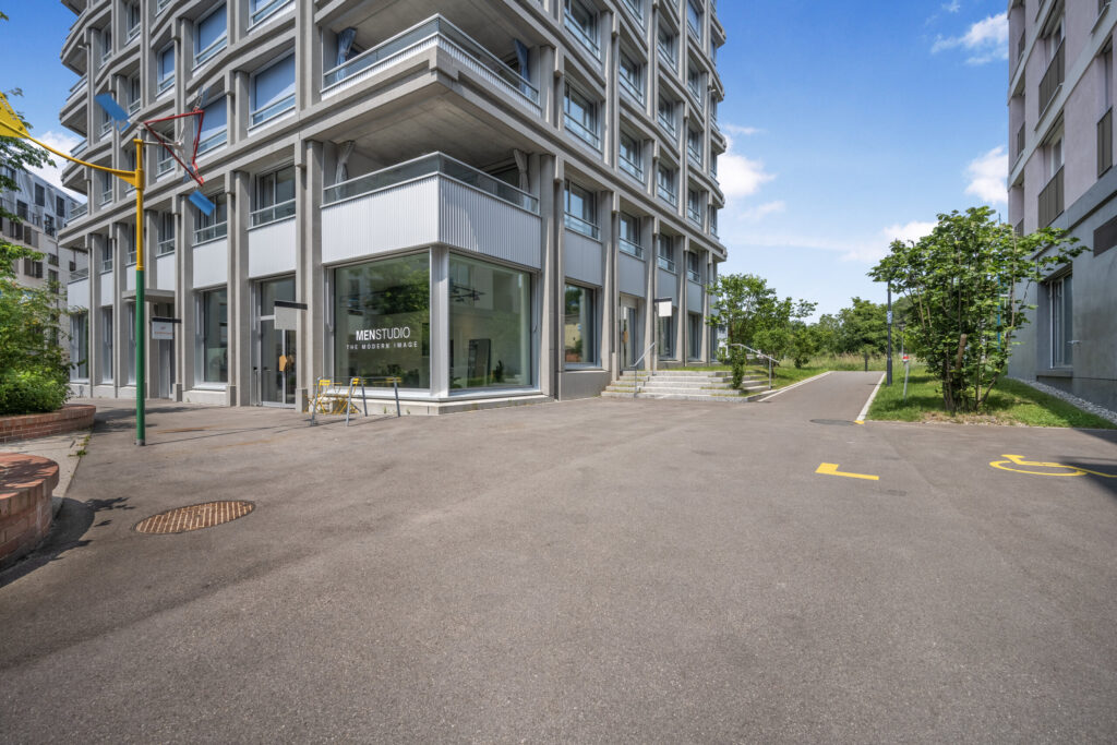 Der Zugang erfolgt direkt über separate Aussentüren zur Piazza – ein klarer Vorteil für Sichtbarkeit und Erreichbarkeit. Für die Parkierung stehen ein optionaler Einstellhallenplatz sowie zusätzliche Besucherparkplätze zur Verfügung.