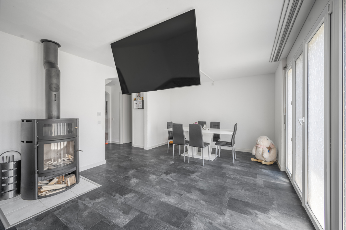 - Wohn- und Essbereich: Offener und heller Wohn- und Essbereich mit gemütlichem Schwedenofen und direktem Zugang zur Terrasse und Garten