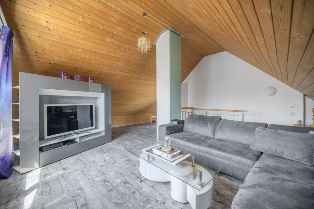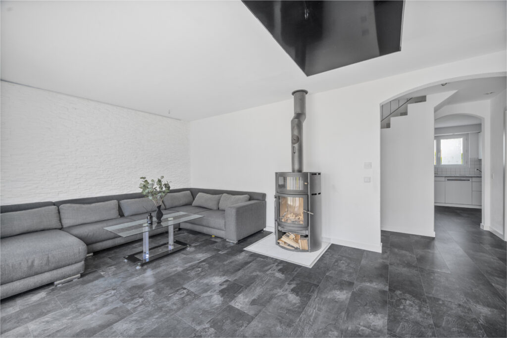 Das Herzstück bildet der helle Wohn- und Essbereich mit Schwedenofen, der direkten Zugang zur sonnigen Terrasse und zum Garten bietet. Die grosszügige Küche ist mit modernen Geräten ausgestattet, bietet viel Stauraum und lädt zum gemeinsamen Kochen ein. Im ausgebauten Dachgeschoss steht ein vielseitig nutzbarer Raum zur Verfügung, der sich perfekt als Büro, Atelier oder Rückzugsort eignet.
