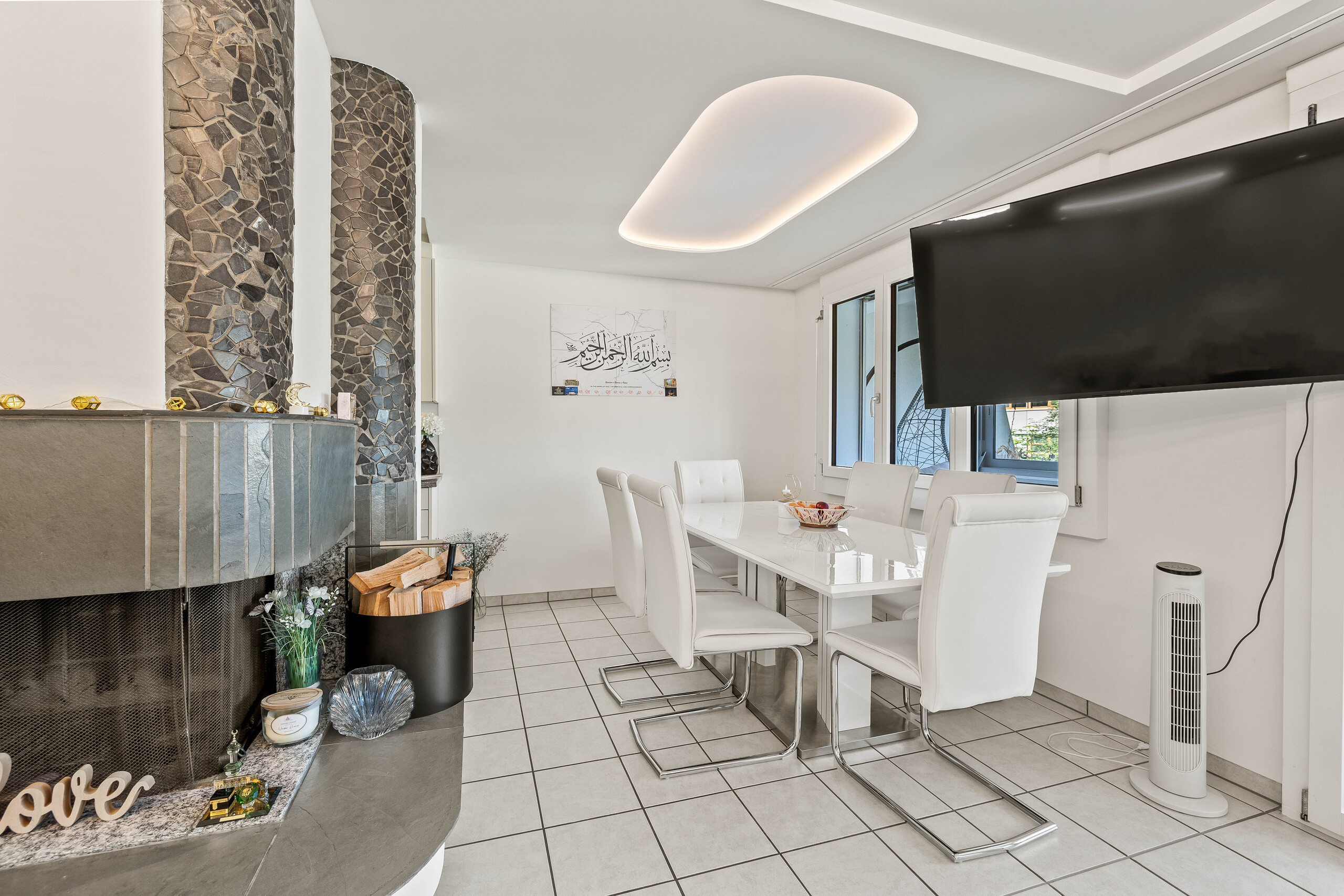Der lichtdurchflutete Wohn- und Essbereich öffnet sich direkt zum Wintergarten, der als gemütliche Leseecke, stilvoller Essbereich oder kleines Pflanzenparadies genutzt werden kann. Im Wohnzimmer sorgen moderne Deckenbeleuchtung und ein Cheminée für ein besonders behagliches Wohngefühl, das zeitgemässe Ausstattung mit klassischem Charme vereint.