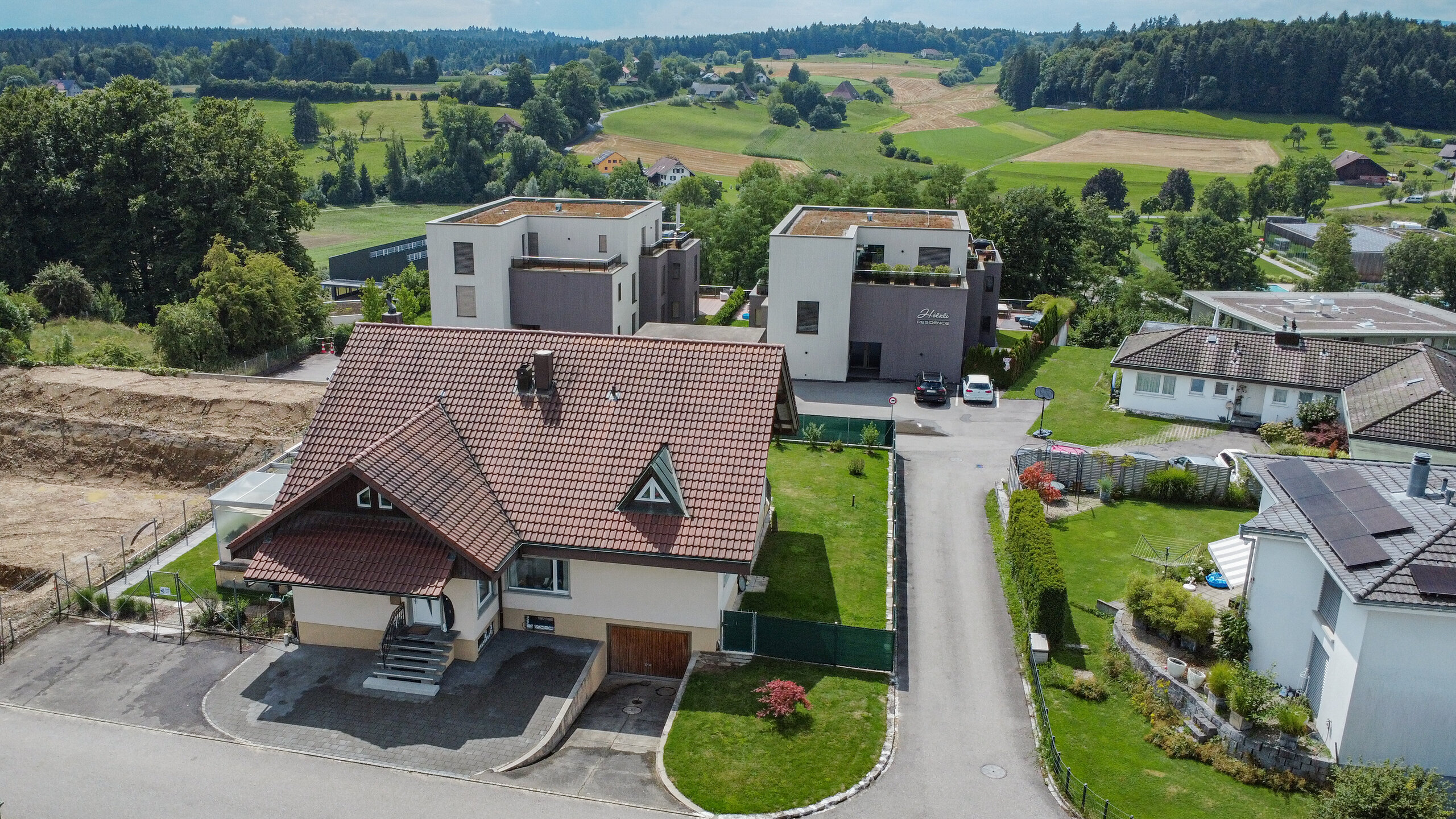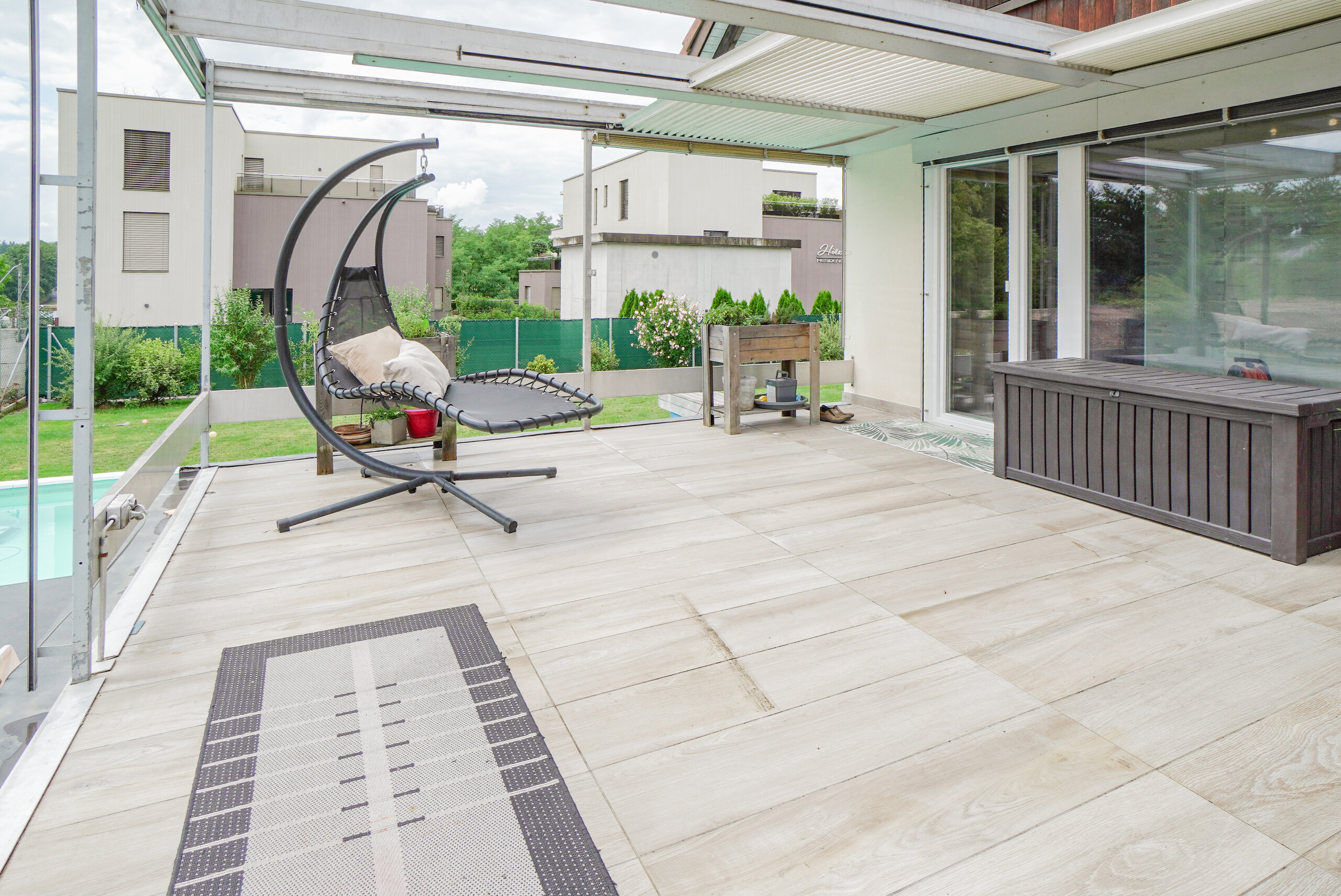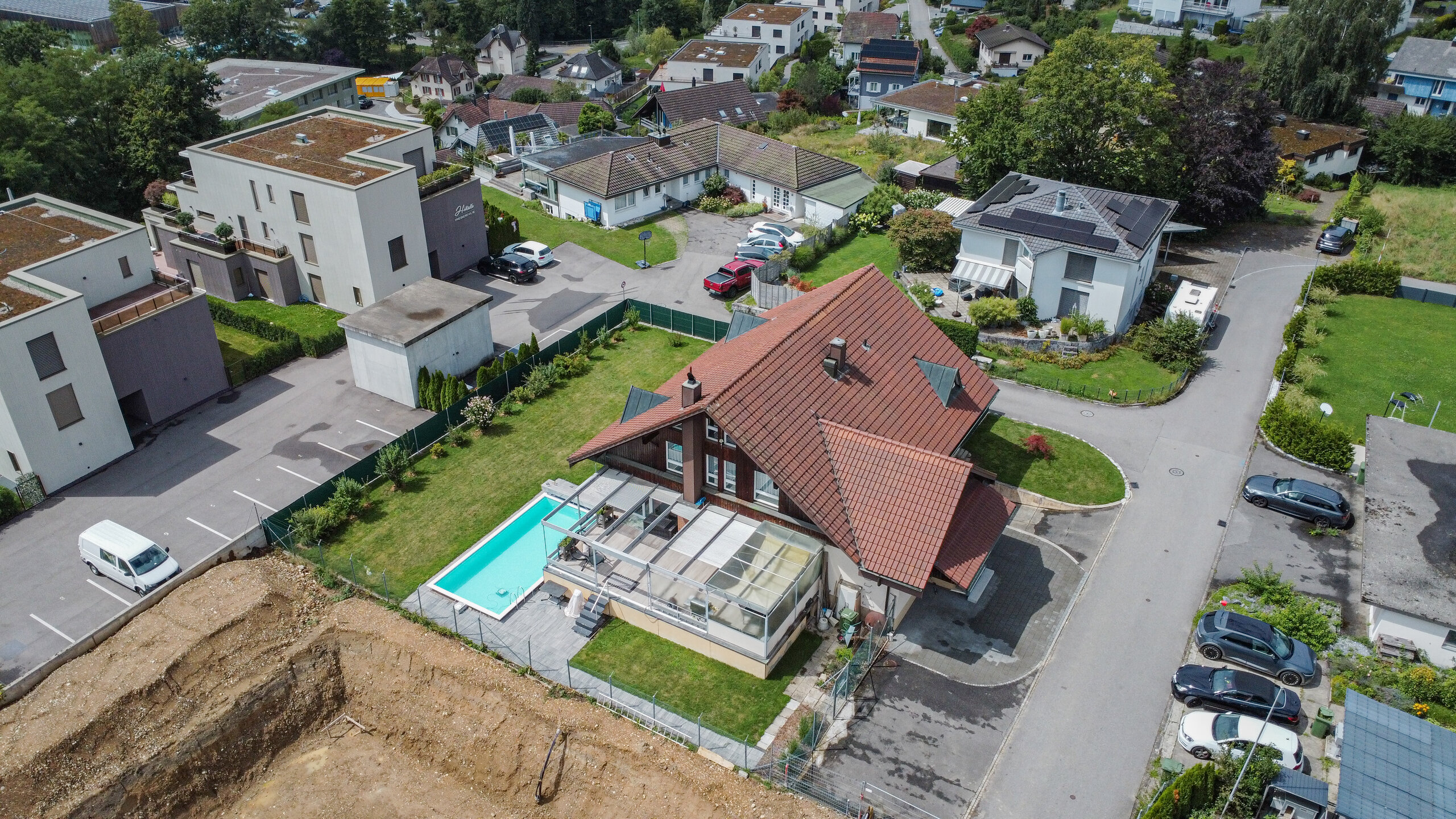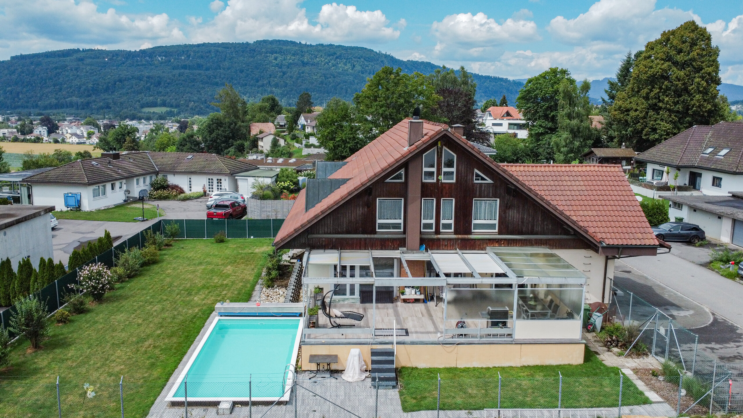 Im Untergeschoss befindet sich eine 1.5-Zimmer-Einliegerwohnung, die sich perfekt für Gäste, Familienmitglieder oder auch als Büro nutzen lässt. Der weitläufige Garten begeistert mit einer gepflegten Grünfläche, einem Swimmingpool sowie einer gedeckten Terrasse – ein Paradies für Freizeit und Erholung.