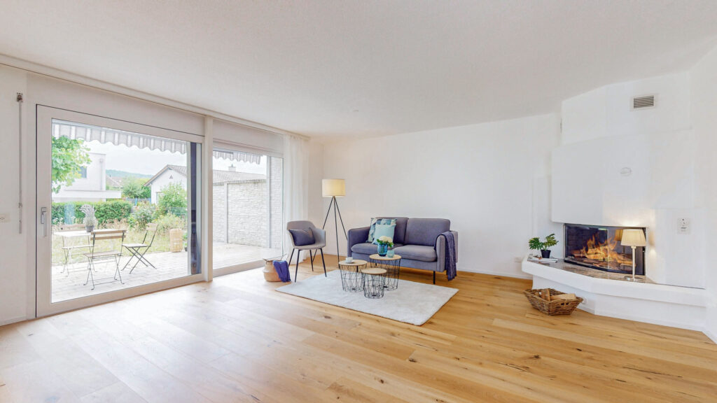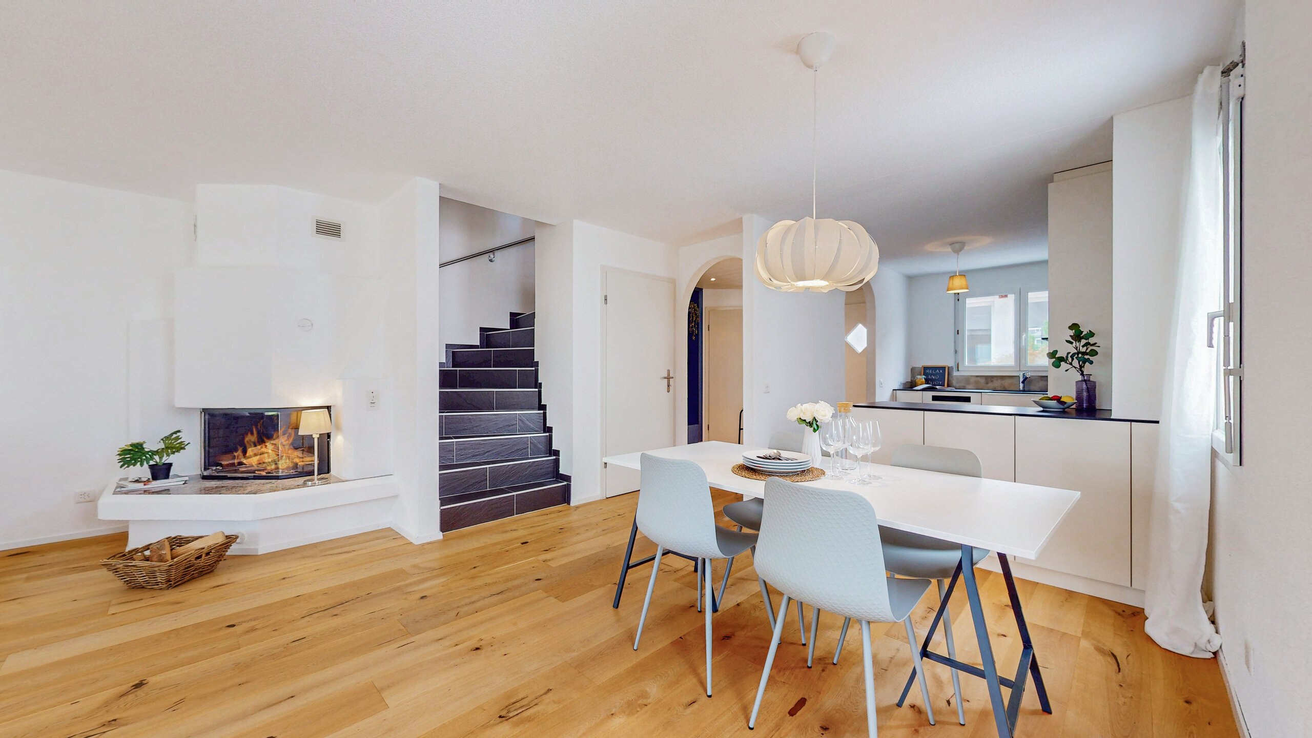 • Wohn- und Essbereich: Grosser, offener und heller Wohn- und Essbereich mit gemütlichem Cheminée und direktem Zugang zur Terrasse