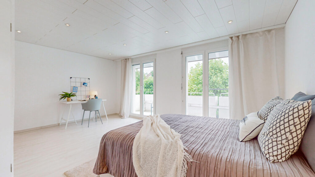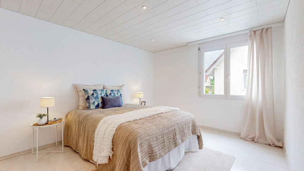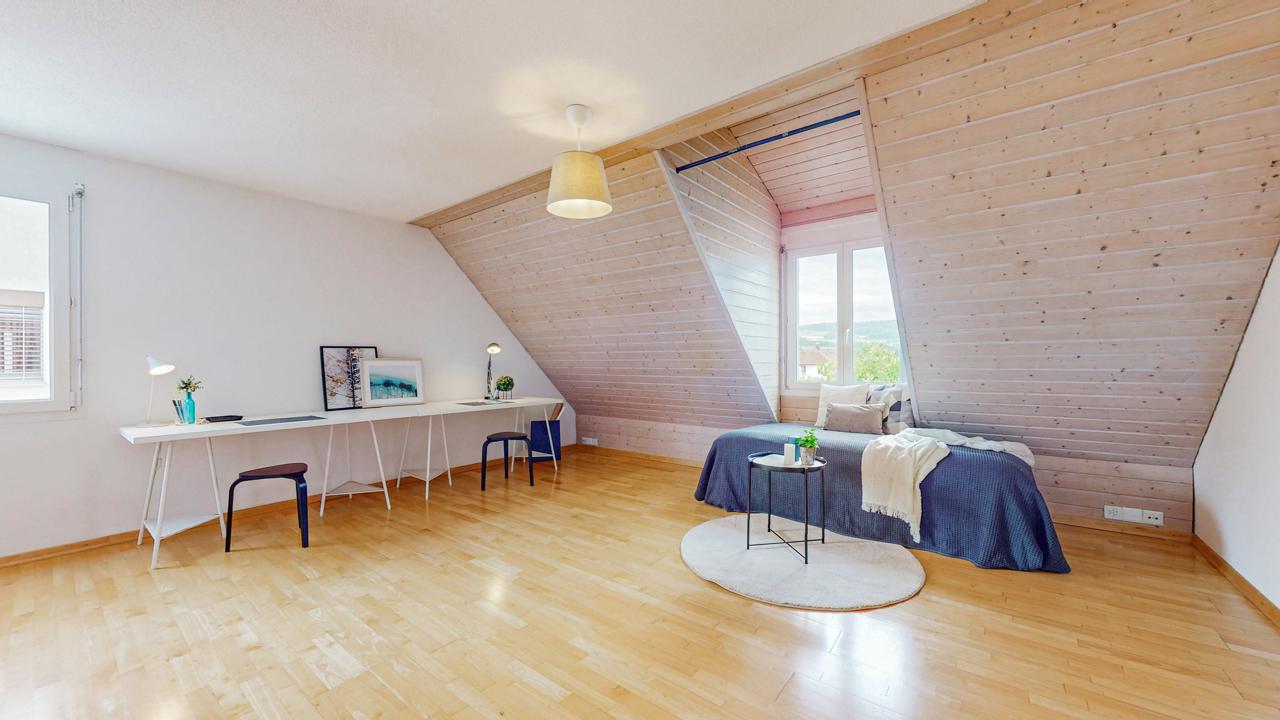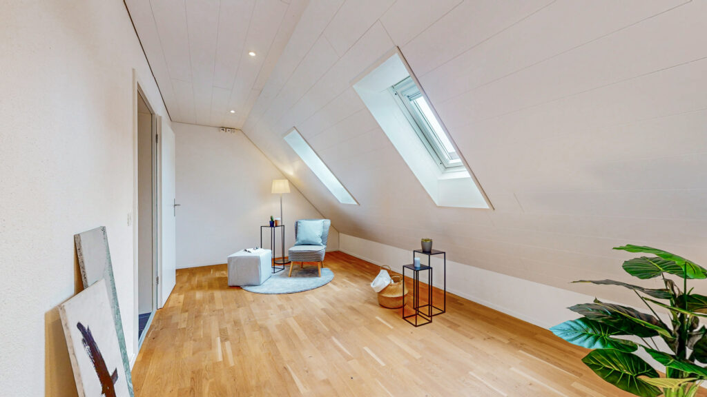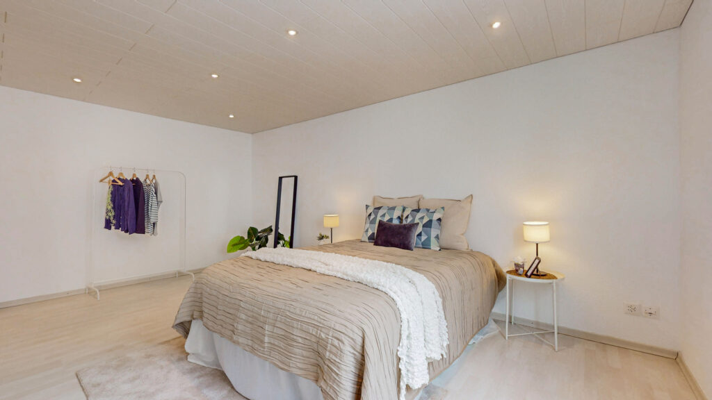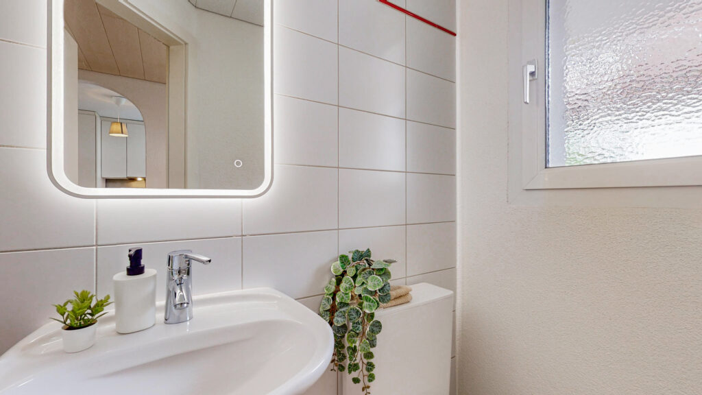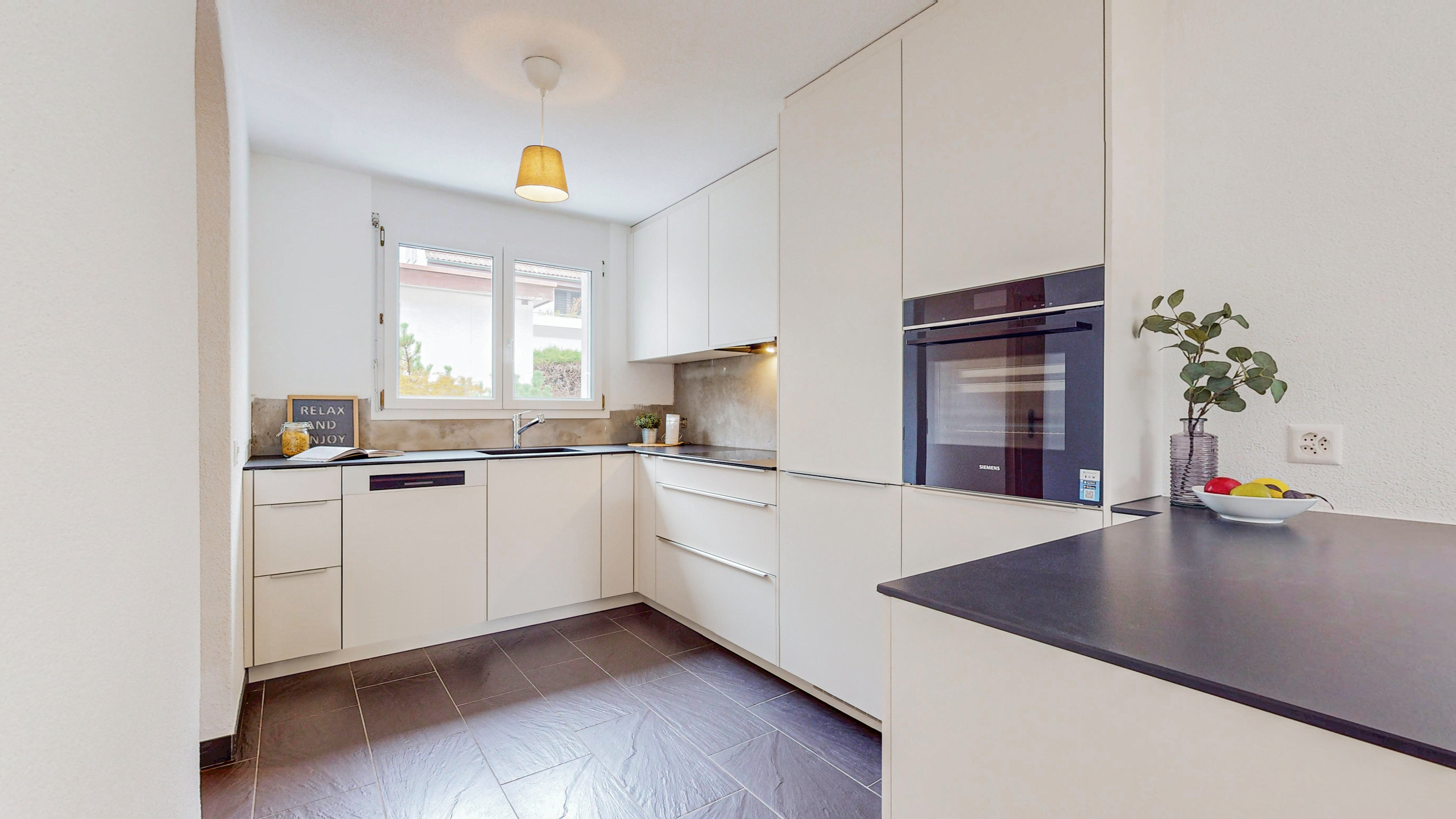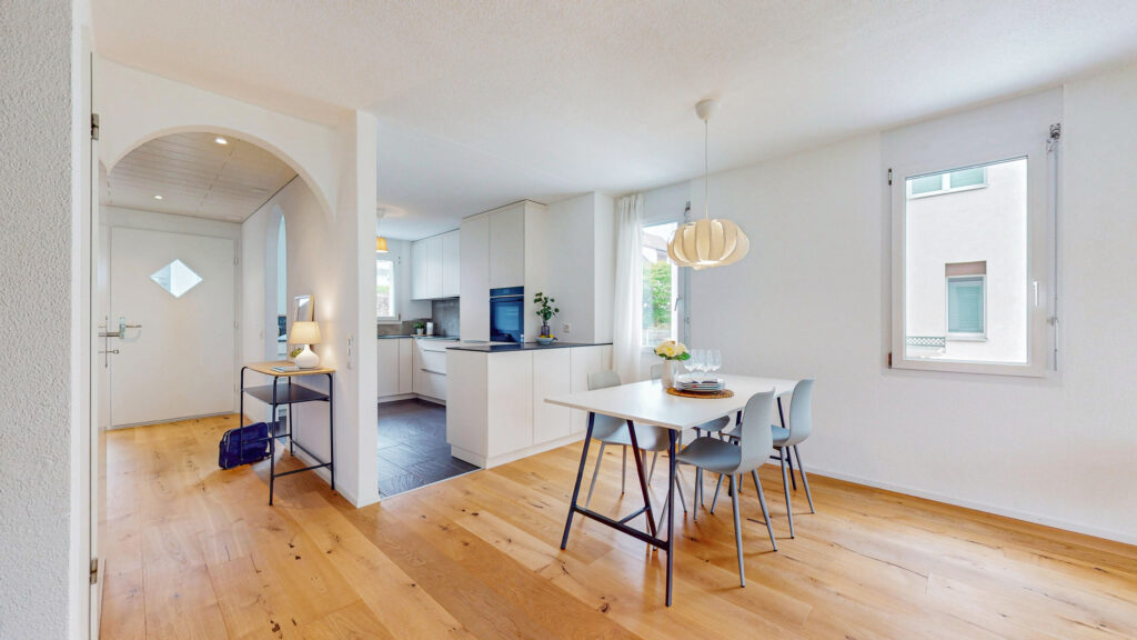 Die offene Küche bietet nicht nur viel Stauraum, sondern auch Platz für einen Esstisch, was den Raum zum kommunikativen Mittelpunkt des Hauses macht. Die Zimmer sind grosszügig und lichtdurchflutet und eignen sich ideal für Familien oder Menschen mit Bedarf an vielseitig nutzbaren Räumen. Drei moderne Nassbereiche – eine Dusche mit WC, ein separates Bad sowie eine Gästetoilette – sorgen für hohen Wohnkomfort.