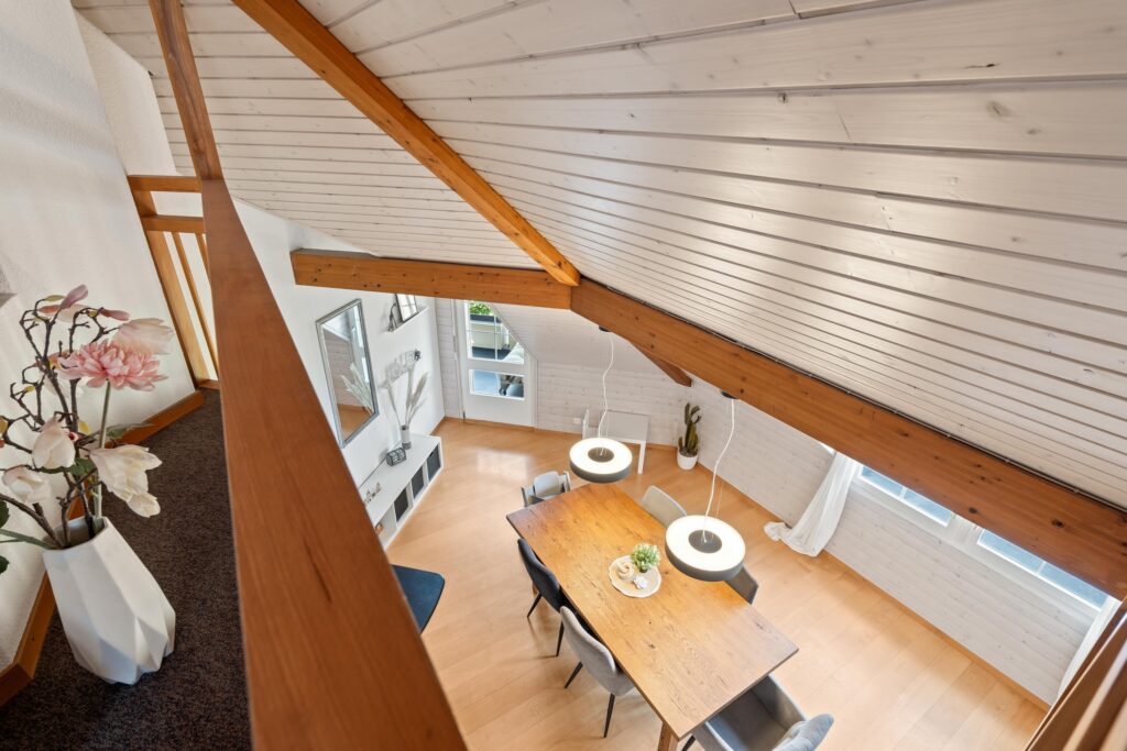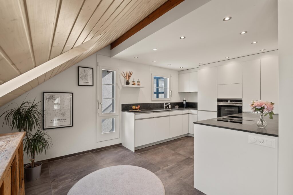 Der offene Wohn- und Essbereich bietet einen herrlichen Blick ins Grüne und auf die Stockhornkette, während die sichtbare Holzkonstruktion in Kombination mit weissen Wänden für eine warme und moderne Wohnatmosphäre sorgt. Die offene Wohnküche wurde 2020 hochwertig eingebaut und lässt keine Wünsche offen.