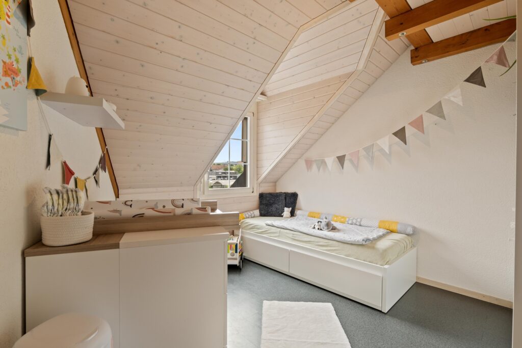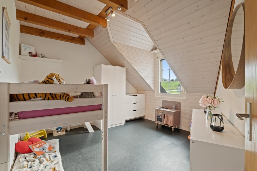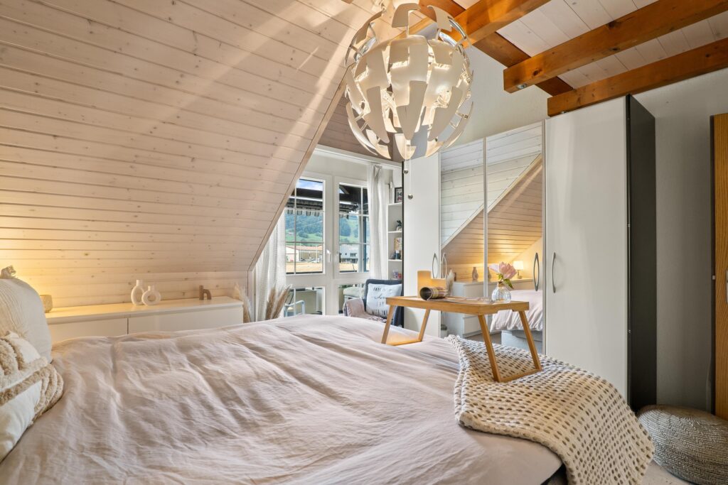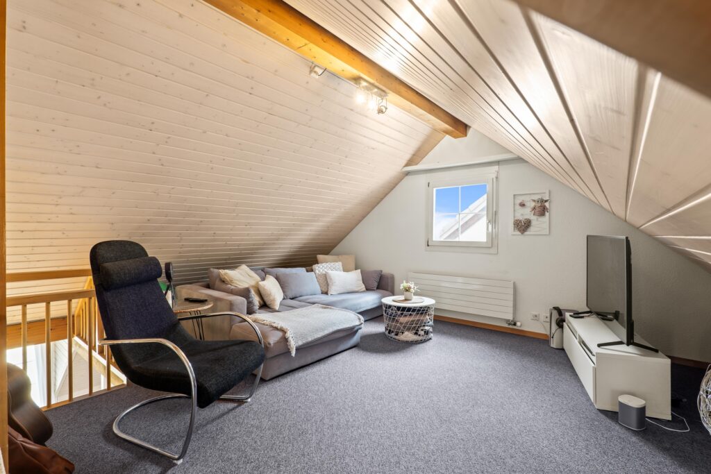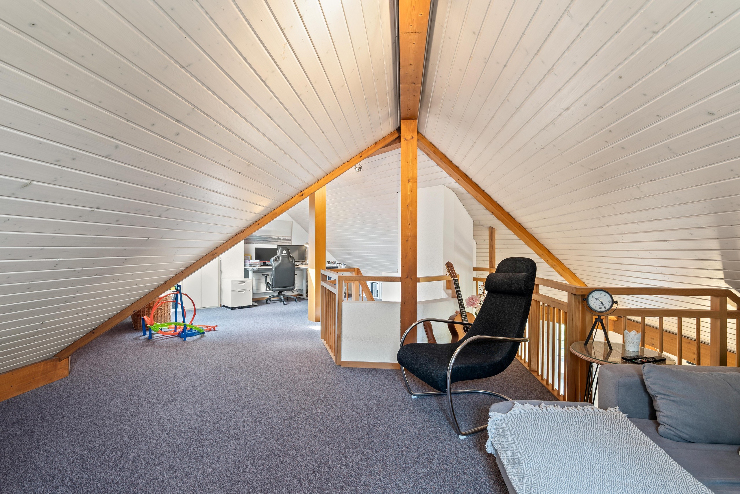 Ein besonderes Highlight ist die Galerie im Dach, die vielseitige Nutzungsmöglichkeiten eröffnet – sei es als Rückzugsort, Büro oder Spielbereich. Der sehr grosse, gedeckte Balkon lädt zum Entspannen ein und bietet eine traumhafte Sicht auf den Gantrisch und die umliegende Bergwelt.