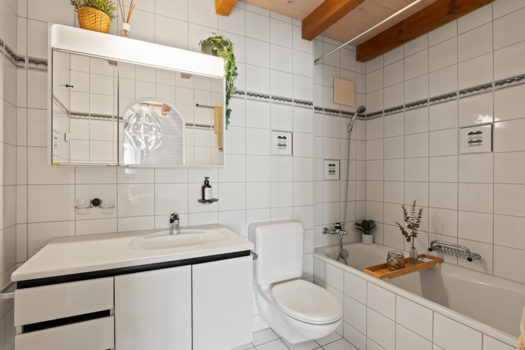 • Materialien: Gelungene Mischung zwischen sichtbarer Holzkonstruktion und weissen Wänden