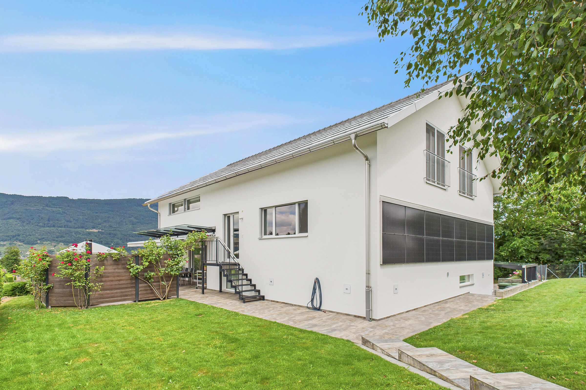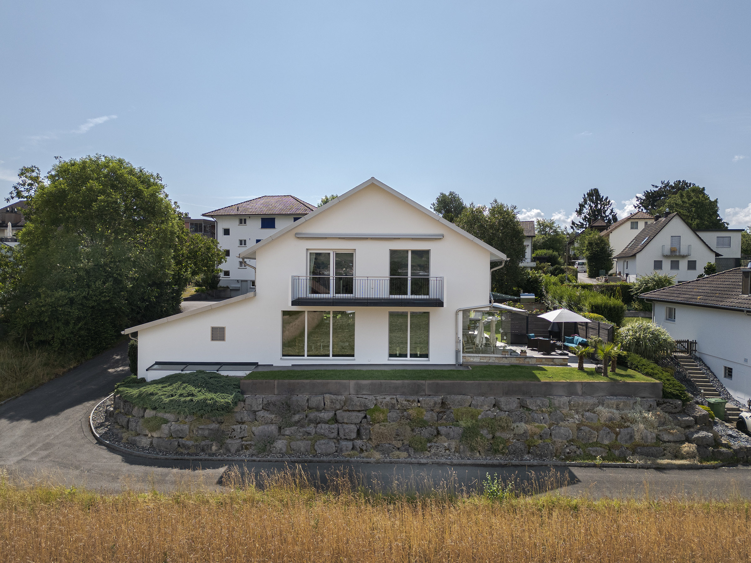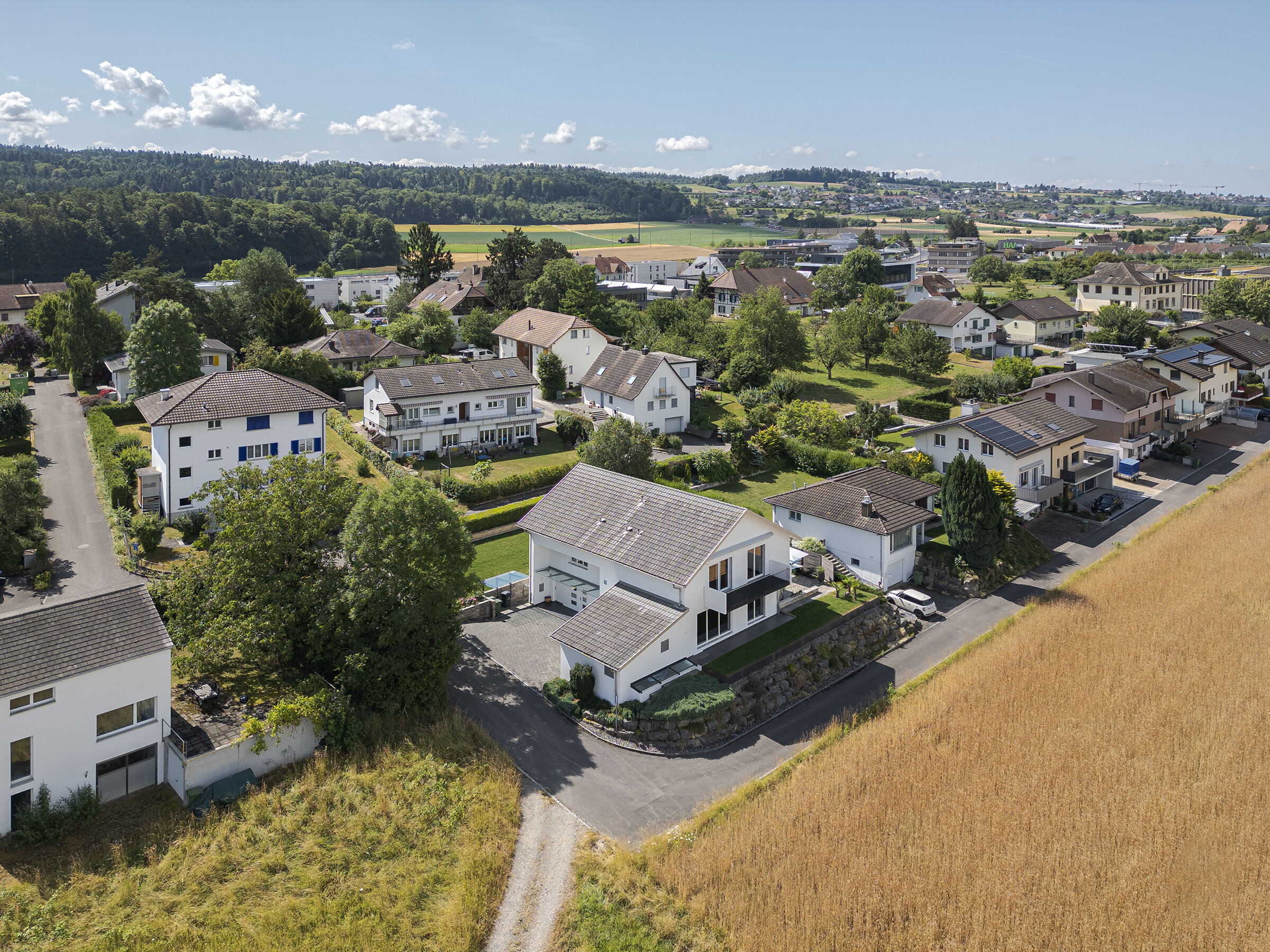 Dieses freistehende Einfamilienhaus begeistert mit einer Gesamtnutzfläche von 352 m² und einer flexiblen Aufteilung, die sowohl als Ein- wie auch als Zweifamilienhaus genutzt werden kann. Die ruhige Lage mit unverbaubarer Seesicht, geschützt durch die angrenzende Landwirtschaftszone, macht diese Liegenschaft zu einem einzigartigen Zuhause mit hoher Lebensqualität.
