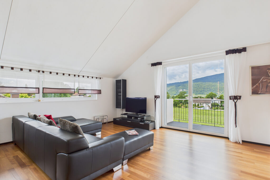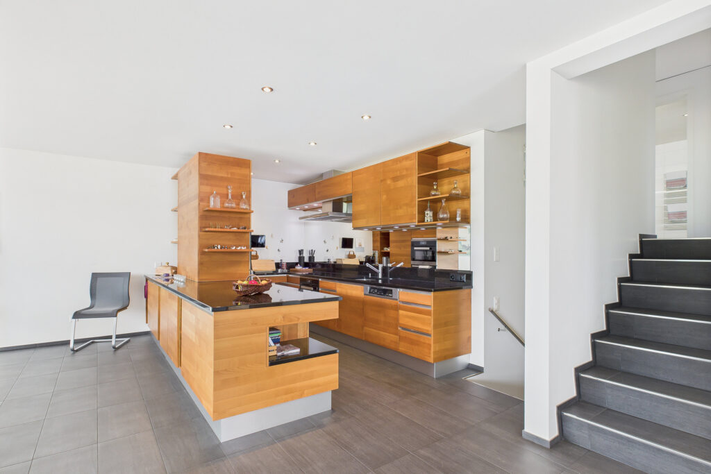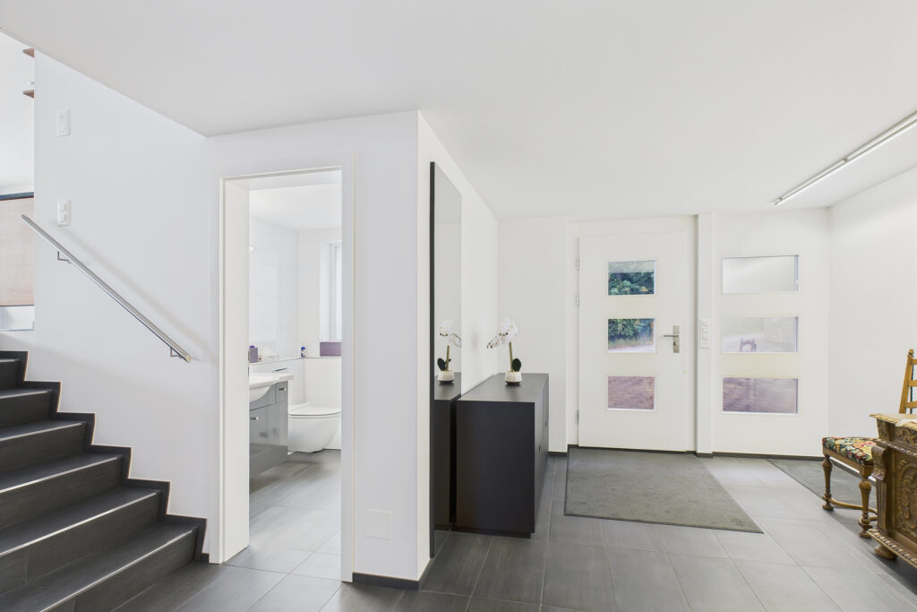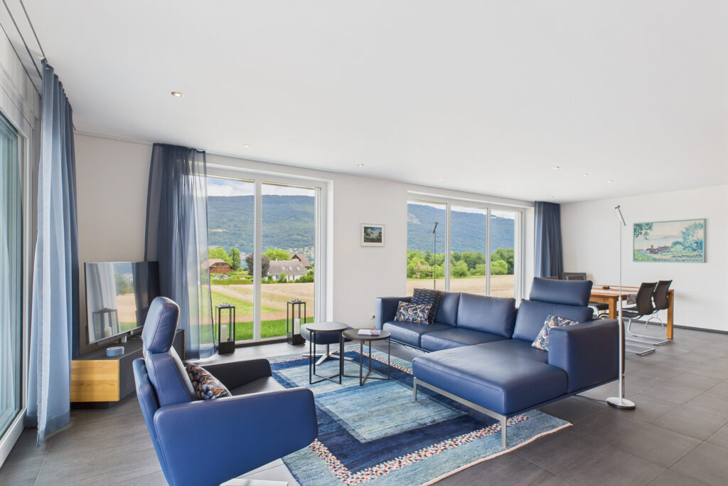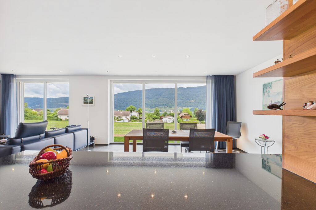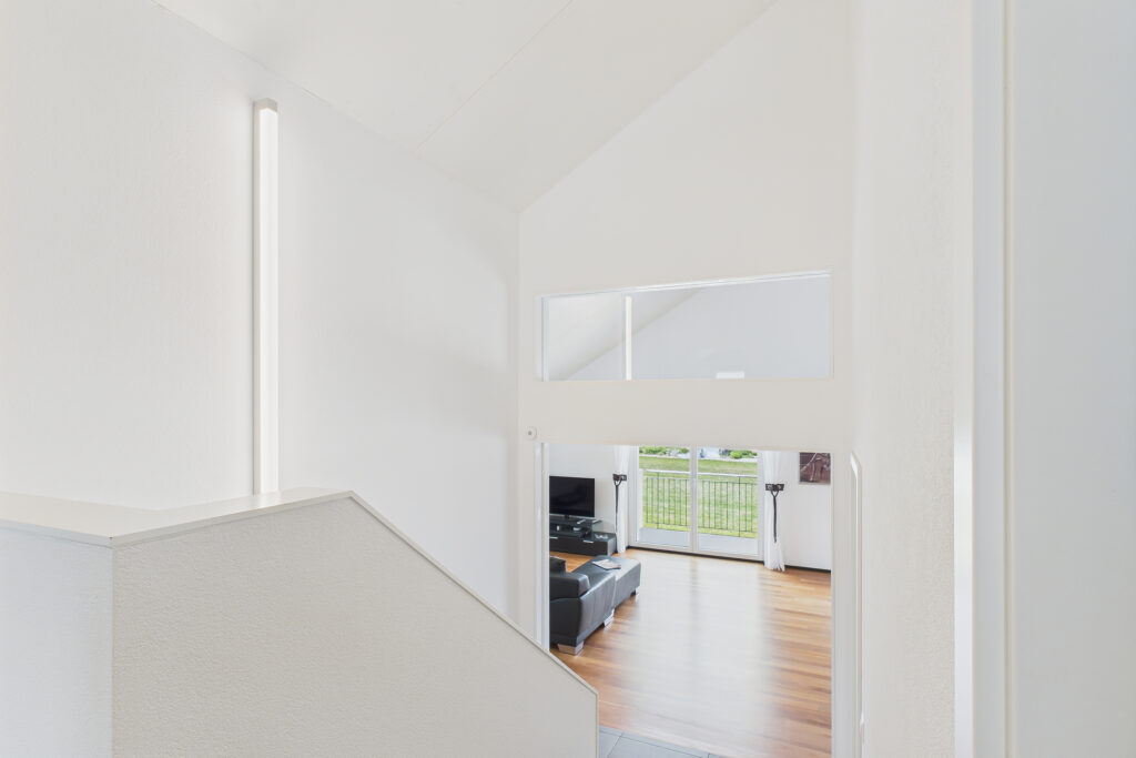 Die 250 m² Wohnfläche verteilen sich auf insgesamt 7.5 Zimmer. Zwei grosszügige Wohn- und Essbereiche sorgen für besondere Freiräume – im Erdgeschoss mit direktem Zugang zur Terrasse und im Obergeschoss mit Zugang zum Balkon. Die bodentiefen Fenster durchfluten die Räume mit Licht und unterstreichen die moderne, helle Innenausstattung, die mit hochwertigen Materialien überzeugt.